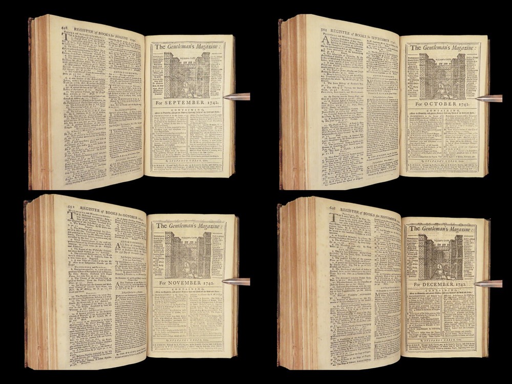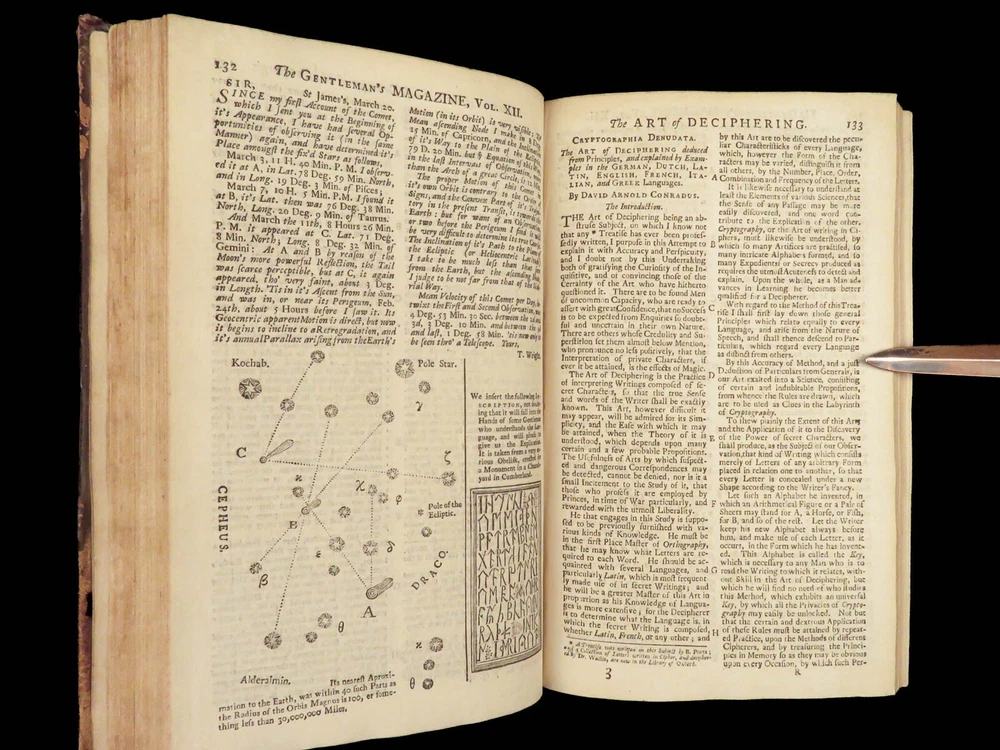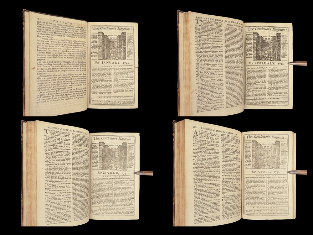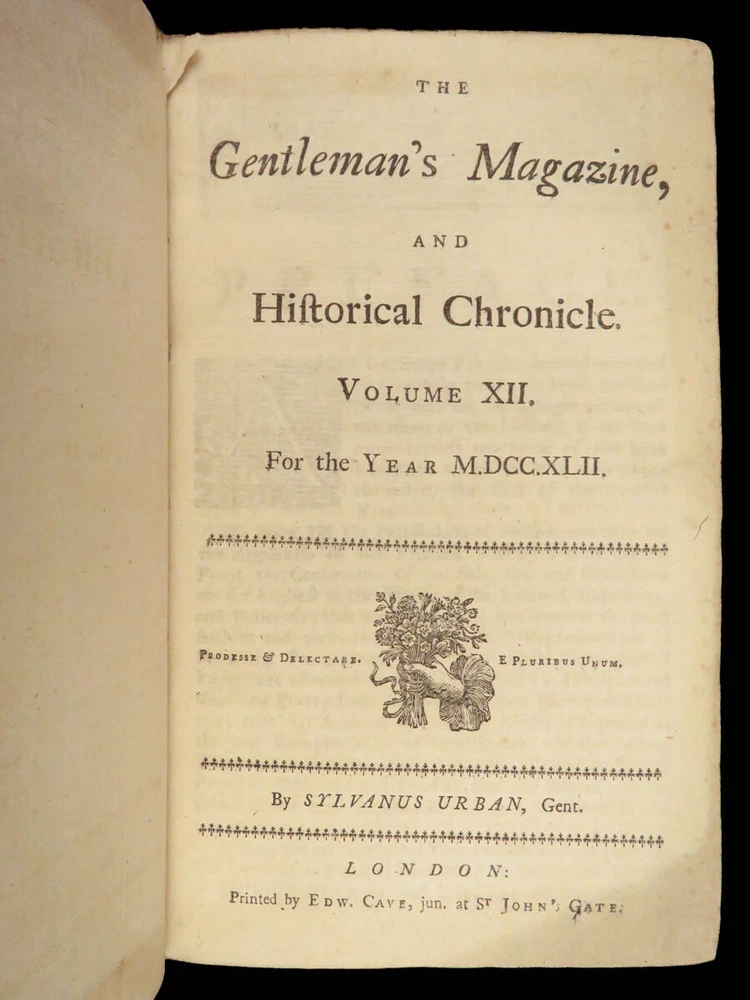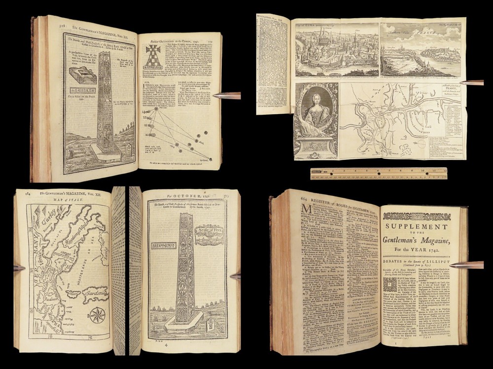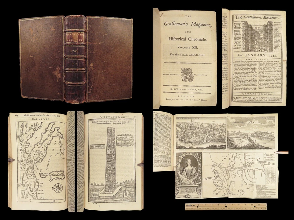 1742 Cryptographia Conradus Halde CHINA Italy PRAGUE Egra Map Comets Astronomy A fine 18 th -century printing of the Gentleman’s Magazine! The Gentleman’s Magazine was an English periodical which first appeared in 1731. It was published without interruption for nearly 200 years and was the first of its kind to use the term ‘magazine’. It was published by Edward Cave, pseud. Sylvanus Urban. This 1742 edition includes a variety of important and interesting contents including: · Printing of ‘Cryptographia, Art of Deciphering’ by David Arnold Conradus · Excerpts from Jean-Baptiste du Halde’s ‘History of China’ · Reports of comets and astronomical phenomena · Discussions and view of Bewcastle Cumberland obelisk / ruins · War of Austrian Succession: Conflict in Moravia Item number: #26914 Price: $599 URBAN, Sylvanus [Edward Cave] The Gentleman’s Magazine: and historical Chronicle, vol xii London: printed for E. Cave, 1742. First edition. Details : · Collation: complete o iv, 699, [17] o Several in-text illustrations throughout o Includes folding engraving of Prague · Language: English · Provenance: Armorial bookplate – Thomas Langton Esq r ; Teeton, Northamptonshire · Binding: Leather; secure · Size : ~8.5in X 5.25in (21.5cm x 13.5cm) Our Guarantee: Very Fast. Very Safe. Free Shipping Worldwide. Customer satisfaction is our priority! Notify us with 7 days of receiving, and we will offer a full refund without reservation! 26914