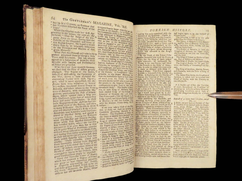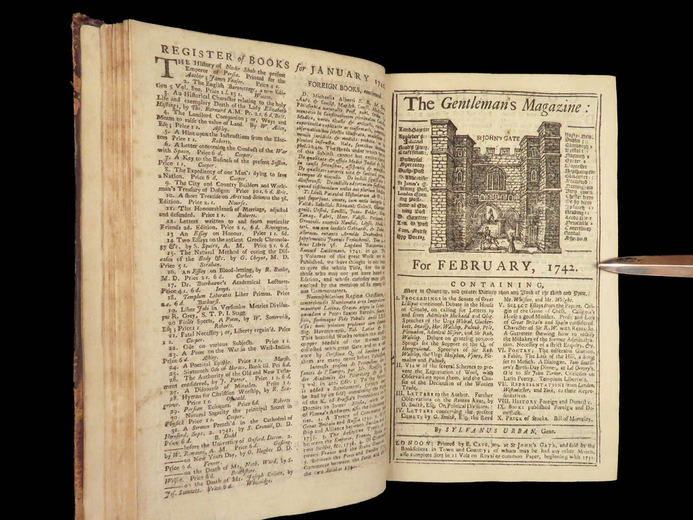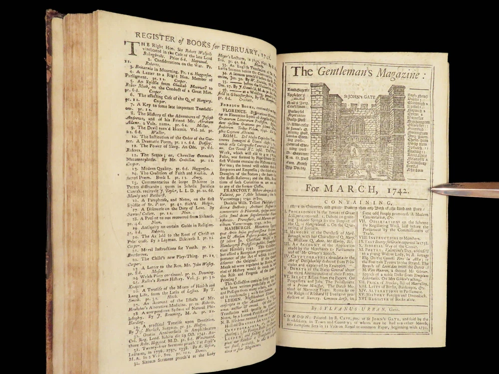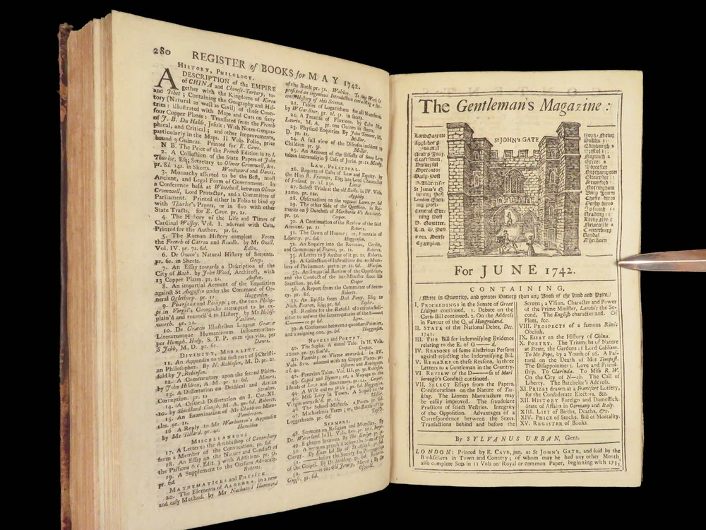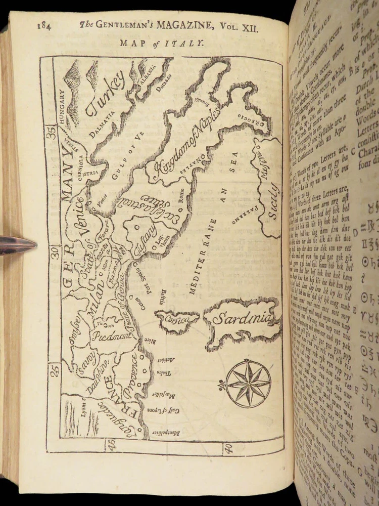 1742 Cryptographia Conradus Halde CHINA Italy PRAGUE Egra Map Comets Astronomy A fine 18 th -century printing of the Gentleman’s Magazine! The Gentleman’s Magazine was an English periodical which first appeared in 1731. It was published without interruption for nearly 200 years and was the first of its kind to use the term ‘magazine’. It was published by Edward Cave, pseud. Sylvanus Urban. This 1742 edition includes a variety of important and interesting contents including: · Printing of ‘Cryptographia, Art of Deciphering’ by David Arnold Conradus · Excerpts from Jean-Baptiste du Halde’s ‘History of China’ · Reports of comets and astronomical phenomena · Discussions and view of Bewcastle Cumberland obelisk / ruins · War of Austrian Succession: Conflict in Moravia Item number: #26914 Price: $599 URBAN, Sylvanus [Edward Cave] The Gentleman’s Magazine: and historical Chronicle, vol xii London: printed for E. Cave, 1742. First edition. Details : · Collation: complete o iv, 699, [17] o Several in-text illustrations throughout o Includes folding engraving of Prague · Language: English · Provenance: Armorial bookplate – Thomas Langton Esq r ; Teeton, Northamptonshire · Binding: Leather; secure · Size : ~8.5in X 5.25in (21.5cm x 13.5cm) Our Guarantee: Very Fast. Very Safe. Free Shipping Worldwide. Customer satisfaction is our priority! Notify us with 7 days of receiving, and we will offer a full refund without reservation! 26914