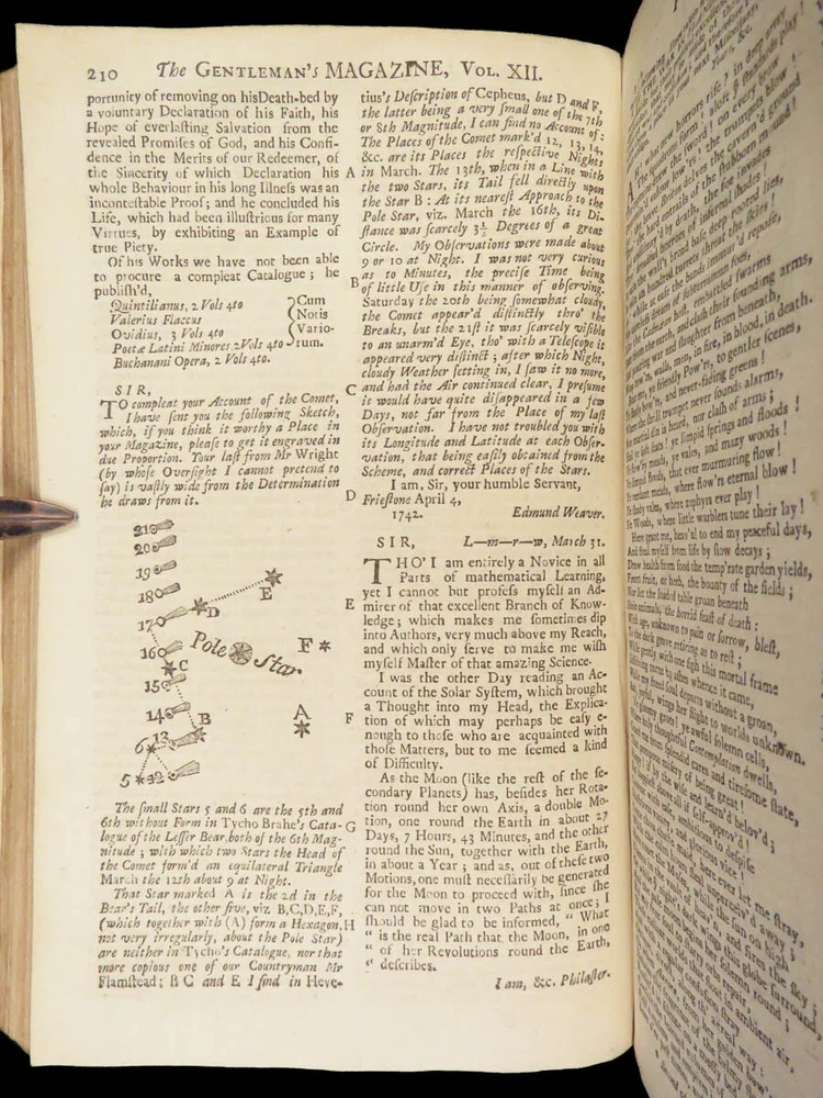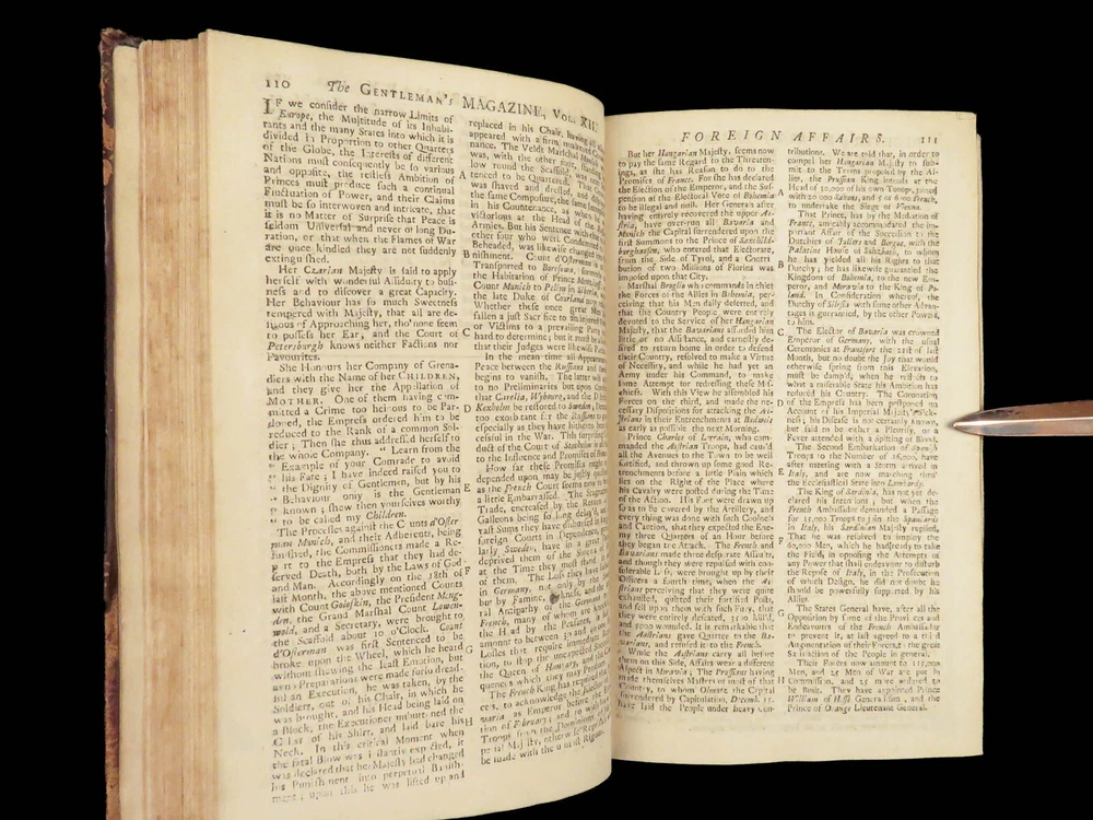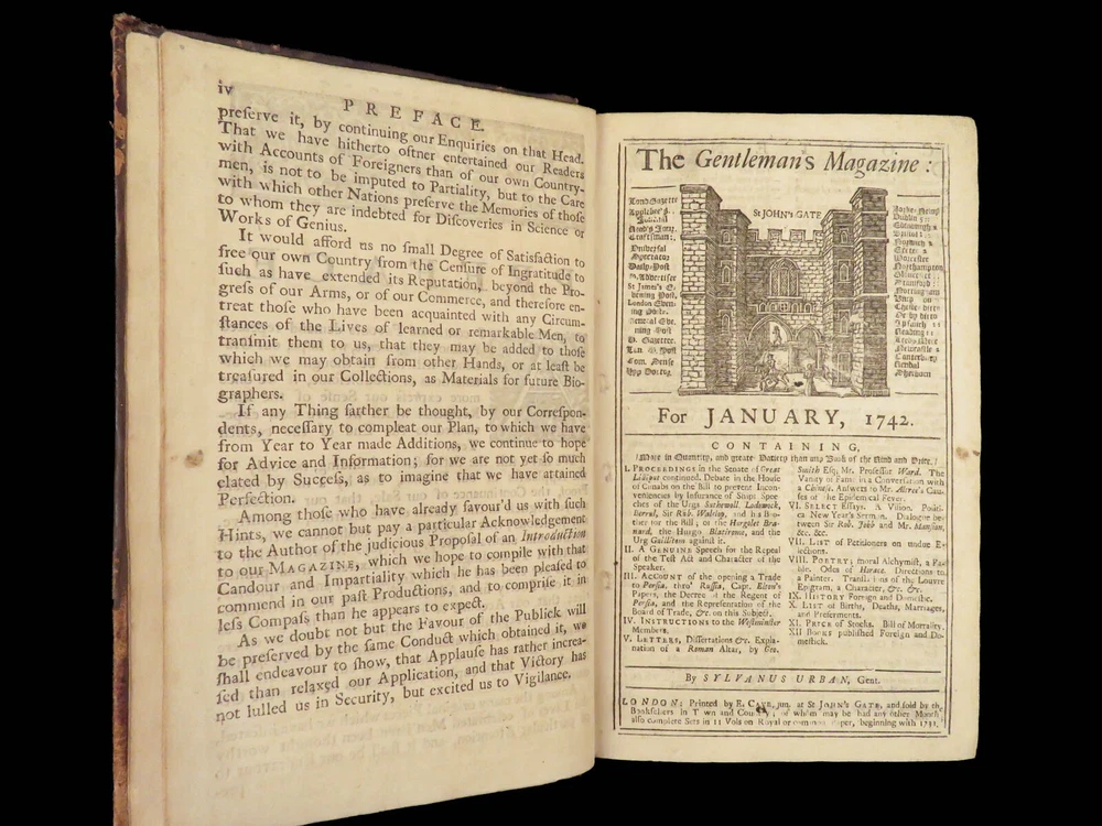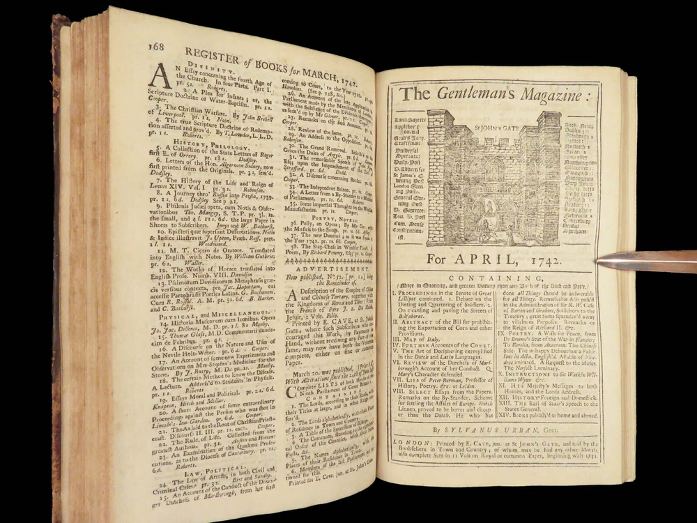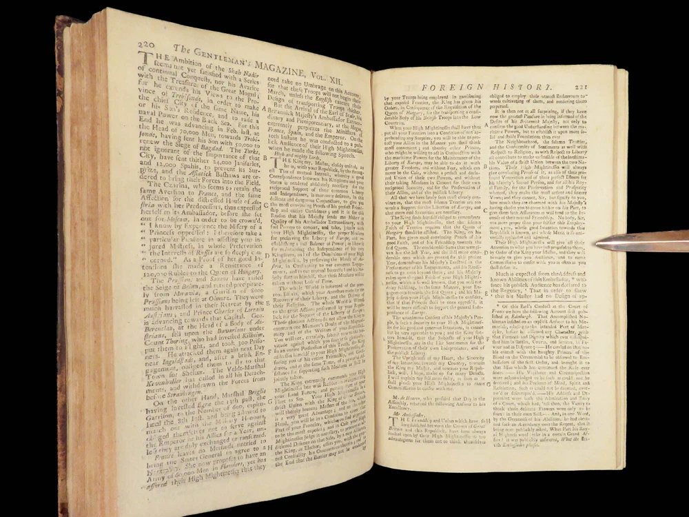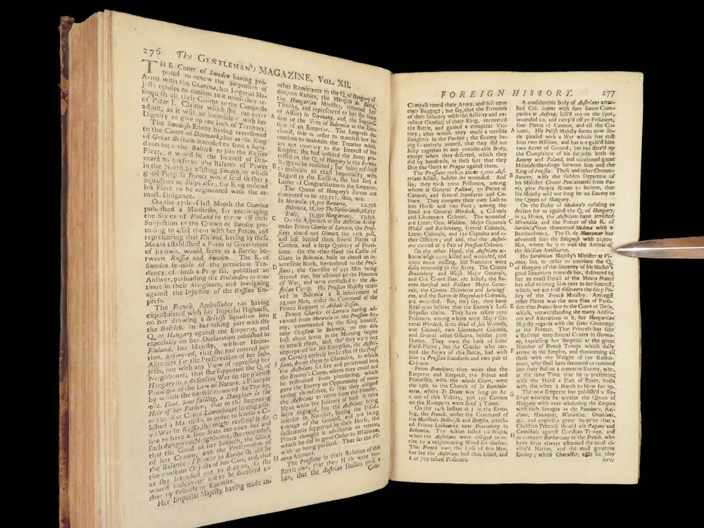 1742 Cryptographia Conradus Halde CHINA Italy PRAGUE Egra Map Comets Astronomy A fine 18 th -century printing of the Gentleman’s Magazine! The Gentleman’s Magazine was an English periodical which first appeared in 1731. It was published without interruption for nearly 200 years and was the first of its kind to use the term ‘magazine’. It was published by Edward Cave, pseud. Sylvanus Urban. This 1742 edition includes a variety of important and interesting contents including: · Printing of ‘Cryptographia, Art of Deciphering’ by David Arnold Conradus · Excerpts from Jean-Baptiste du Halde’s ‘History of China’ · Reports of comets and astronomical phenomena · Discussions and view of Bewcastle Cumberland obelisk / ruins · War of Austrian Succession: Conflict in Moravia Item number: #26914 Price: $599 URBAN, Sylvanus [Edward Cave] The Gentleman’s Magazine: and historical Chronicle, vol xii London: printed for E. Cave, 1742. First edition. Details : · Collation: complete o iv, 699, [17] o Several in-text illustrations throughout o Includes folding engraving of Prague · Language: English · Provenance: Armorial bookplate – Thomas Langton Esq r ; Teeton, Northamptonshire · Binding: Leather; secure · Size : ~8.5in X 5.25in (21.5cm x 13.5cm) Our Guarantee: Very Fast. Very Safe. Free Shipping Worldwide. Customer satisfaction is our priority! Notify us with 7 days of receiving, and we will offer a full refund without reservation! 26914