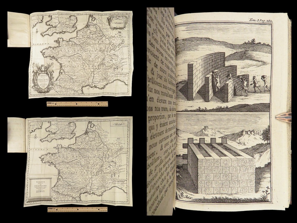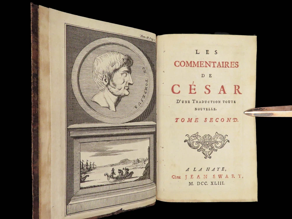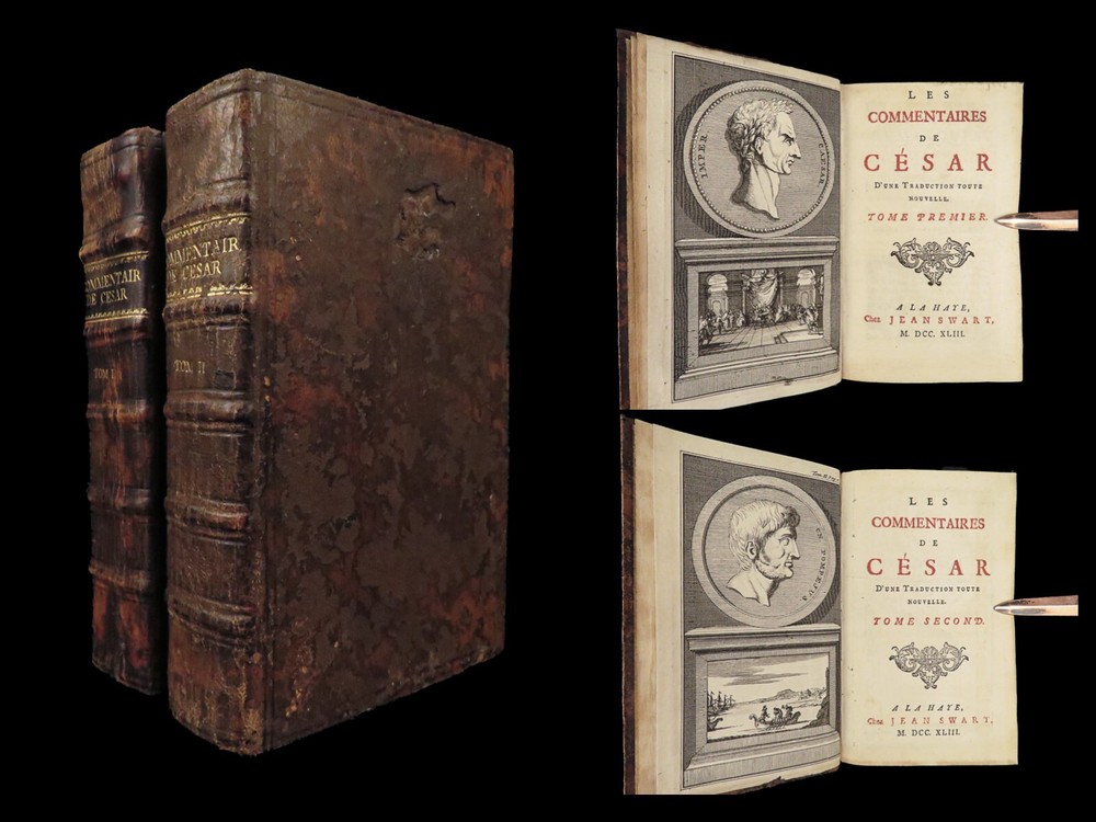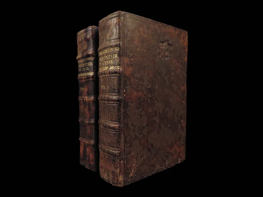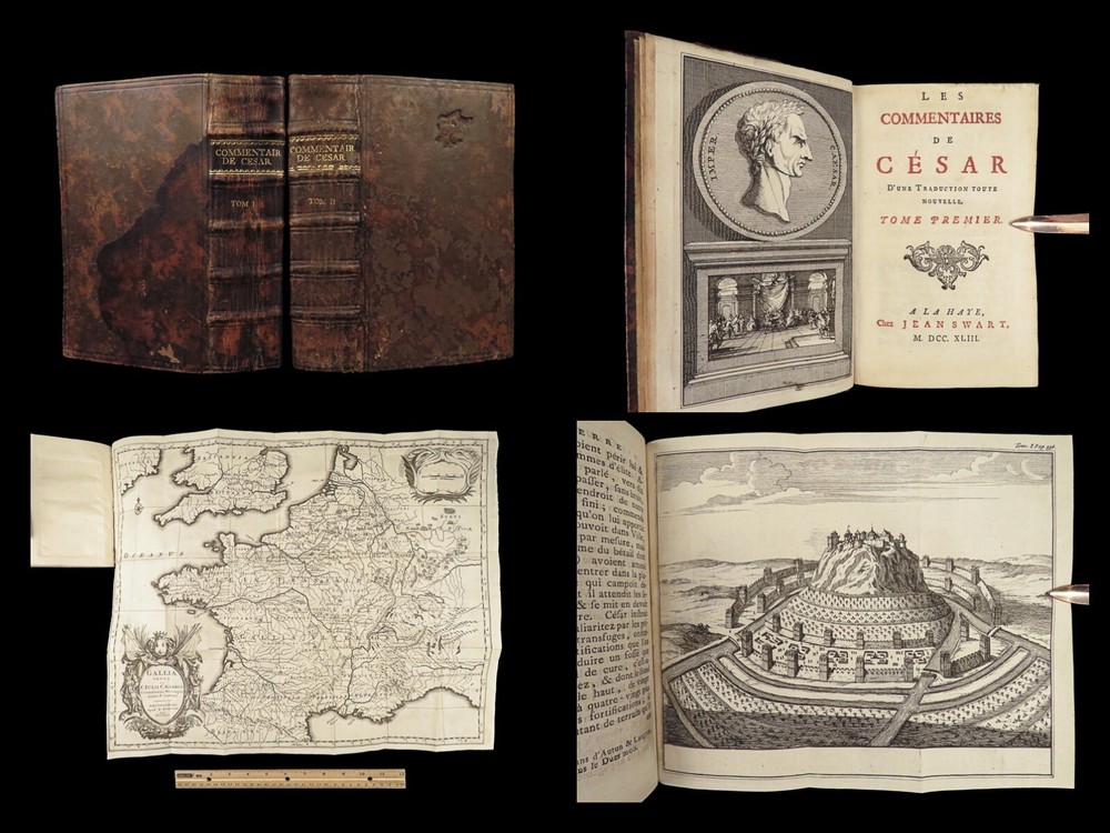 1743 Julius Caesar 1 ed WAR Commentaries Military Tactics Hirtius Bellum MAPS 2v “If you must break the law, do it to seize power: in all other cases observe it!” – Julius Caesar A rare collection of civil war histories and Julius Caesar war commentaries! Julius Caesar’s war commentaries are some of the most prolific military writings! While not specifically known for his writing, Julius Caesar wrote this book which would become a mainstay in the Latin literature canon. It focuses on first-hand account of Julius Caesar in the Callic wars, but it was written as though from a third-person view. This rare 1763 French edition was edited and translated by Perrot d’Ablancourt and includes the highly coveted folding map and illustrations! Item number: #27887 Price: $750 CAESAR, Julius Les commentaires de cesar d’une traduction toute nouvelle A La Hate: Chez Jean Swart, 1743. First edition. Details : · Collation: Complete with all pages; 2 volumes o Vol. I – [2], CLIV, [2], 412 o Vol. II – [2], 514, [38] o 12 illustrated plates + 2 maps · References: Lowndes 345-46; DNB XVI, p. 391 · Language: French · Binding: Leather; tight and secure · Size: ~6.5in X 4in (16.5cm x 10cm) Our Guarantee: Very Fast. Very Safe. Free Shipping Worldwide. Customer satisfaction is our priority! Notify us with 7 days of receiving, and we will offer a full refund without reservation!