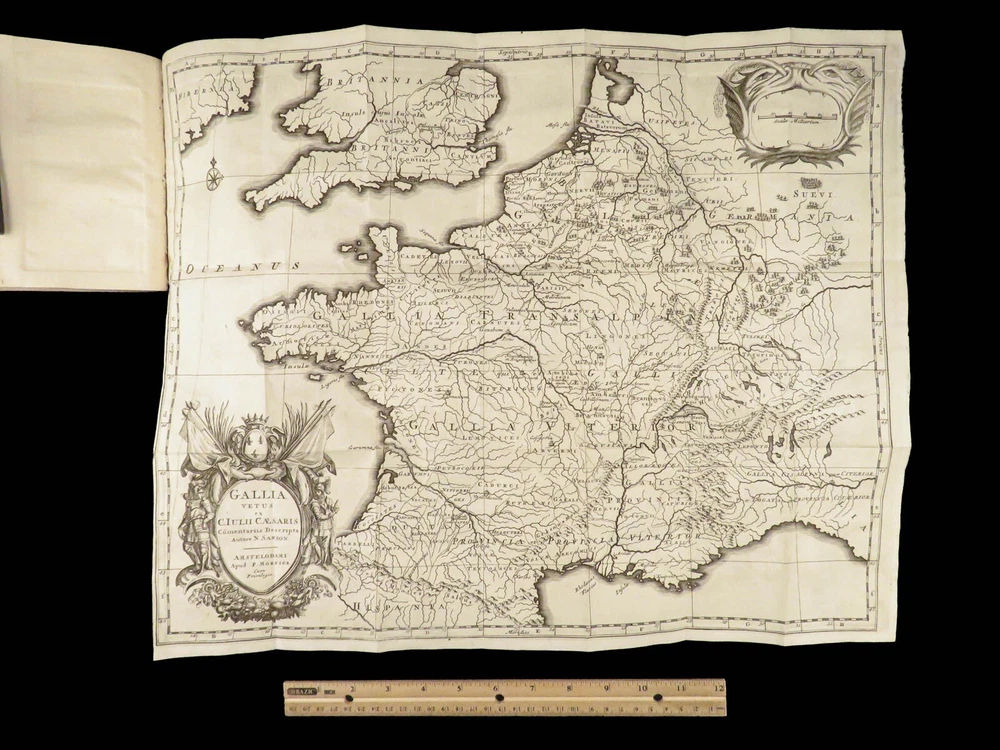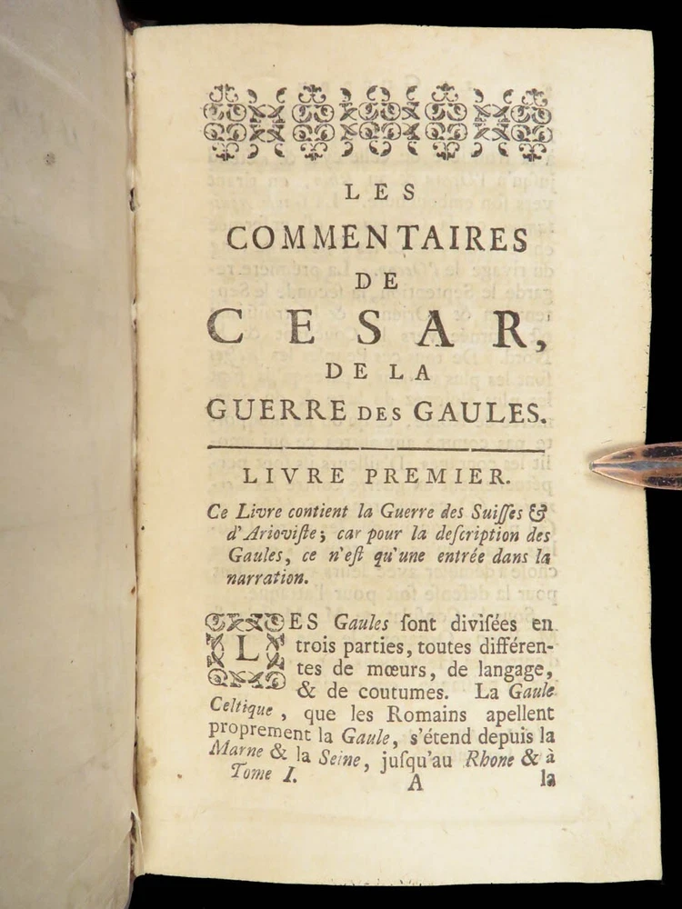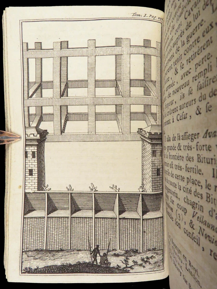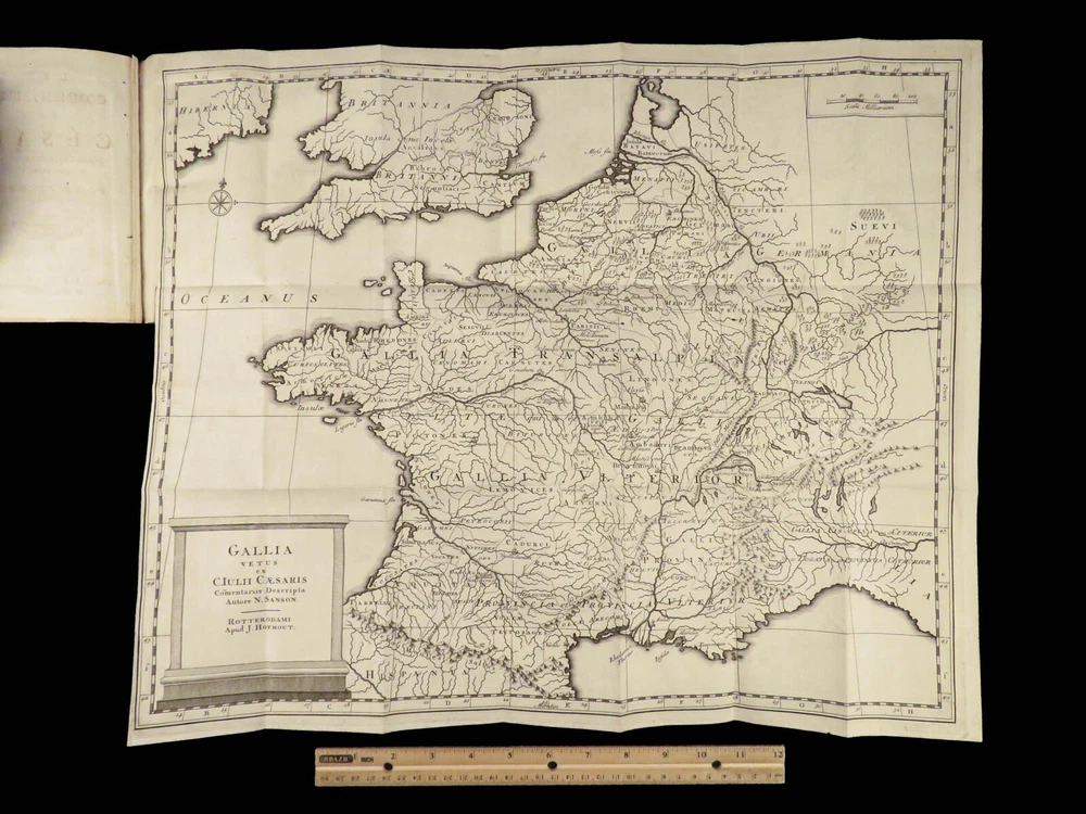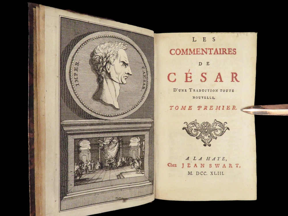 1743 Julius Caesar 1 ed WAR Commentaries Military Tactics Hirtius Bellum MAPS 2v “If you must break the law, do it to seize power: in all other cases observe it!” – Julius Caesar A rare collection of civil war histories and Julius Caesar war commentaries! Julius Caesar’s war commentaries are some of the most prolific military writings! While not specifically known for his writing, Julius Caesar wrote this book which would become a mainstay in the Latin literature canon. It focuses on first-hand account of Julius Caesar in the Callic wars, but it was written as though from a third-person view. This rare 1763 French edition was edited and translated by Perrot d’Ablancourt and includes the highly coveted folding map and illustrations! Item number: #27887 Price: $750 CAESAR, Julius Les commentaires de cesar d’une traduction toute nouvelle A La Hate: Chez Jean Swart, 1743. First edition. Details : · Collation: Complete with all pages; 2 volumes o Vol. I – [2], CLIV, [2], 412 o Vol. II – [2], 514, [38] o 12 illustrated plates + 2 maps · References: Lowndes 345-46; DNB XVI, p. 391 · Language: French · Binding: Leather; tight and secure · Size: ~6.5in X 4in (16.5cm x 10cm) Our Guarantee: Very Fast. Very Safe. Free Shipping Worldwide. Customer satisfaction is our priority! Notify us with 7 days of receiving, and we will offer a full refund without reservation!
