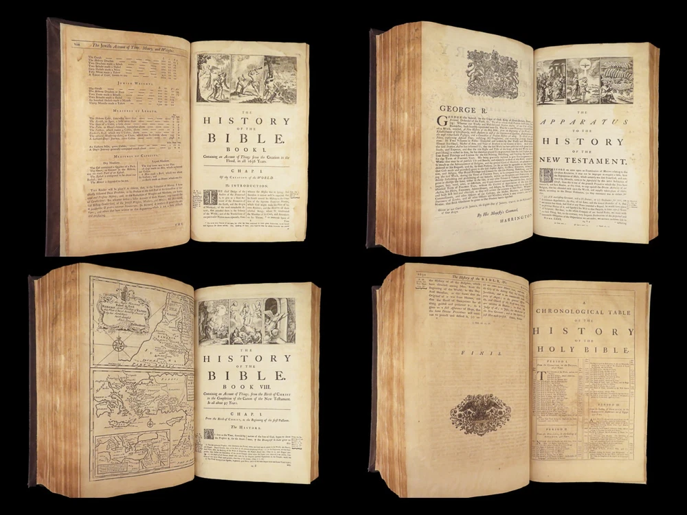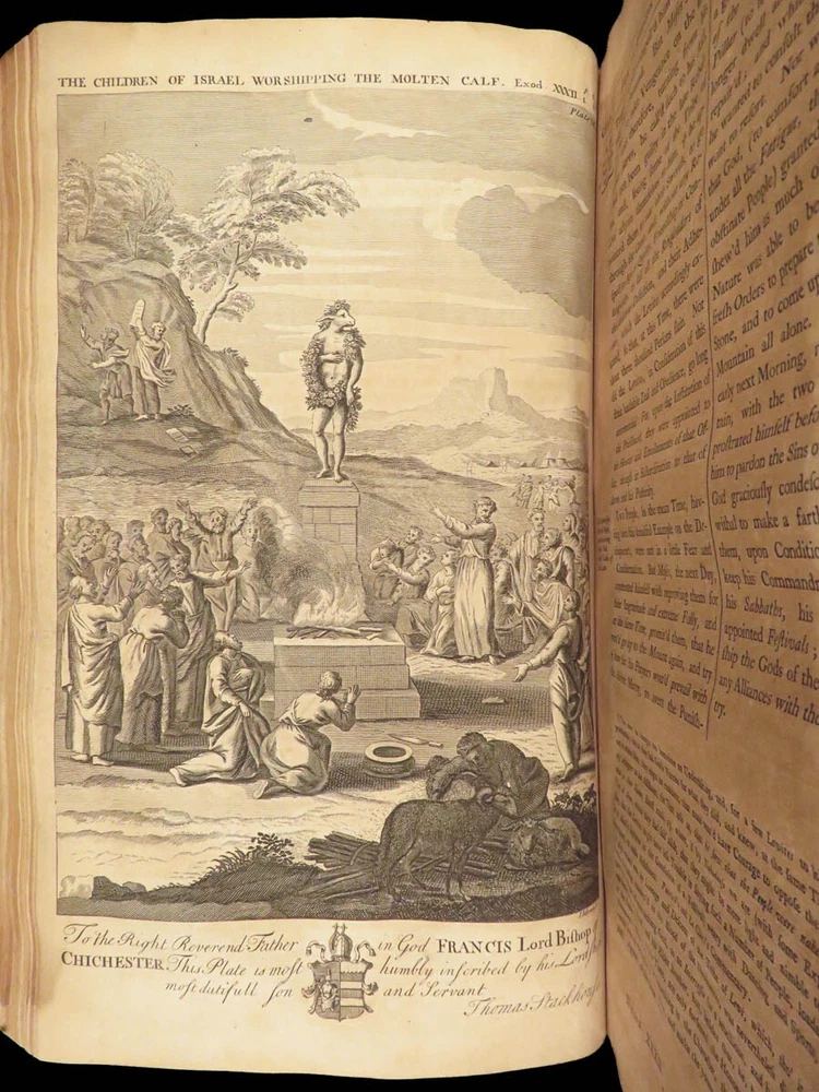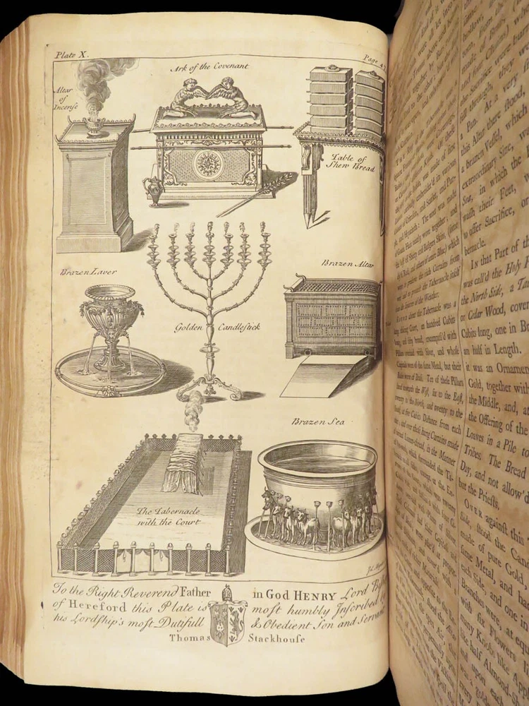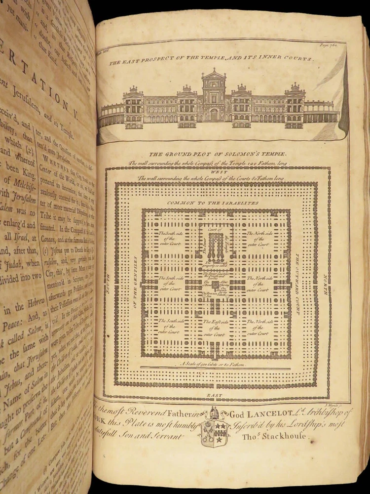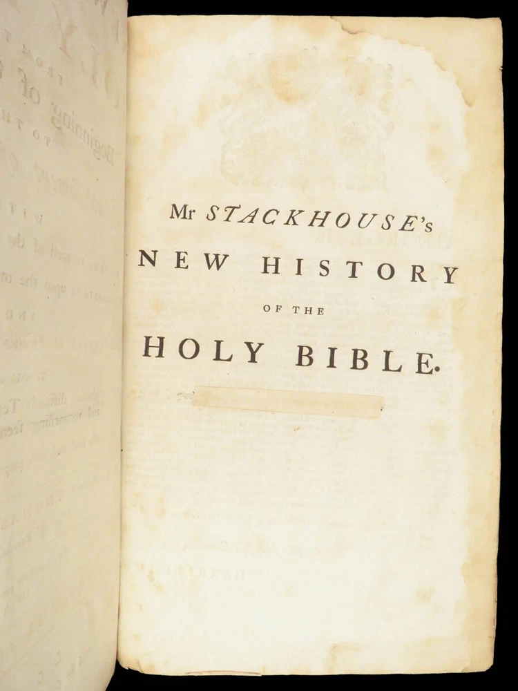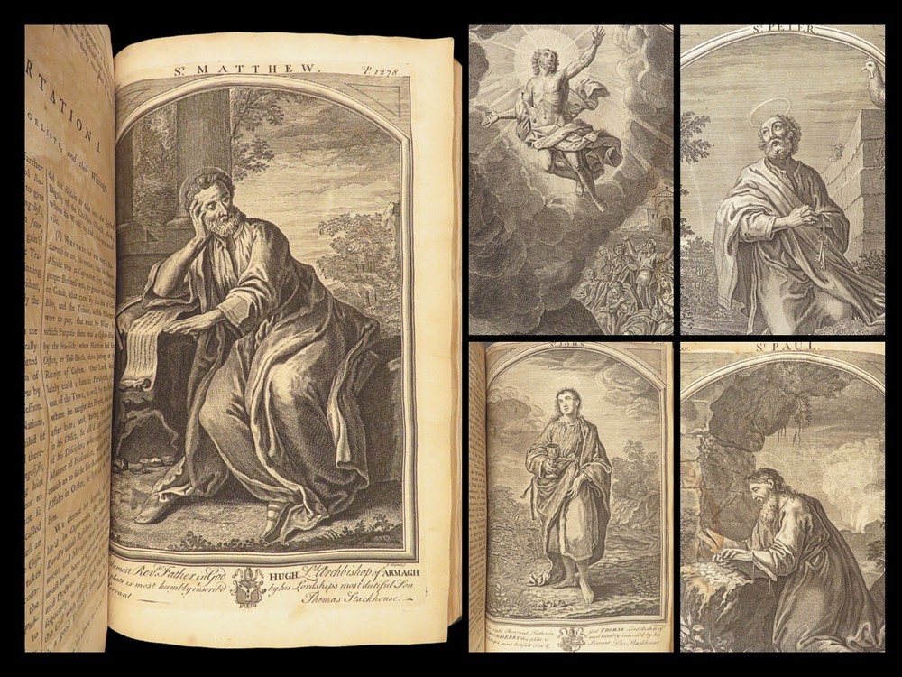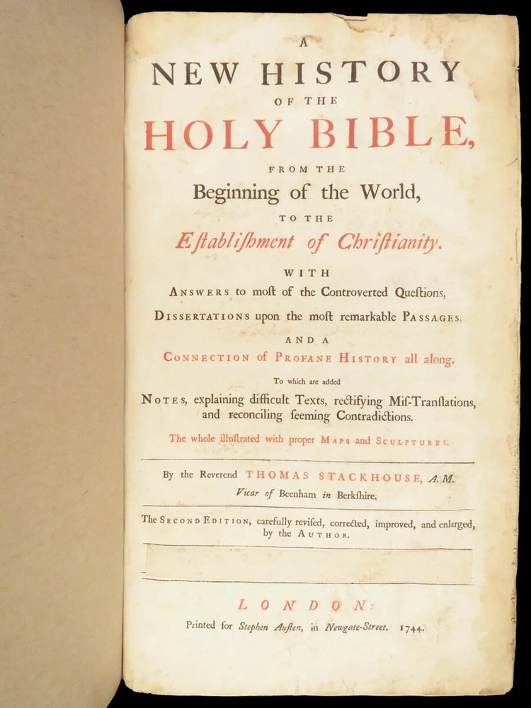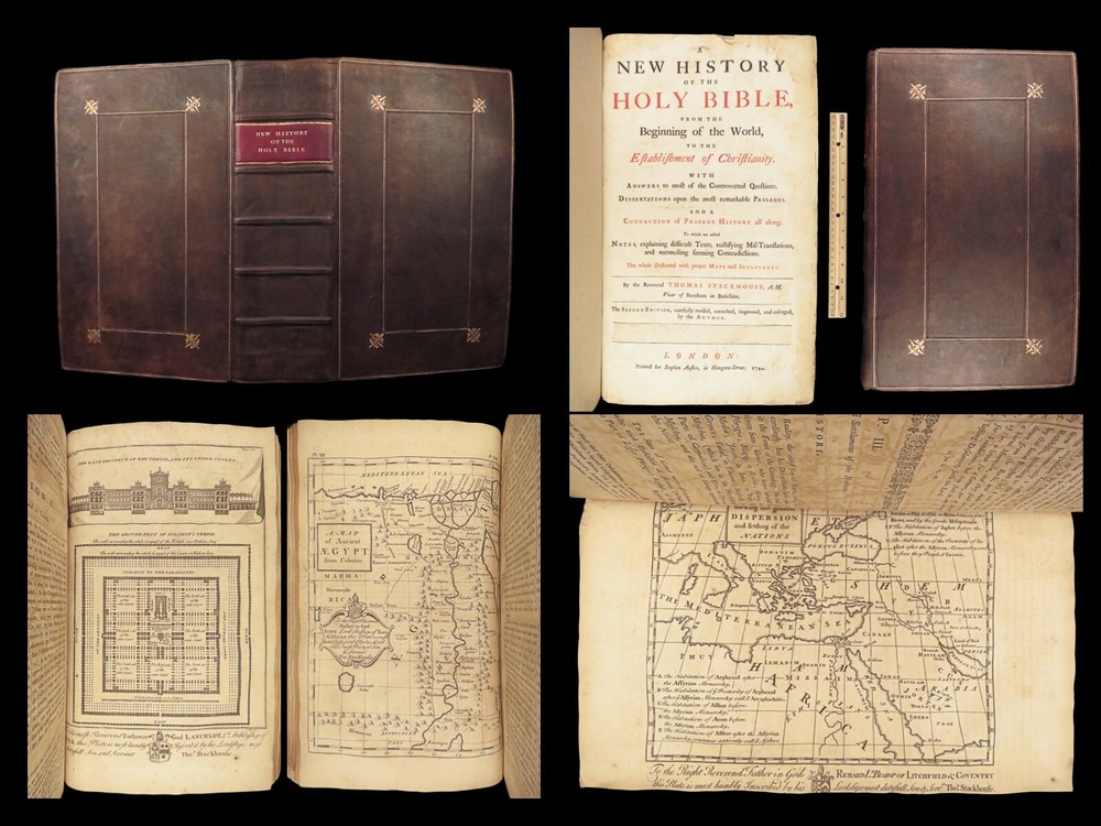 1744 Holy BIBLE & History Illustrated Thomas Stackhouse Maps HUGE Rare history of the Bible! Thomas Stackhouse was an 18 th -century English theologian known primarily for his work ‘ History of the Holy Bible’ . This work was an important ecclesiastical history incorporating descriptions of the early church, Biblical passages, difficult text commentary, and impressive illustrations throughout. This 1744 second edition is an enormous tome with impressive engravings, maps, and portraits. The illustrations of Noah and the whale and the Tower of Babel are especially desirable! Item number: #26864 Price: $950 STACKHOUSE, Thomas A new history of the Holy Bible, from the beginning of the world, to the establishment of Christianity London: printed for Stephen Austen, 1744. Details : · Collation: 2 volumes in 1 tome o Old Testament – [4], viii, 1196 o New Testament – [1197]-1650, [46] § Includes separate title page § Wanting last 4 pages of Index o Illustrated with 30 maps, plans, portraits, and scenes (of 35) § Wanting plates I-VI, XII · Language: English · Binding: Leather; tight and secure · Size : ~15in X 9.5in X 4.5in (38cm x 24cm x 11.5cm) Our Guarantee: Very Fast. Very Safe. Free Shipping Worldwide. Customer satisfaction is our priority! Notify us with 7 days of receiving, and we will offer a full refund without reservation! 26864