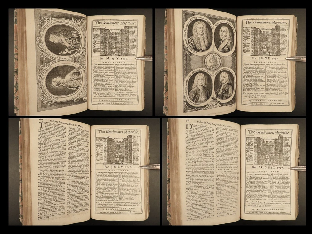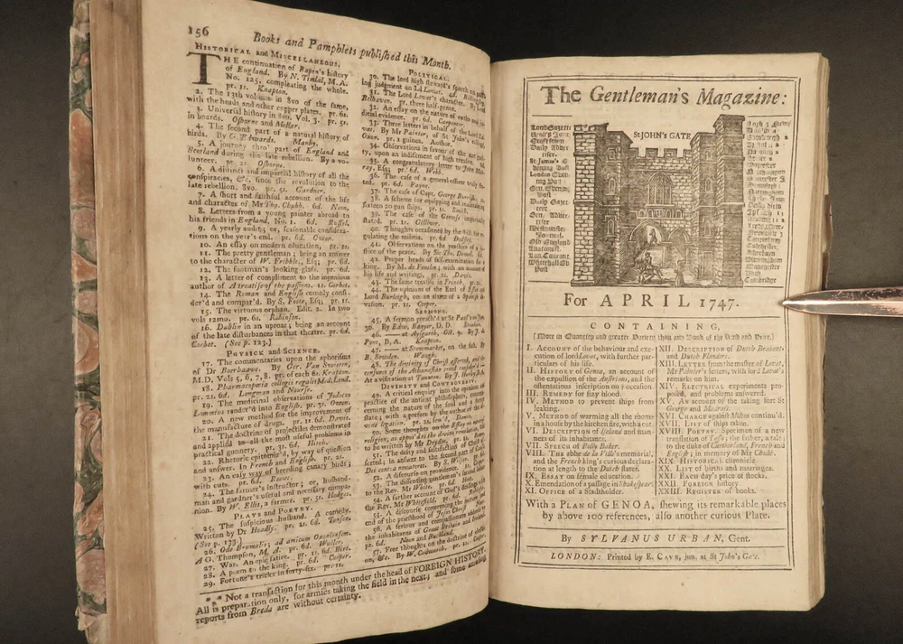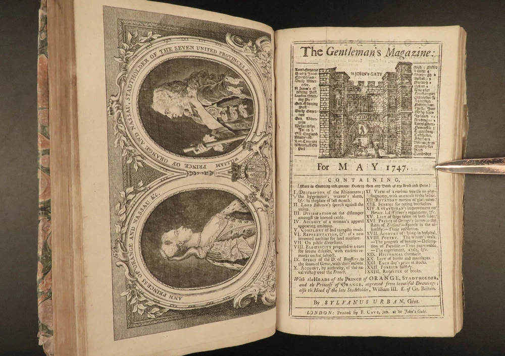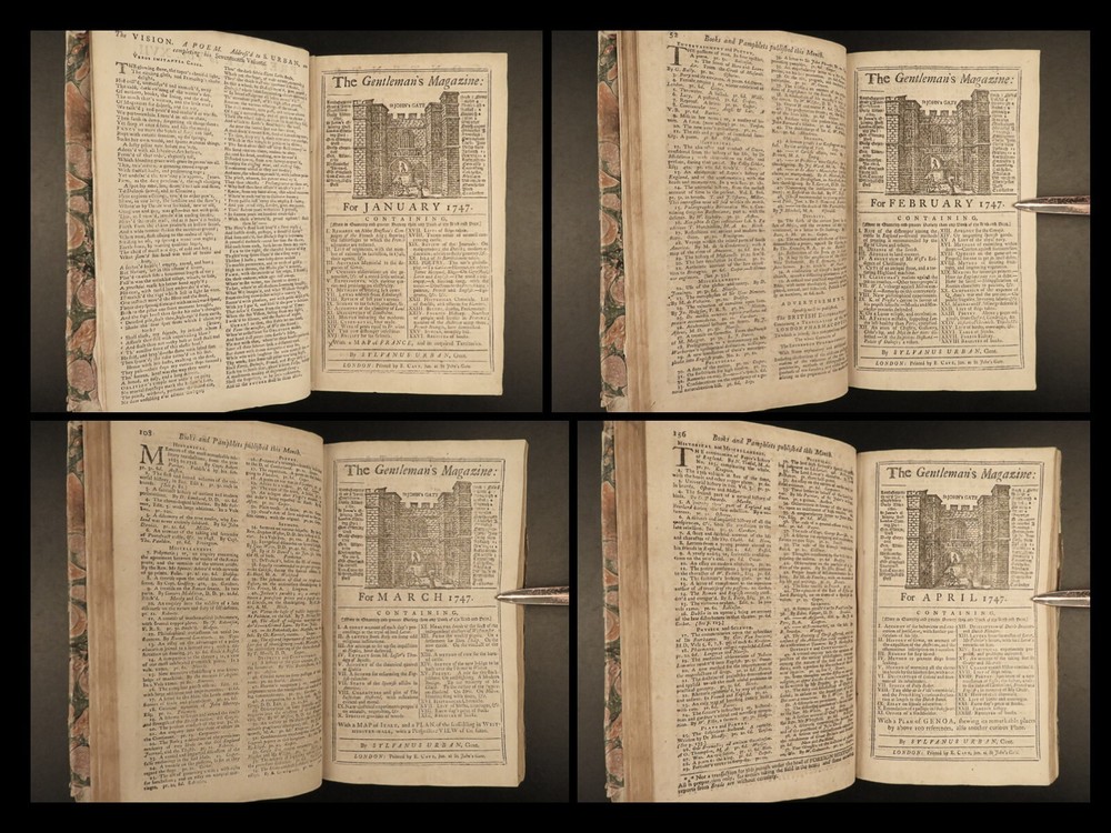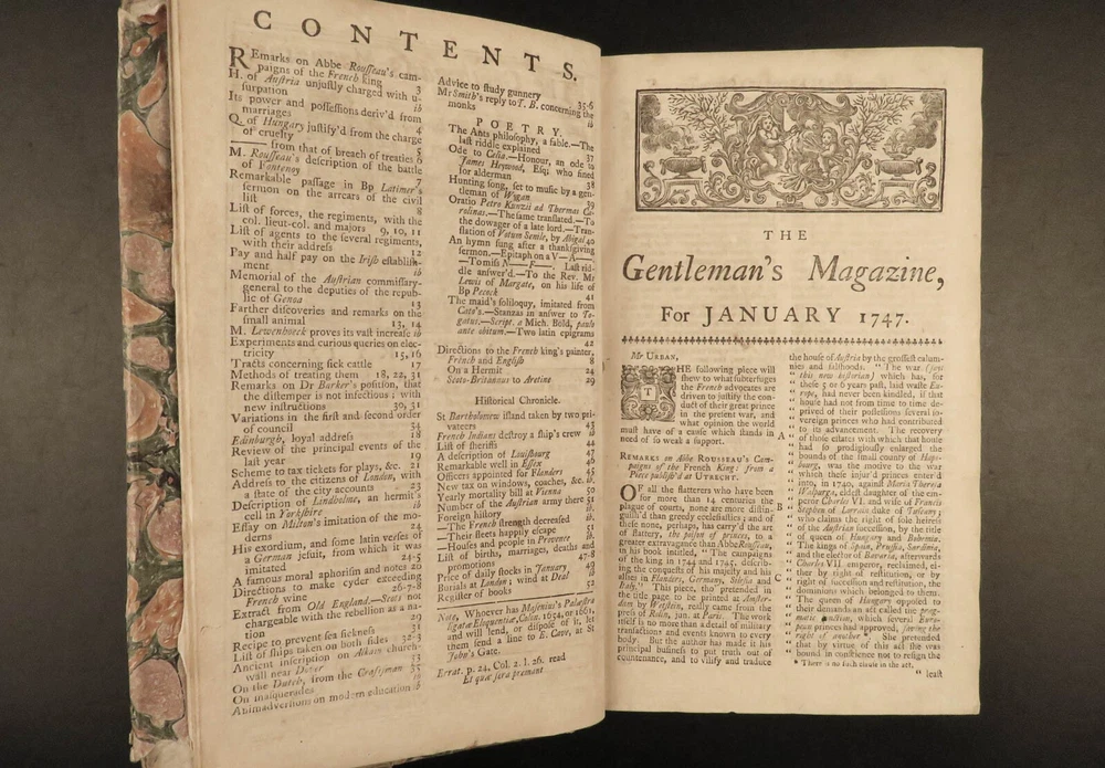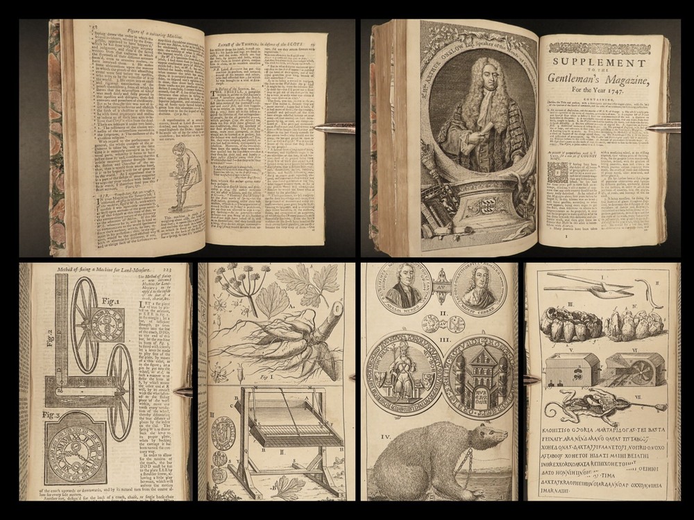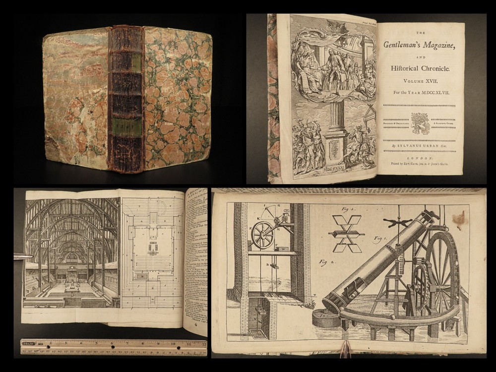 1747 Jacobite Rising Austrian Succession MAPS Pliny Vesuvius Electricity Lovat The Gentleman’s Magazine was an English periodical which first appeared in 1731. It was published without interruption for nearly 200 years and was the first of its kind to use the term ‘magazine’. It was published by Edward Cave, pseud. Sylvanus Urban. This 1747 edition includes a variety of important and interesting contents including: · Trial and execution of Simon Fraser, Lord Lovat o Stemming from Jacobite Rising of 1745 · Description of Rhinoceros · Electricity experiments – including use for disease cure · Successes in Scotland of the Jacobite rebels · Pliny’s account of the eruption of Vesuvius o Includes impressive folding view of the volcano · Notes on battles from the War of the Austrian Succession Item number: #21653 Price: $599 URBAN, Sylvanus [Edward Cave] The Gentleman’s Magazine: and historical Chronicle London: printed for E. Cave, 1747. First edition. Details : · Collation: o [4], 622, [18] o 16 engraved plates (2 folding) · Provenance: Armorial bookplate – PREND MOY TEL QUE JE SUIS o Coat of arms and motto of the Loftus family. While the identity of the owner is not certain, this was possibly Charles Tottenham Loftus, 1st Marquess of Ely, KP, PC (1738–1806), an Anglo-Irish peer and politician. · Language: English · Binding: Leather; secure · Size : ~8.25in X 5.25in (21cm x 13.5cm) Our Guarantee: Very Fast. Very Safe. Free Shipping Worldwide. Customer satisfaction is our priority! Notify us with 7 days of receiving, and we will offer a full refund without reservation! 21653