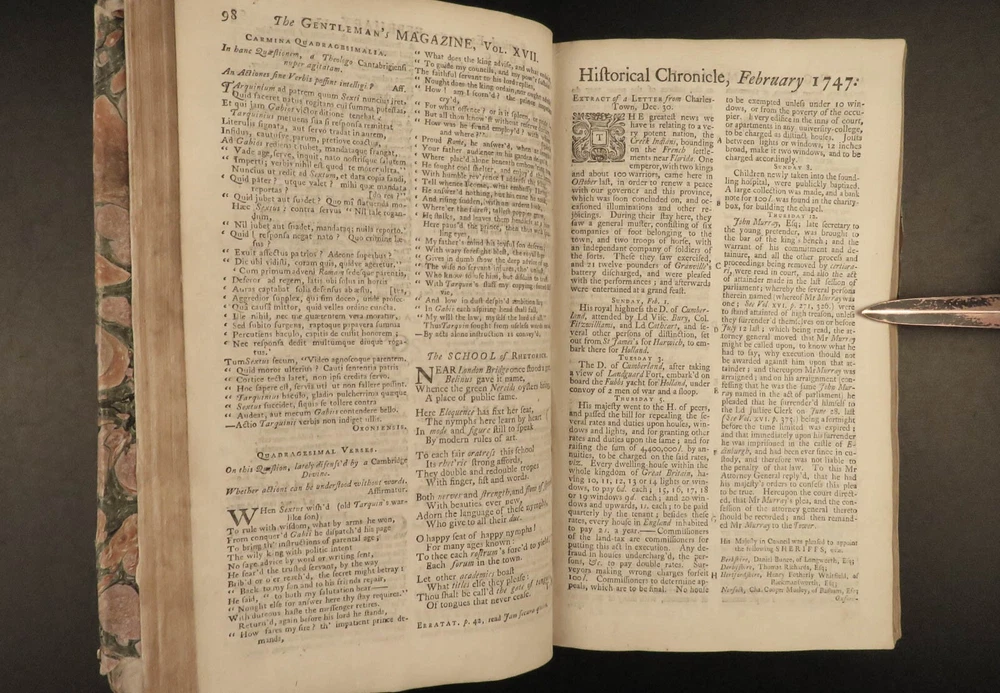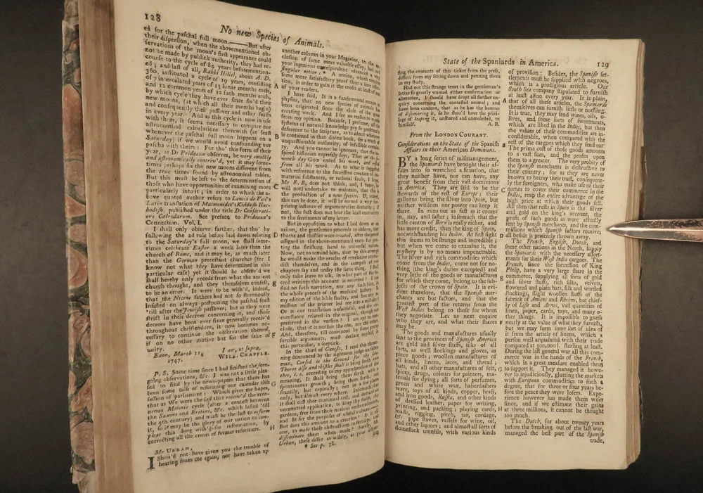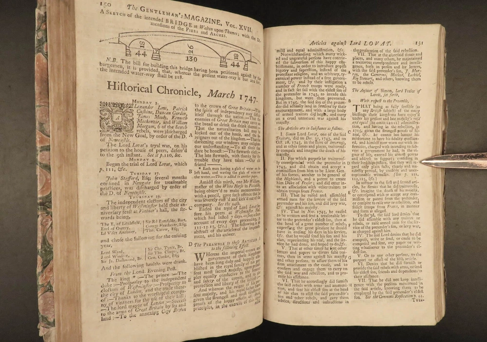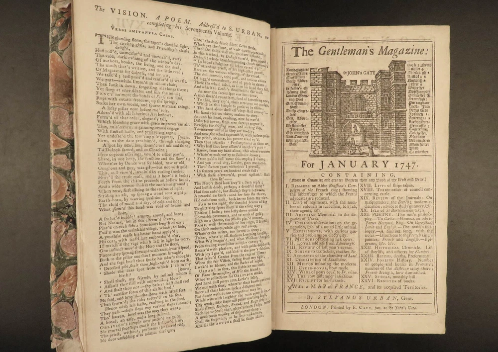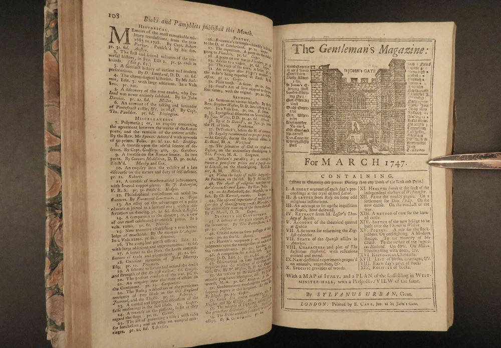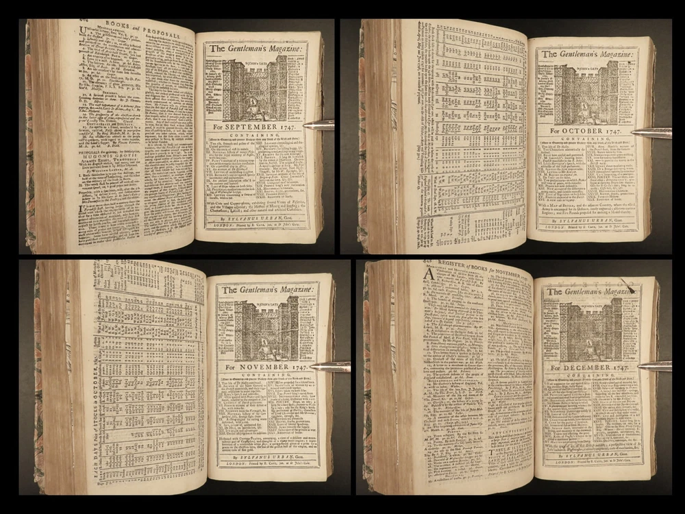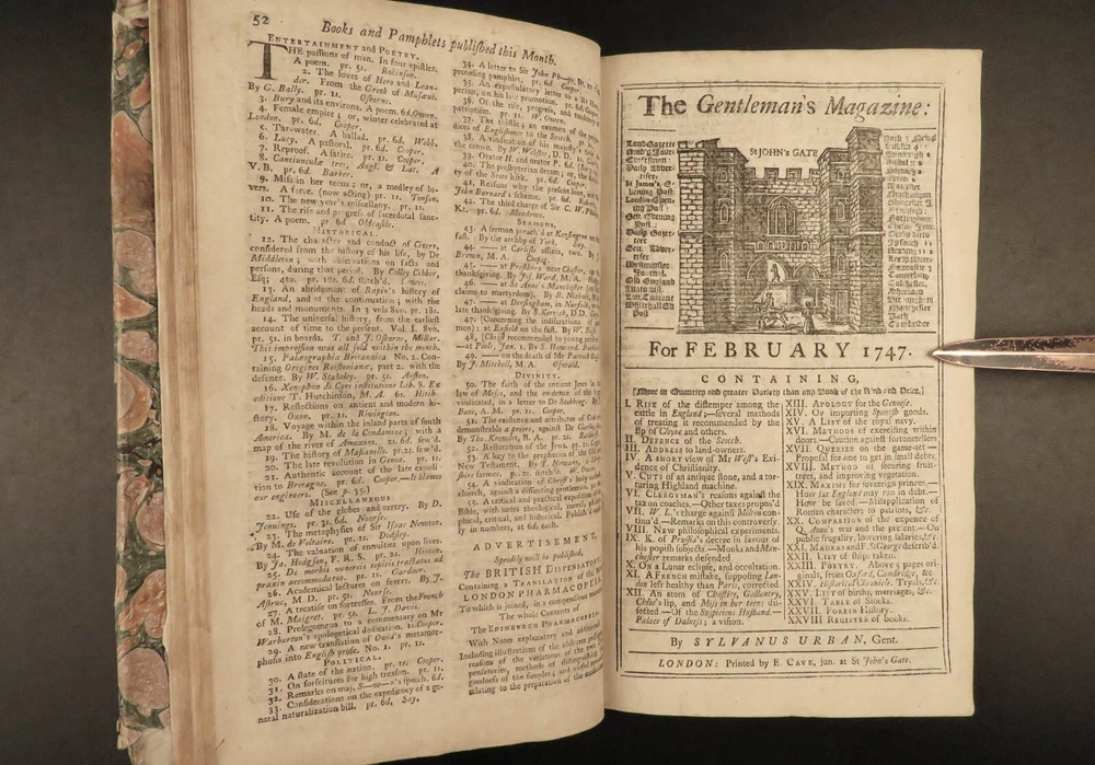 1747 Jacobite Rising Austrian Succession MAPS Pliny Vesuvius Electricity Lovat The Gentleman’s Magazine was an English periodical which first appeared in 1731. It was published without interruption for nearly 200 years and was the first of its kind to use the term ‘magazine’. It was published by Edward Cave, pseud. Sylvanus Urban. This 1747 edition includes a variety of important and interesting contents including: · Trial and execution of Simon Fraser, Lord Lovat o Stemming from Jacobite Rising of 1745 · Description of Rhinoceros · Electricity experiments – including use for disease cure · Successes in Scotland of the Jacobite rebels · Pliny’s account of the eruption of Vesuvius o Includes impressive folding view of the volcano · Notes on battles from the War of the Austrian Succession Item number: #21653 Price: $599 URBAN, Sylvanus [Edward Cave] The Gentleman’s Magazine: and historical Chronicle London: printed for E. Cave, 1747. First edition. Details : · Collation: o [4], 622, [18] o 16 engraved plates (2 folding) · Provenance: Armorial bookplate – PREND MOY TEL QUE JE SUIS o Coat of arms and motto of the Loftus family. While the identity of the owner is not certain, this was possibly Charles Tottenham Loftus, 1st Marquess of Ely, KP, PC (1738–1806), an Anglo-Irish peer and politician. · Language: English · Binding: Leather; secure · Size : ~8.25in X 5.25in (21cm x 13.5cm) Our Guarantee: Very Fast. Very Safe. Free Shipping Worldwide. Customer satisfaction is our priority! Notify us with 7 days of receiving, and we will offer a full refund without reservation! 21653