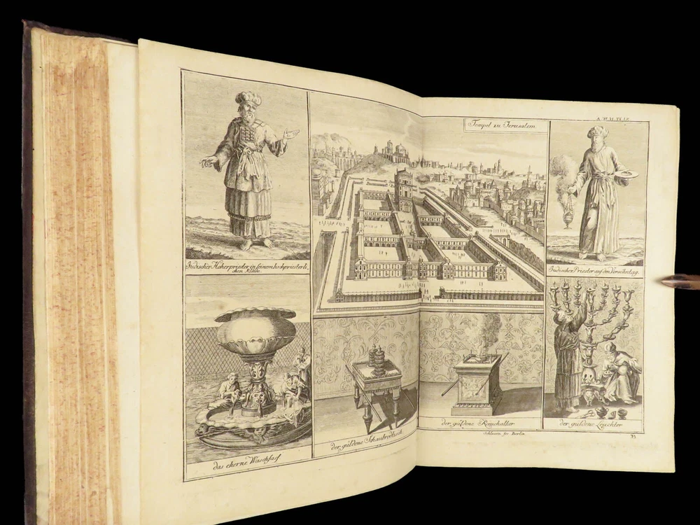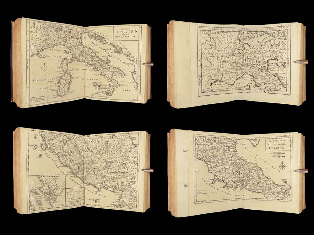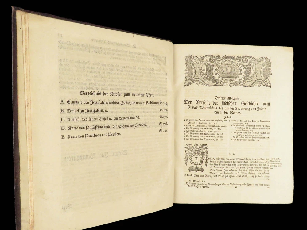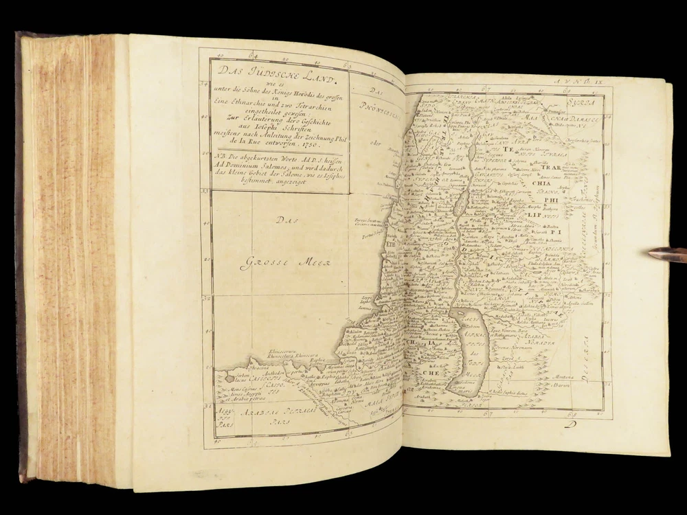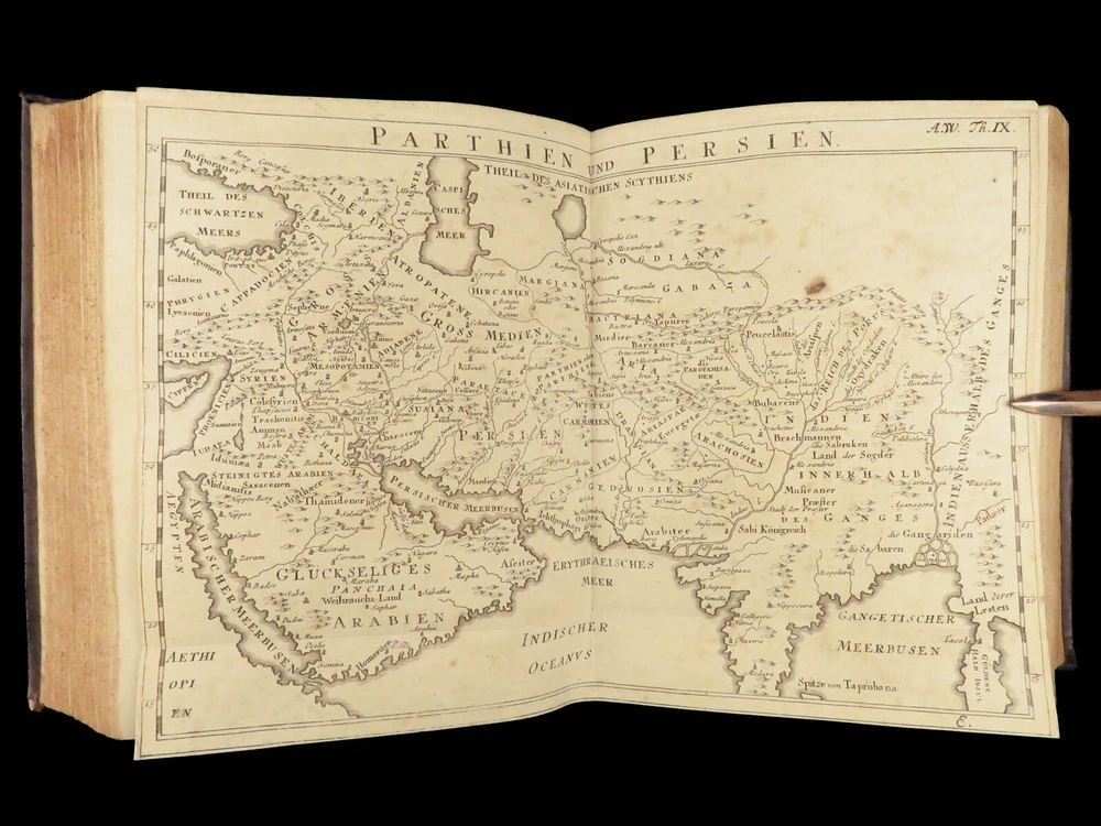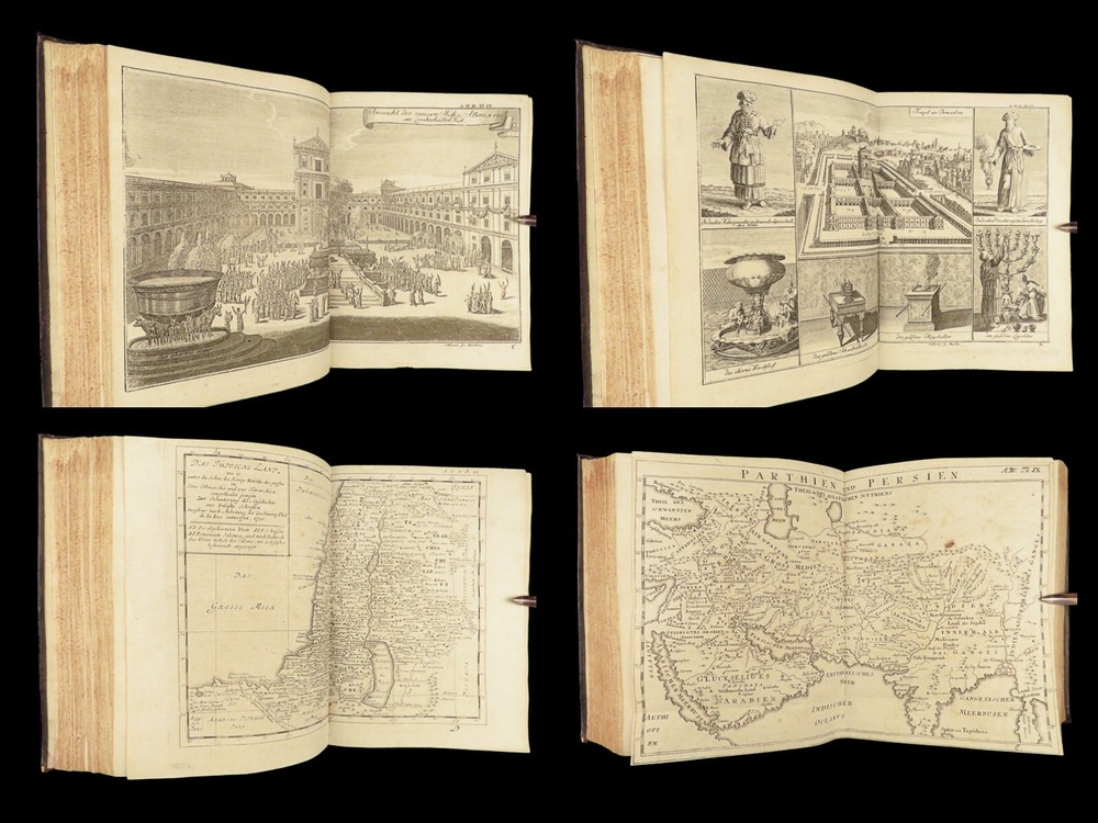 1750 Ancient ISRAEL Holy Land Atlas MAPS Jewish Hebrew Persia Rome Gaul Africa The “ Algemeinen Welthistorie ” was an 18 th -century historical journal collected to provide a complete and thorough history of the world. First edited by Siegmund Baumgarten and later by Johann Semler, this recurring work was a collection of articles by English scholars then translated and edited by Semler and Baumgarten – who Voltaire called ‘the crown of German scholars.’ This particular tome consists of volumes 9-10 and covers interesting histories including: · Jewish history, Old Testament history o Lives of Saul, David, and Jonathan o History of Jericho o Reigns of King Herods o Ongoing feuds between Israel and Palestine (Philistines) o City plan of Jerusalem per Josephus description · Rise of Babylon in Mesopotamia · Life of Roman general, Marcus Crassus governor of Syria, 1 st -c BC · Folding map of Persia, Middle East · Double page map of early Rome · Double page map of Numidia, Rome occupied Northern Africa · Double page map of Rome occupied Gaul, southern France · Earliest (7) kings of Rome including the first three - Romulus, Numa Pompilius, and Tullus · Establishment of the Roman Republic by Lucius Brutus and Poplicola · Scipio Africanus, Rome victories over Carthage in 2 nd -c BC Item number: #26404 Price: $750 BAUMGARTEN, Siegmund Jacob; SEMLER, Johann Uebersetzung der Algemeinen Welthistorie die in Engeland durch eine Geselschaft von Gelehrten ausgefertiget worden Halle: Verlag Joh. Justinus Gebauers, 1750-1751. 1 st edition Details : · Collation: Complete with all pages; 2 volumes in 1 tome o Vol. 9 – 11, [1], 746 o Vol. 10 – [2], 80, 708 o 17 double-page maps and engravings, plus engraved frontispiece in each volume · Language: German · Binding: Leather; tight and secure · Size : ~9.75in X 8.25in (25cm x 20.5cm) Our Guarantee: Very Fast. Very Safe. Free Shipping Worldwide. Customer satisfaction is our priority! Notify us with 7 days of receiving, and we will offer a full refund without reservation! 26404