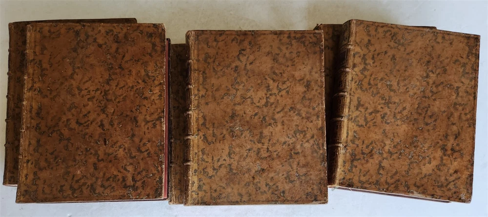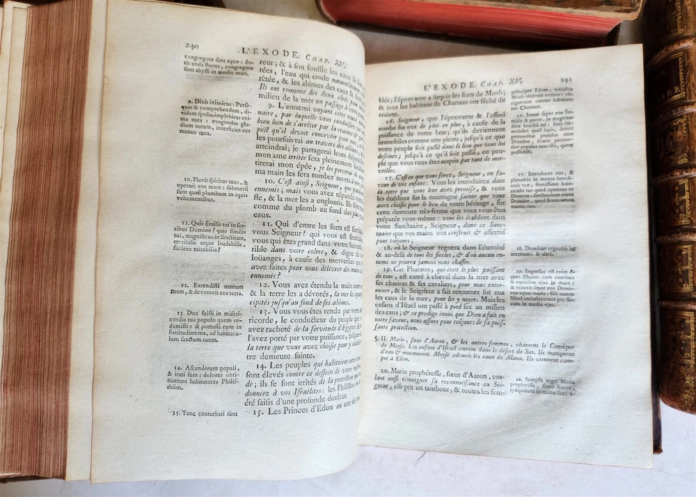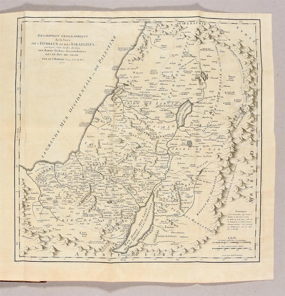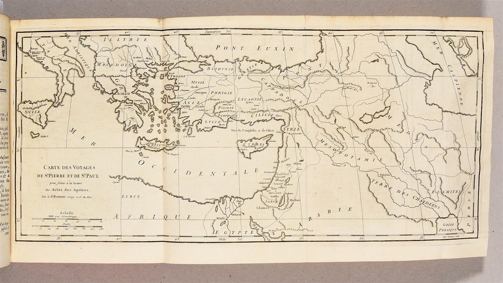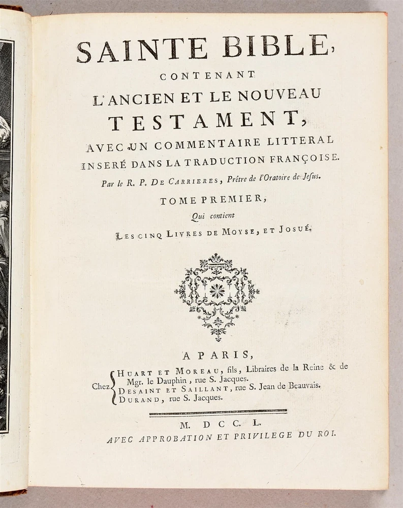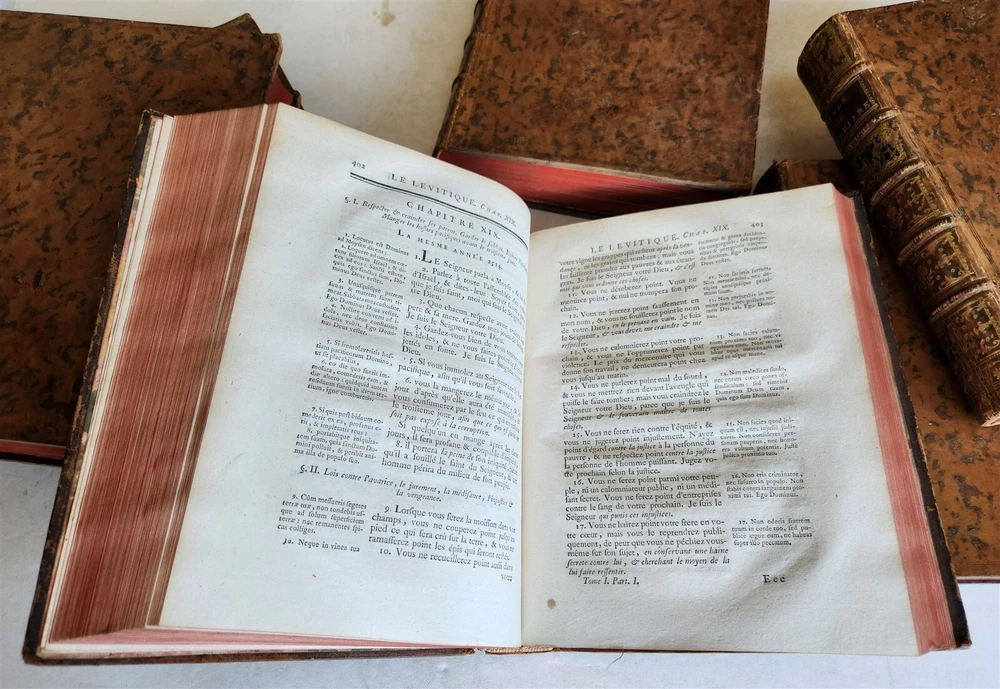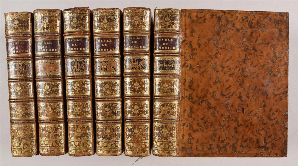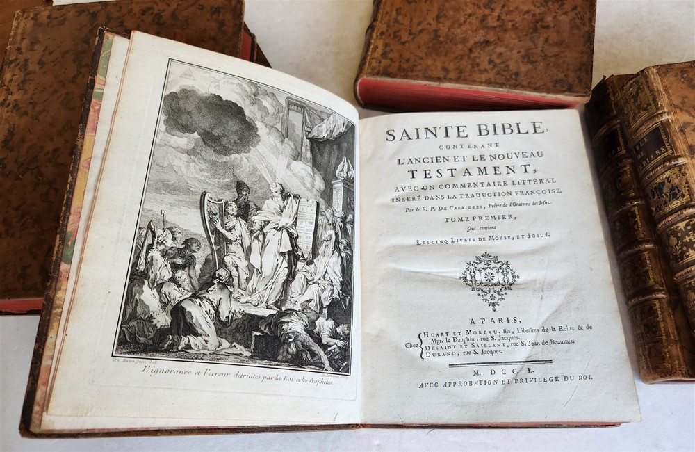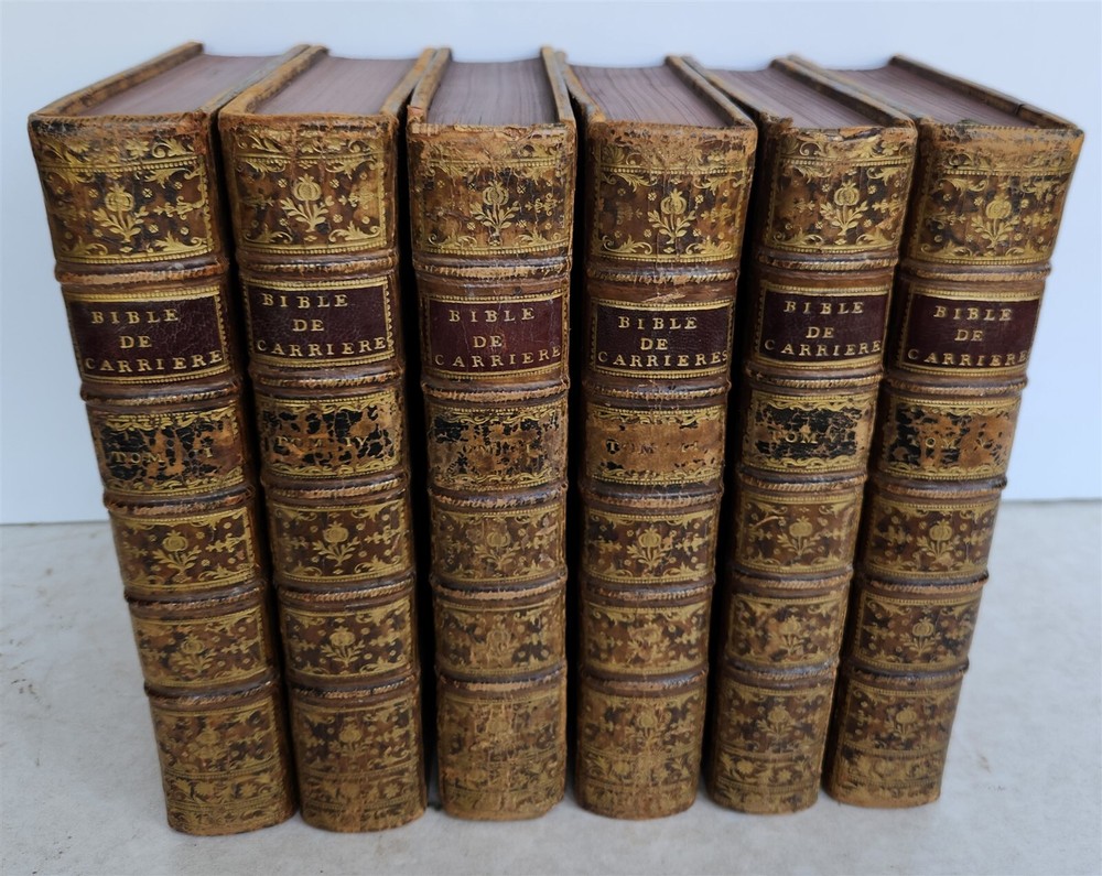 Sainte Bible, contenant l'Ancien et le Nouveau Testament, avec un commentaire littéral inséré dans la traduction francoise par le R.P. De Carrieres [...]. 6 volumes, complete set Paris; 1750 French translation, with commentary by Louis de Carrieres (1662-1717) of the Bible next to Latin text in 2 columns. Illustrated with frontispiece engraved by D. Sornique after De Seve, a headpiece at the beginning of each volume, and 3 folding maps (Holy Land divided among the 12 Tribes, The Exodus, the travels of St. Peter and St. Paul) , engraved by G. Delahaye Condition Report Original mottled sheep, gilt-ornamental spines with raised bands, red edges Very good condition, some wear of bindings Size 8 by 10 1/4 inches Text in French ================ Please see my other auctions Thank You Refund Policy: We will issue a FULL REFUND, 100% money back if you are not satisfied with your purchase. Items must be returned to us within 20 days in order to receive a refund or replacement. Buyer is responsible for shipping costs. Powered by SixBit's eCommerce Solution