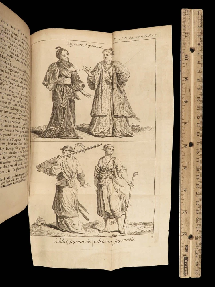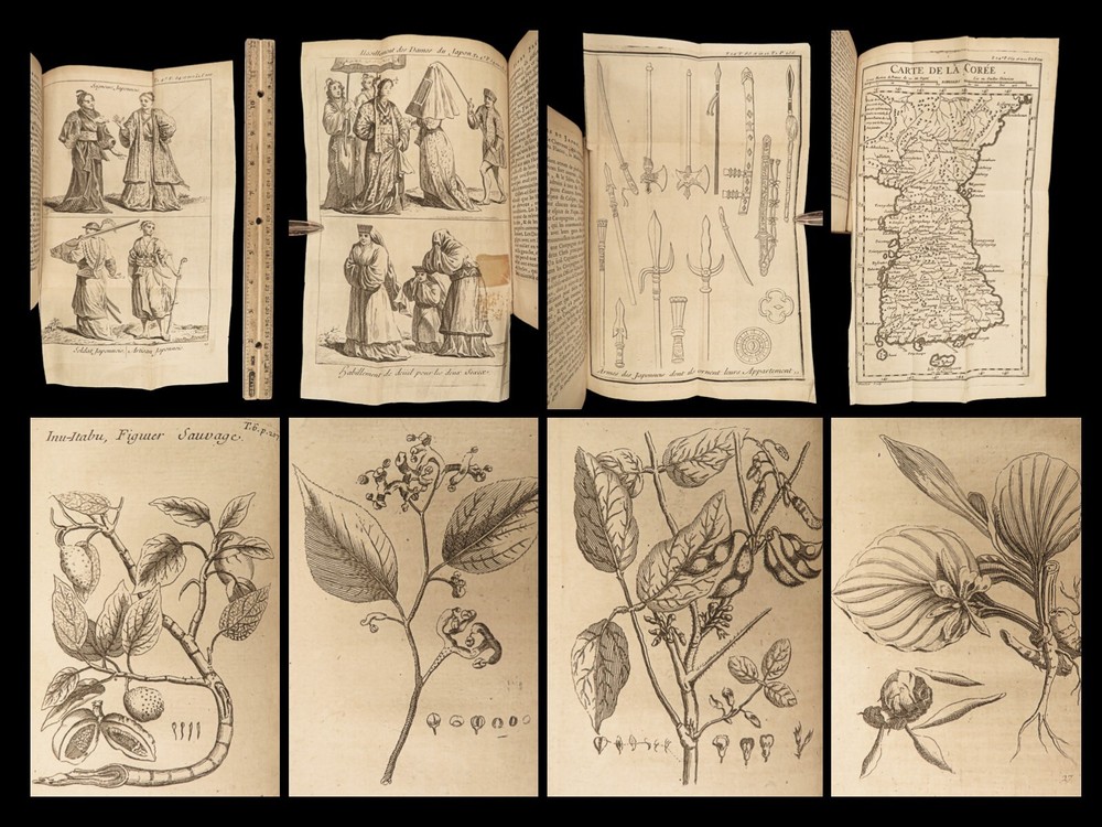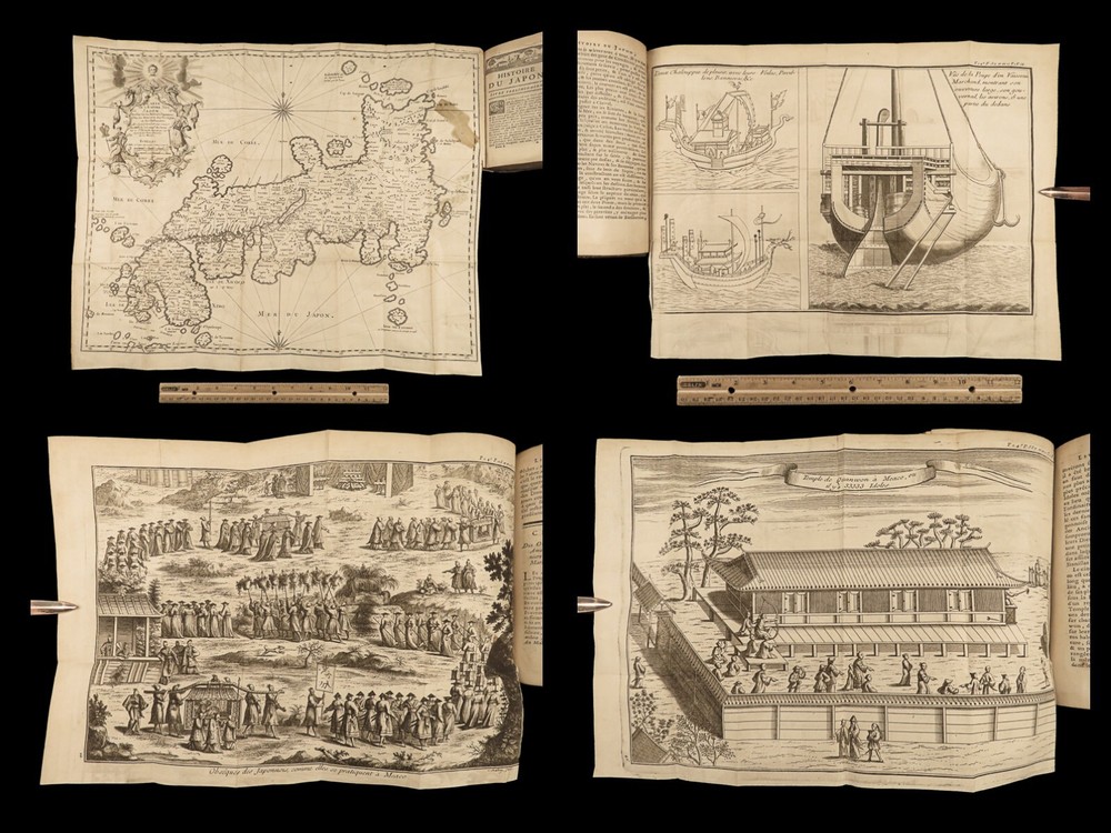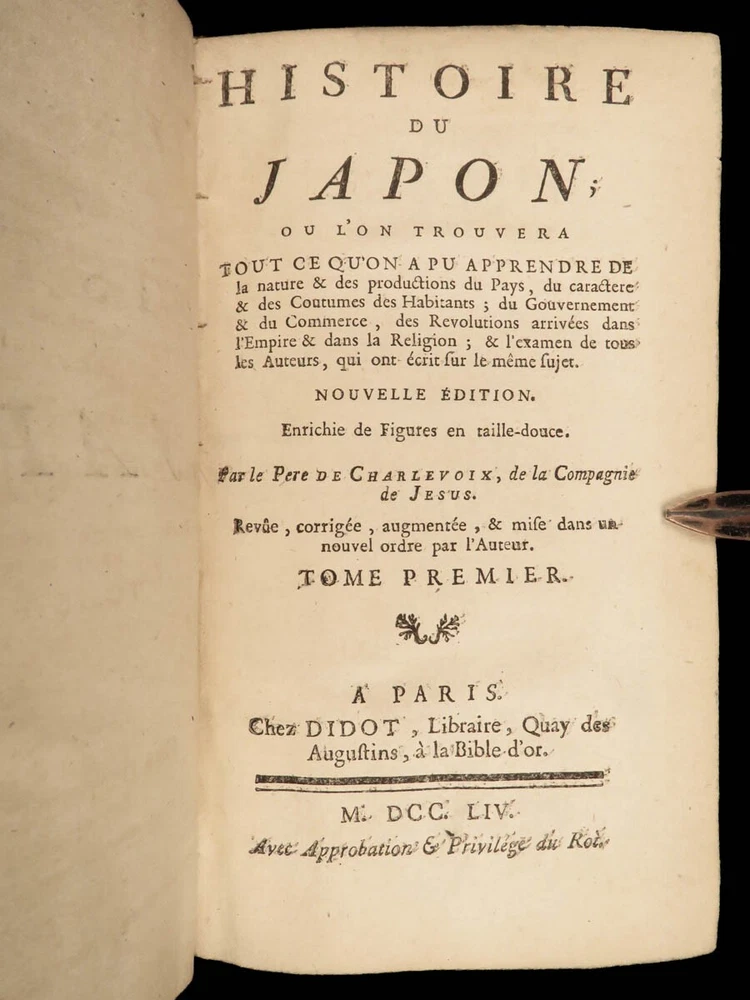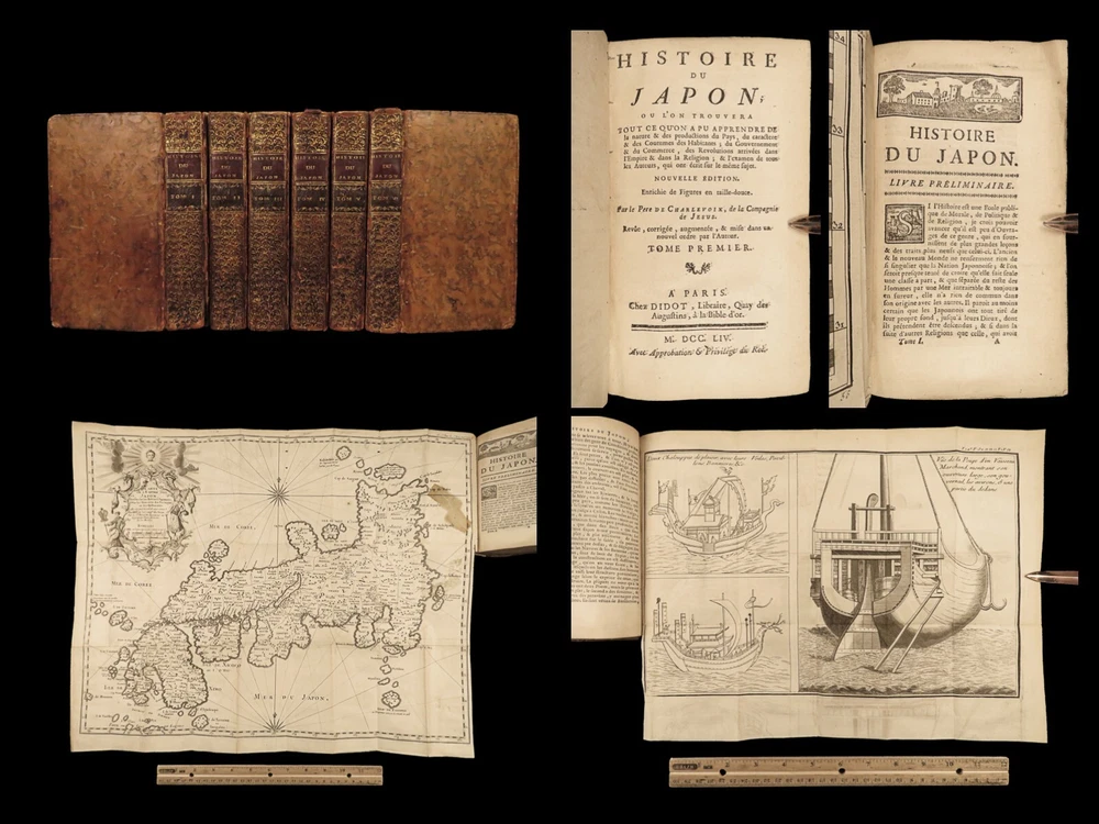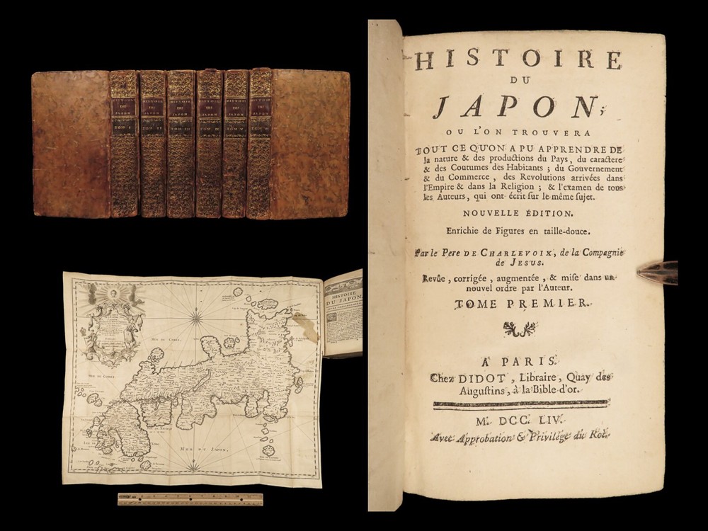 1754 Charlevoix JAPAN 1 ed Jesuit Voyages TOKYO Maps Ships FAMOUS Korea China 6v Pierre Charlevoix was an 18 th -century French Jesuit writer known for his informational surveys of Jesuit missionary voyages around the world. He published reports on voyages in Paraguay, Brazil and other South American countries, as well as voyages in Asia even though he himself never visited these locations. One of his best works was his “ History of Japan ”. This work provides a comprehensive overview of Japanese history which proved to be a catalyst for the western world understanding Japanese culture. This highly desirable and incredibly valuable 1754 edition of Charlevoix’s “ Japan ” consist of 56 engravings many of which are exquisite folding maps of Japan, Korea, and China! Other engravings depict Japanese costume and manners, ships and weaponry, customs, language, and city plans of Kyoto, Osaka, and Tokyo (Edo). Item number: #25054 Price: $3500 CHARLEVOIX, Pierre Histoire du Japon Paris: Chez Didot, 1754. First edition. Details : · Collation: Complete with all pages; 6 volumes o Vol. I – [4], xxiv, 417, [1] o Vol. II – [4], lxxxv, [3], 429, [1] o Vol. III – [4], 558, [2] o Vol. IV – [4], 534, [2] o Vol. V – [4], 479, [1] o Vol. VI – [4], 386, [6] o 56 full-page and folding engravings § Maps! · References: Cordier ‘Japonica’ 424 · Provenance: Bookplate – M. Jausions · Language: French · Binding: Leather; tight and secure · Size : ~6.75in X 4in (17cm x 10cm) · Very rare and desirable with auction records and price comaparisons between $5500-$9000 Our Guarantee: Very Fast. Very Safe. Free Shipping Worldwide. Customer satisfaction is our priority! Notify us with 7 days of receiving, and we will offer a full refund without reservation! 25054
