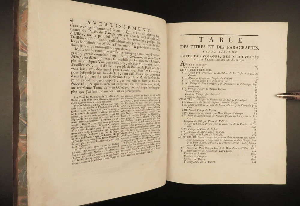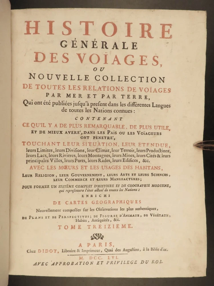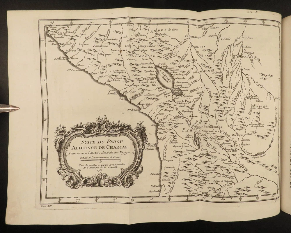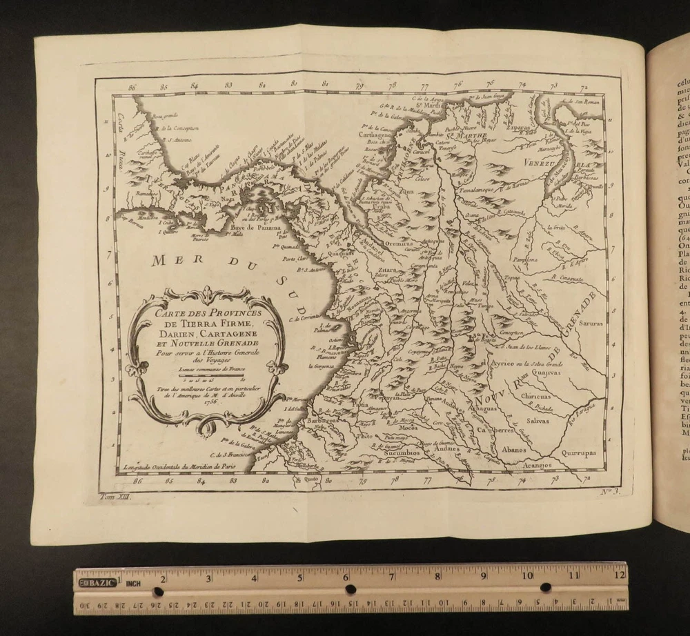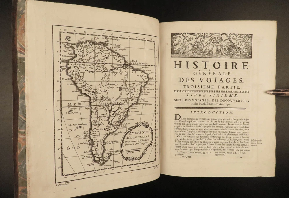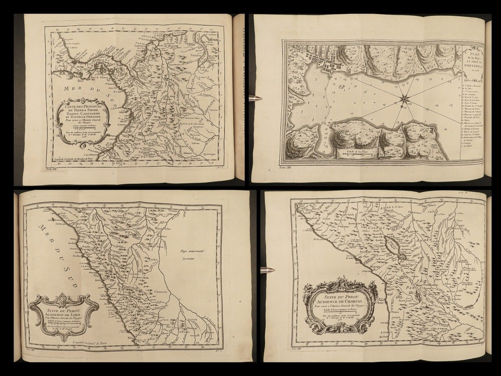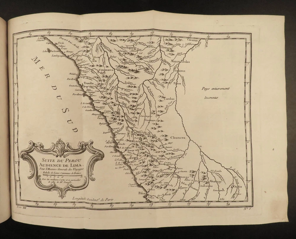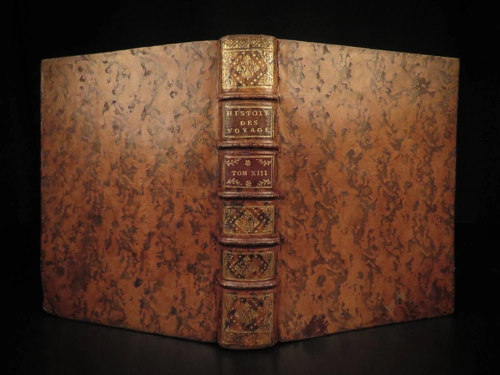 1756 Voyages MAPS of Pizzaro INCA Empire PERU Chile Panama las Casas Amazon The ‘ General History of Voyages’ by abbe Prevost is one of the largest and most impressive collections of stories of expeditions and world exploration printed in Europe during the 18 th -century. It has been highly collectable and desirable since its first printing, not only from the fascinating contents but from the full-page and folding engravings depicting scenes of exploration and unknown peoples. According to Hill, this work is an “important collection, which includes accounts of many early voyages. It includes accounts of all the major early Australian voyages as well as an account of the Dutch discovery of Australia, including Roggeveen's voyage to the Southern Lands, Dutch and French voyages to the East Indies, voyages to China, and voyages of the British East India Company to India and Ceylon.” This volume from the 1754 edition contains highly desirable content including: · Voyages of Barthelemi de las Casas, Bishop of Chiapas o Accounts of Destruction of the Indies · Voyages of Jacques Cartier · Discoveries of Peru by Pizarro o Establishments in Venezuela · Discovery of Chile by Pizarro · Voyages of Vacca de Castro, Blasco Nunez de Vela, Pierre de la Gasca · Voyages of Juan d’Ulloa o Description of Panama o Description of the Amazon River o Description of the capital of Chile, Santiago · Origins of the Inca people and ancient empires in Peru · Famous routes, corridors, rivers through the Andes Mountains Item number: #21364 Price: $750 PREVOST, abbe Histoire générale des voyages, ou, Nouvelle collection de toutes les relations de voyages par mer et par terre Paris: chez la veuve Didot, 1756. Details : · Collation: Complete with all pages o vi, [2], 658, [2] o 24 engravings including 12 maps (10 folding) · References: Sabin 65402; Hill 1391 · Language: French · Binding: Leather; tight and secure · Size : ~10in X 8in (25.5cm x 20cm) Our Guarantee: Very Fast. Very Safe. Free Shipping Worldwide. Customer satisfaction is our priority! Notify us with 7 days of receiving, and we will offer a full refund without reservation! 21364