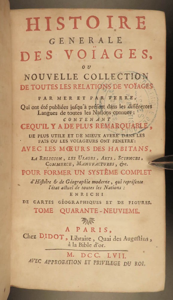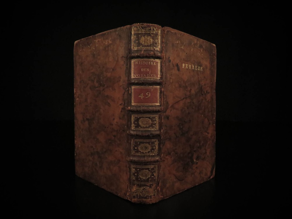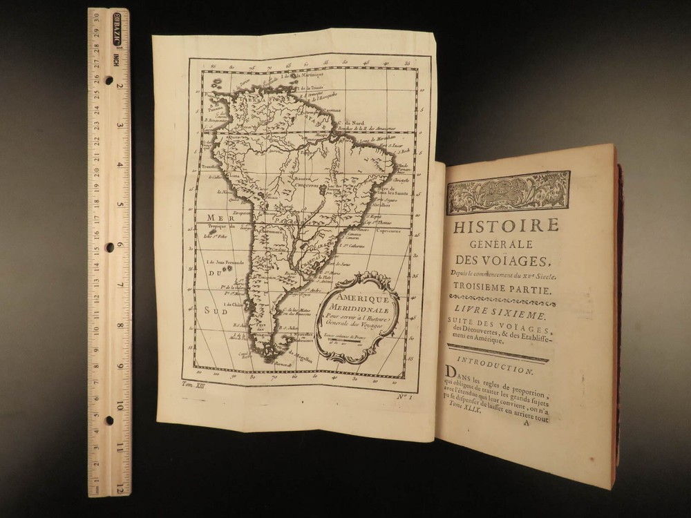 1757 Voyages South America Jacques Cartier Pizzaro PERU Caribbean MAPS Prevost The ‘ General History of Voyages’ by abbe Prevost is one of the largest and most impressive collections of stories of expeditions and world exploration printed in Europe during the 18 th -century. This 49 th volume covers descriptions of voyages in South America with heavy emphasis on Pizzaro, Jacques Cartier, and Jean Verazzani. · Serrano: o Repopulating the Caribbean islands o Settlements of Barthelemi de Las Casas o Cumana Coast and the local tribes in Cumana o In Toledo, Belize · Discovery and descriptions of the Strait of Magellan · Jean Verazzani o Voyage and discoveries in North America § Description and interactions with Native Indian tribes · Voyages of Jacques Cartier in 1534 to 1540 o Detailed descriptions of crewmen with scurvy o Local tribal remedies and healing practices · Pizzaro o Voyages from Panama and Peru o Settlements on Isle of Gorgone, Isle of St Claire o Idol worship, gold and silver worship Item number: #16780 Price: $550 PREVOST, abbe Histoire generale des voiages ou nouvelle collection de toutes les relations de voiages par mer et par terre, qui ont été publiées jusqu´á présent dans les différentes langues de toutes les nations connues contenánt cequ´il y a de plus remarquable Paris: chez Didot, 1757. First edition. Details : · Collation: Complete o [4], xii, 516 o Folding map of South Africa · Language: French · Binding: Leather; tight and secure · Size : ~6.75in X 4in (17cm x 10cm) Our Guarantee: Very Fast. Very Safe. Free Shipping Worldwide. Customer satisfaction is our priority! Notify us with 7 days of receiving, and we will offer a full refund without reservation! 16780