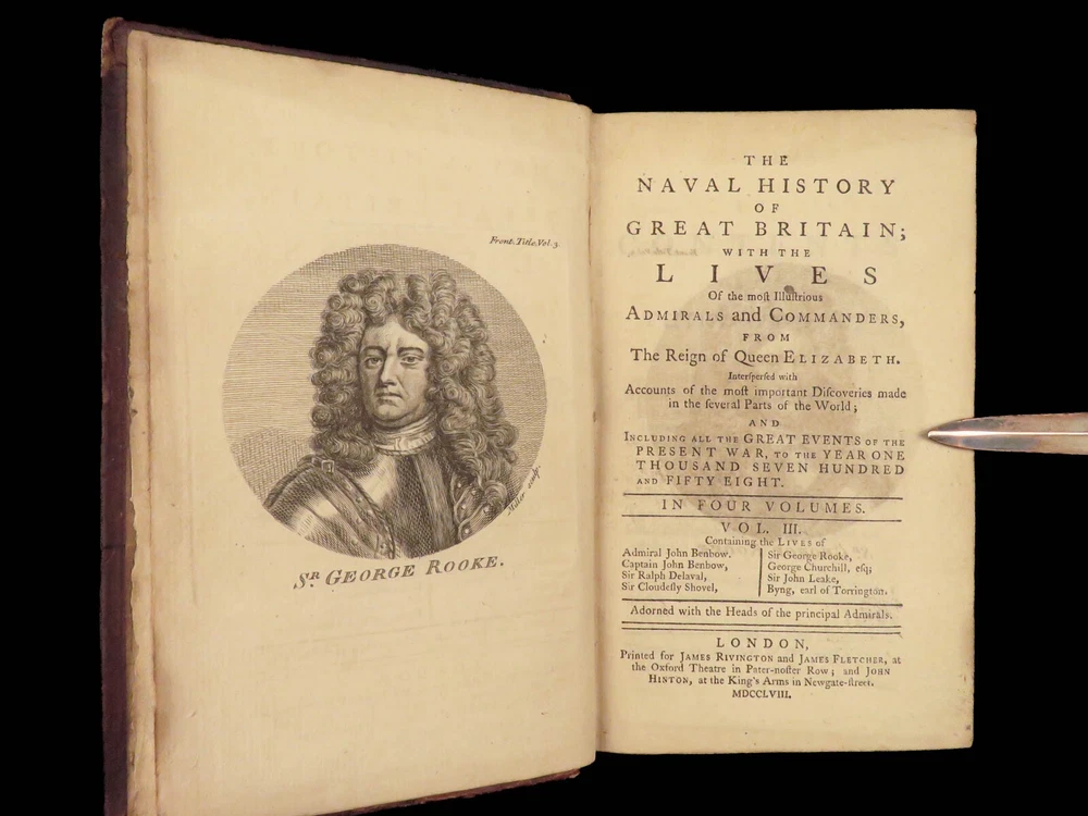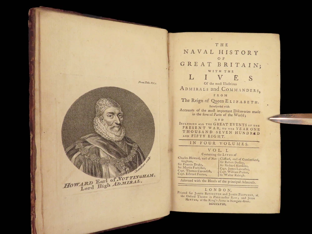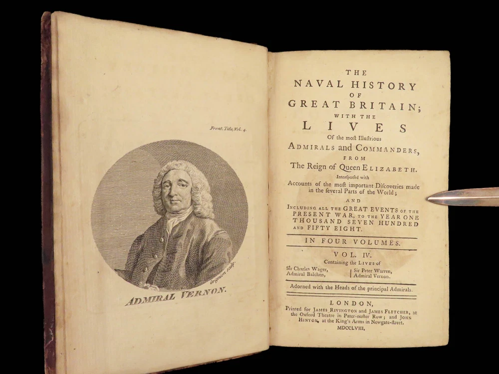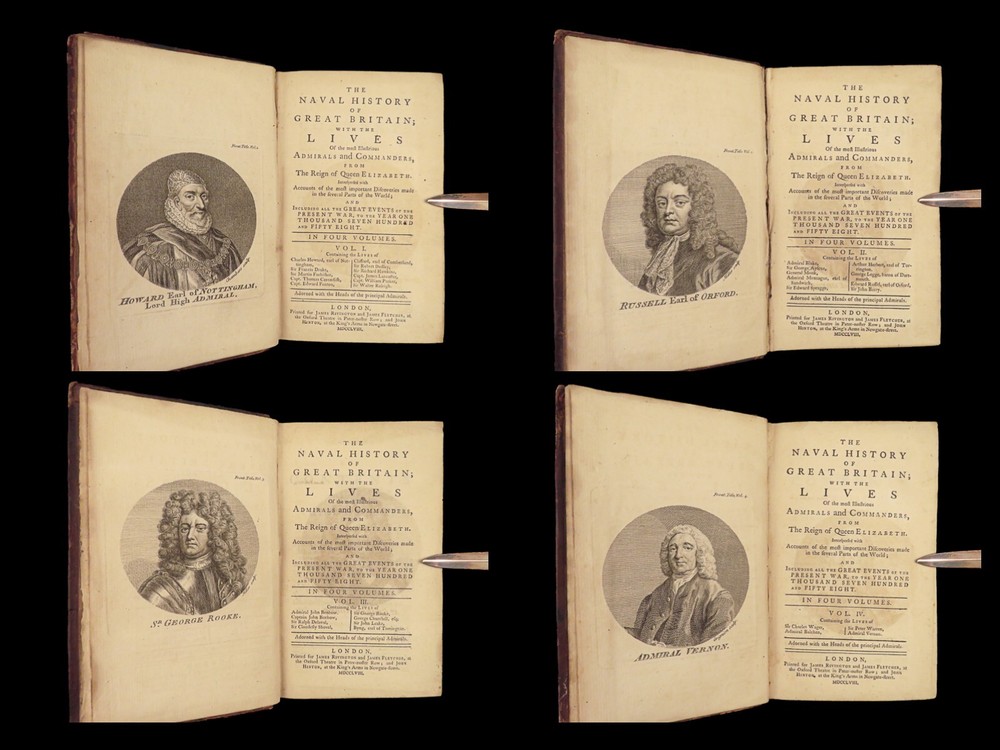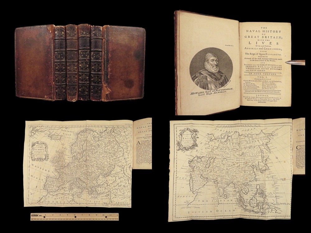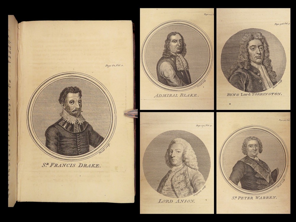 1758 Naval History Britain Barrow Voyages MAPS Walter Raleigh Francis Drake 4v John Barrow was an 18 th -century English naval historian remembered for his illustrated dictionaries. Perhaps his best work is ‘ The Naval History of Great Britain’ , a book about the lives and military conquests of British admirals and ship commanders. It offers commentary on some of the most notable sea battles during the Seven Years War. This highly valuable and desirable work contains impressive folding engravings depicting views of ships, portraits of admirals such as Walter Raleigh, Francis Drake, and Robert Blake, and maps of the world ! Item number: #26028 Price: $950 BARROW, John The naval history of Great Britain; with the lives of ... admirals and commanders ... and including ... the present war to 1758. London: Printed for James Rivington, 1758 1 st edition Details : · Collation: Complete with all pages; 4 volumes o Vol. 1 – xlviii, 271, [1] o Vol. 2 – xii, 336 o Vol. 3 – xi, [1], 339 (i.e., 340) o Vol. 4 – xi, [1], 370 o 9 engraved portraits o 4 folding maps · Language: English · Binding: Leather; tight and secure · Size : ~6.75in X 4.5in (17.5cm x 11cm) Our Guarantee: Very Fast. Very Safe. Free Shipping Worldwide. Customer satisfaction is our priority! Notify us with 7 days of receiving, and we will offer a full refund without reservation! 26028