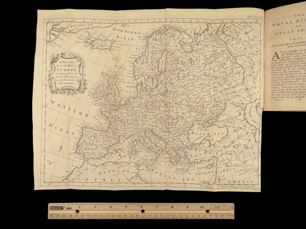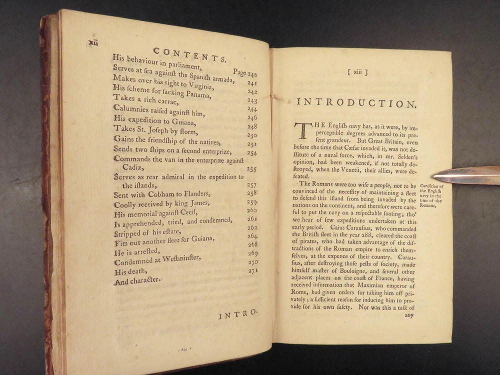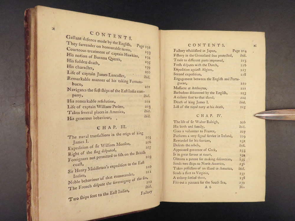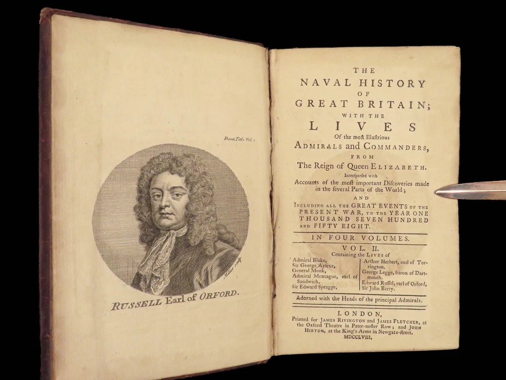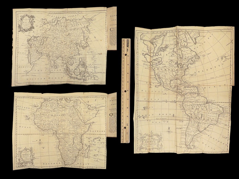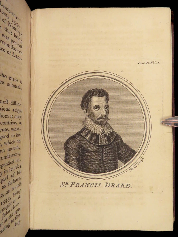 1758 Naval History Britain Barrow Voyages MAPS Walter Raleigh Francis Drake 4v John Barrow was an 18 th -century English naval historian remembered for his illustrated dictionaries. Perhaps his best work is ‘ The Naval History of Great Britain’ , a book about the lives and military conquests of British admirals and ship commanders. It offers commentary on some of the most notable sea battles during the Seven Years War. This highly valuable and desirable work contains impressive folding engravings depicting views of ships, portraits of admirals such as Walter Raleigh, Francis Drake, and Robert Blake, and maps of the world ! Item number: #26028 Price: $950 BARROW, John The naval history of Great Britain; with the lives of ... admirals and commanders ... and including ... the present war to 1758. London: Printed for James Rivington, 1758 1 st edition Details : · Collation: Complete with all pages; 4 volumes o Vol. 1 – xlviii, 271, [1] o Vol. 2 – xii, 336 o Vol. 3 – xi, [1], 339 (i.e., 340) o Vol. 4 – xi, [1], 370 o 9 engraved portraits o 4 folding maps · Language: English · Binding: Leather; tight and secure · Size : ~6.75in X 4.5in (17.5cm x 11cm) Our Guarantee: Very Fast. Very Safe. Free Shipping Worldwide. Customer satisfaction is our priority! Notify us with 7 days of receiving, and we will offer a full refund without reservation! 26028