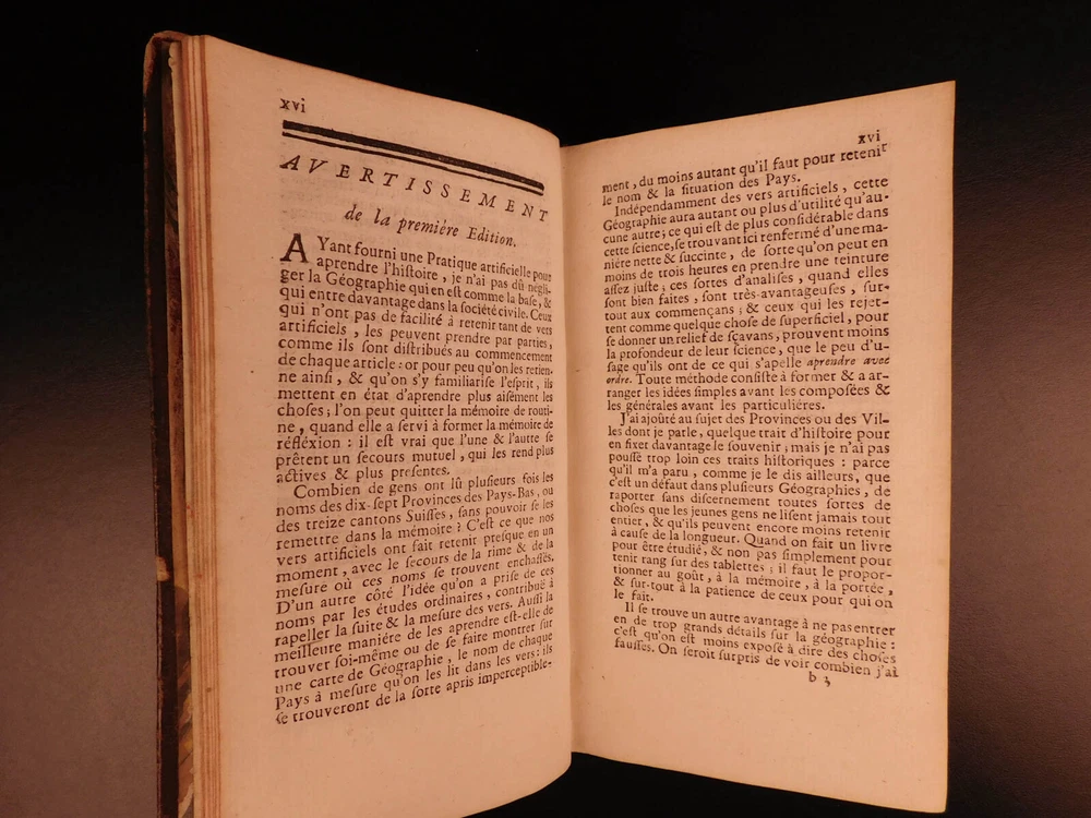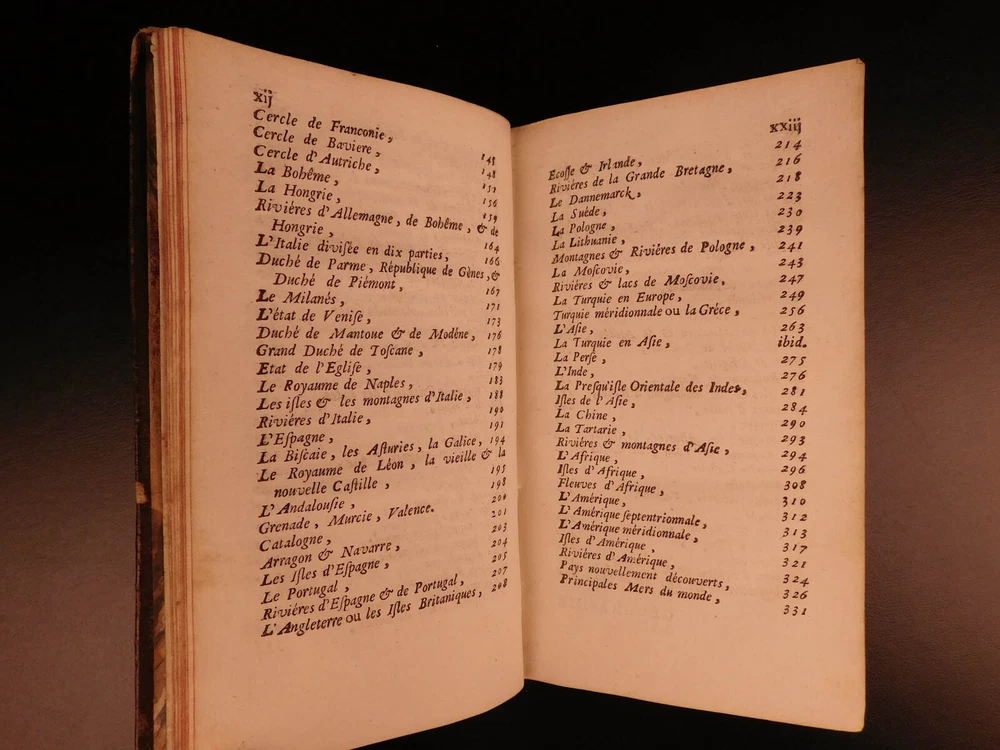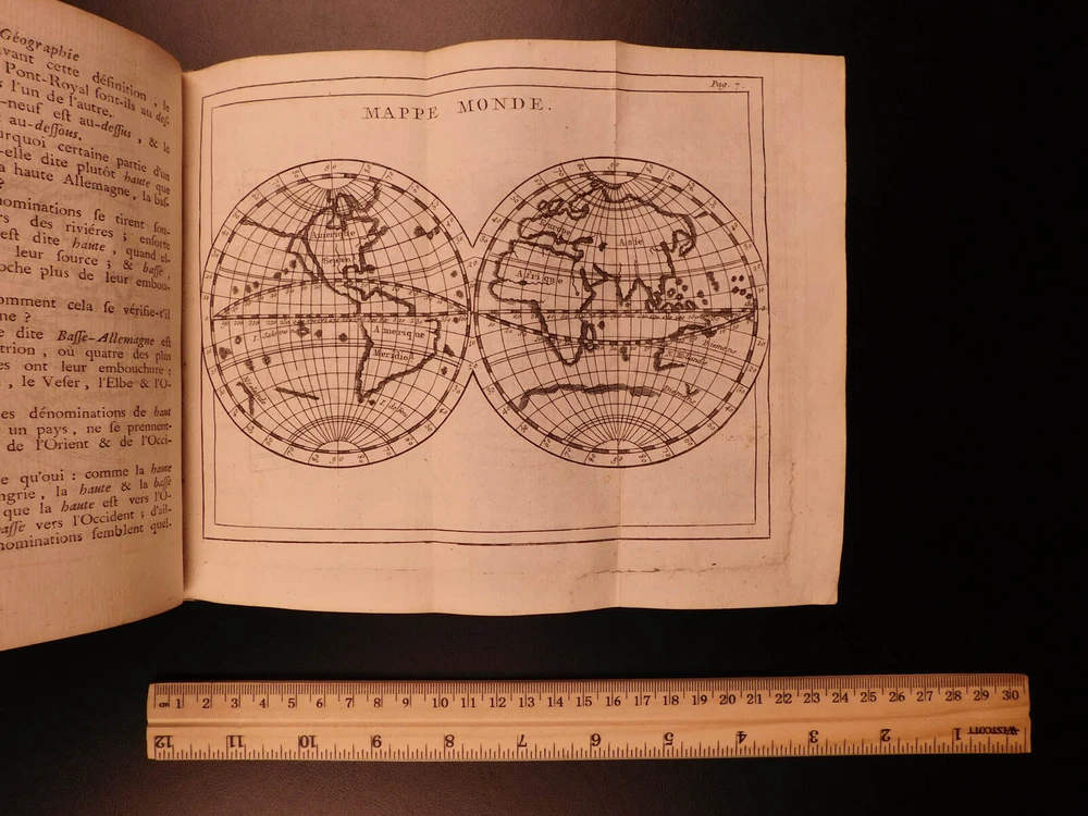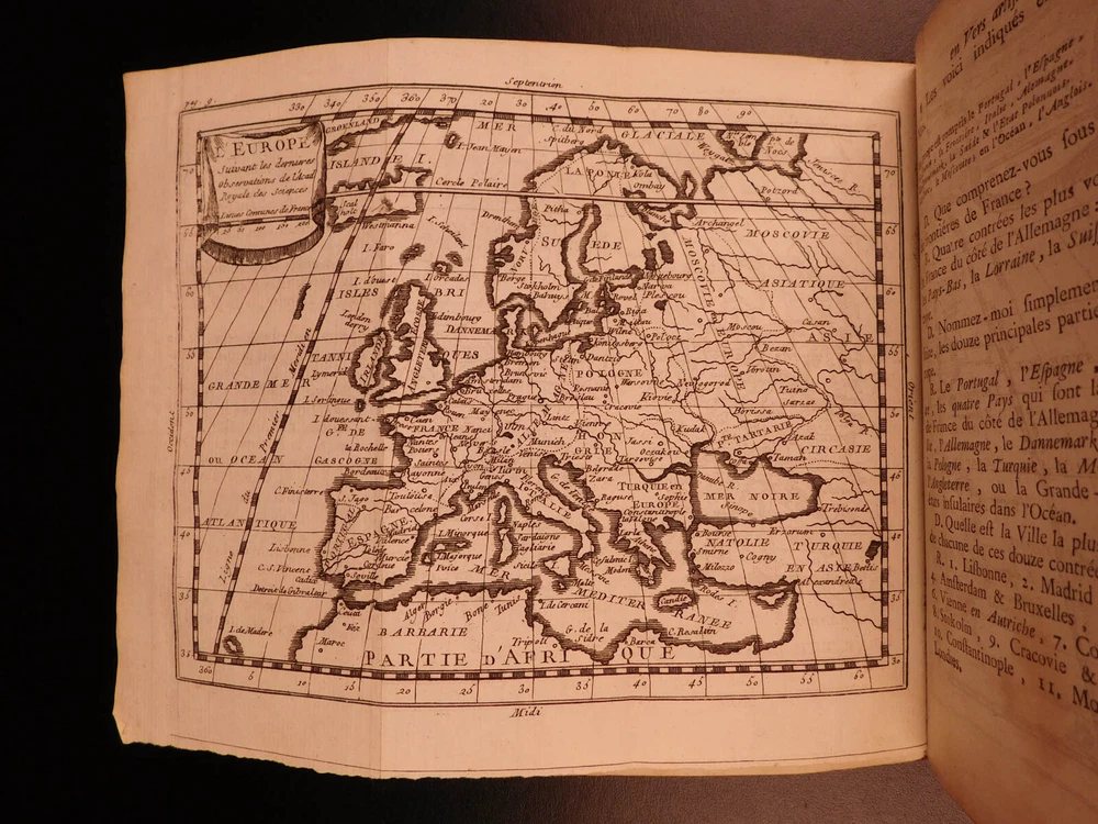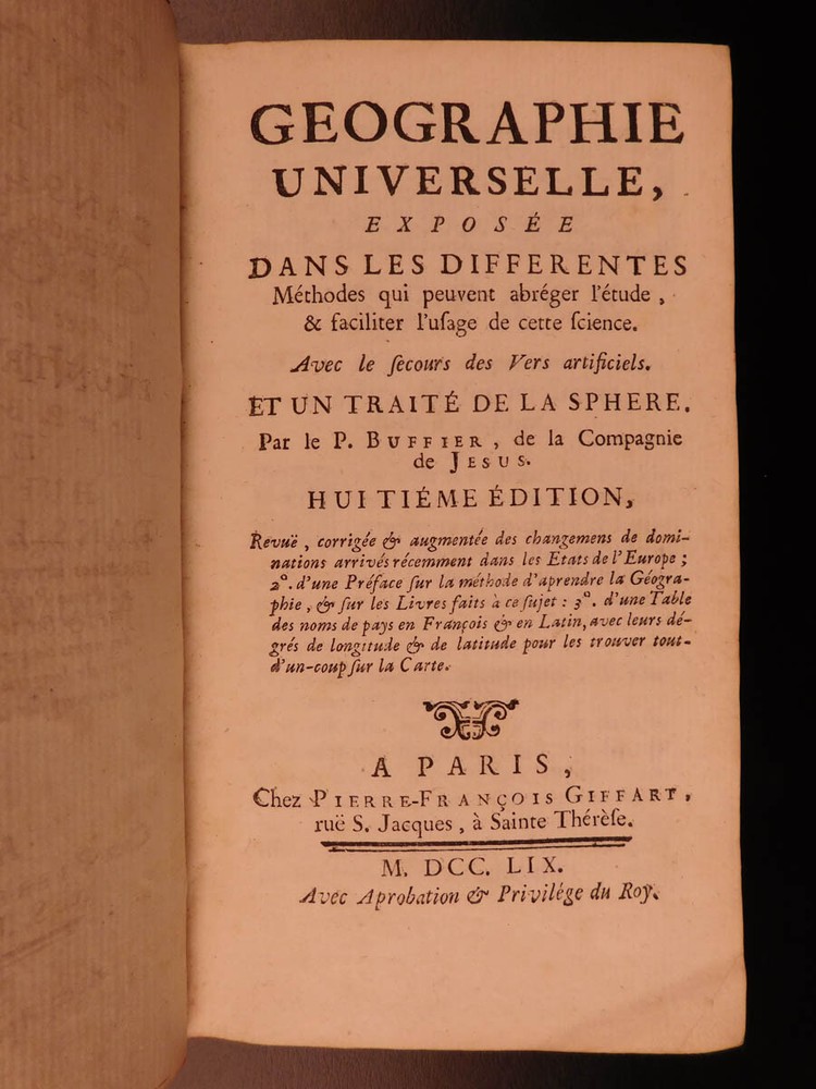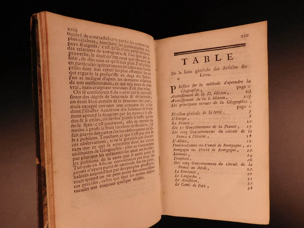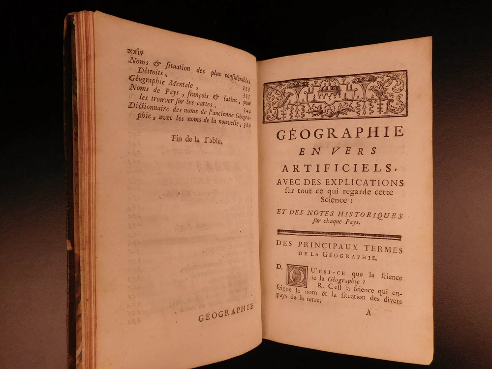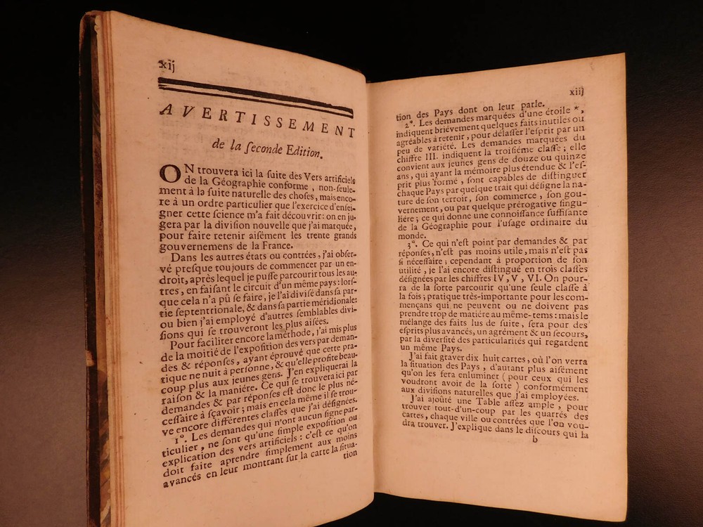 1759 Buffier Geography 18 Maps ATLAS Africa Italy Asia America California Island Known primarily for his contributions to philosophy, Claude Buffier, a 17 th -century French Jesuit historian, published a work of universal geography. This work, which went through numerous editions and titles into the late 18 th -century, describes each of the world’s continents and major world powers on each. This atlas, along with previous editions, were published at a time before extensive knowledge of the world was common. Buffier atlases are well-known to show California as an island off the American west coast! Item number: #8684 Price: $599 BUFFIER, Claude Geographie universelle : exposée dans les differentes méthodes qui peuvent abréger l'étude & faciliter l'usage de cette science. Avec le secours des vers artificiels. A Paris : Chez Pierre-François Giffart, rue S. Jacques, à Sainte Therese., M. DCC. LIX [1759]. Details : · Collation: Complete with all pages o xxiv, 404, 87 o 18 engraved maps · Language: French · Binding: Leather; tight & secure · Size: ~7in X 4in (18cm x 10cm) Our Guarantee: Very Fast. Very Safe. Free Shipping Worldwide. Customer satisfaction is our priority! Notify us with 7 days of receiving, and we will offer a full refund without reservation! 8684