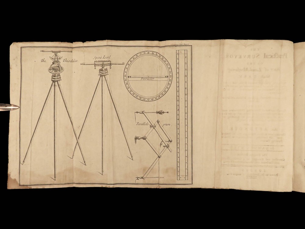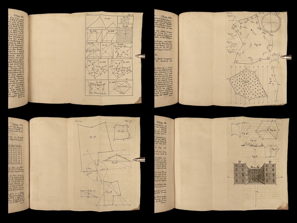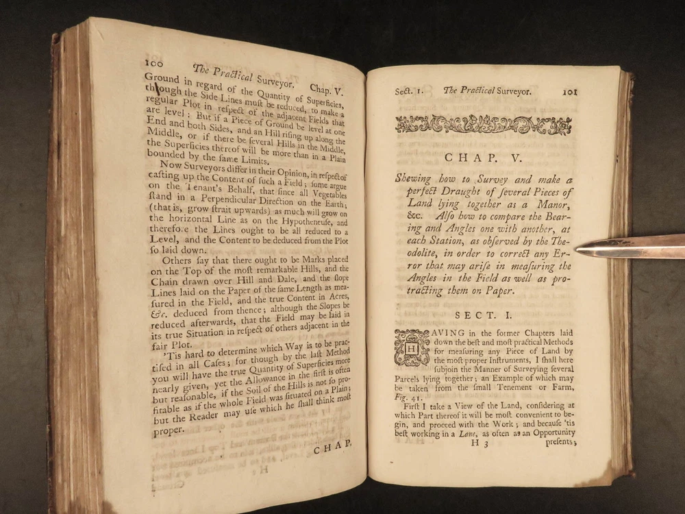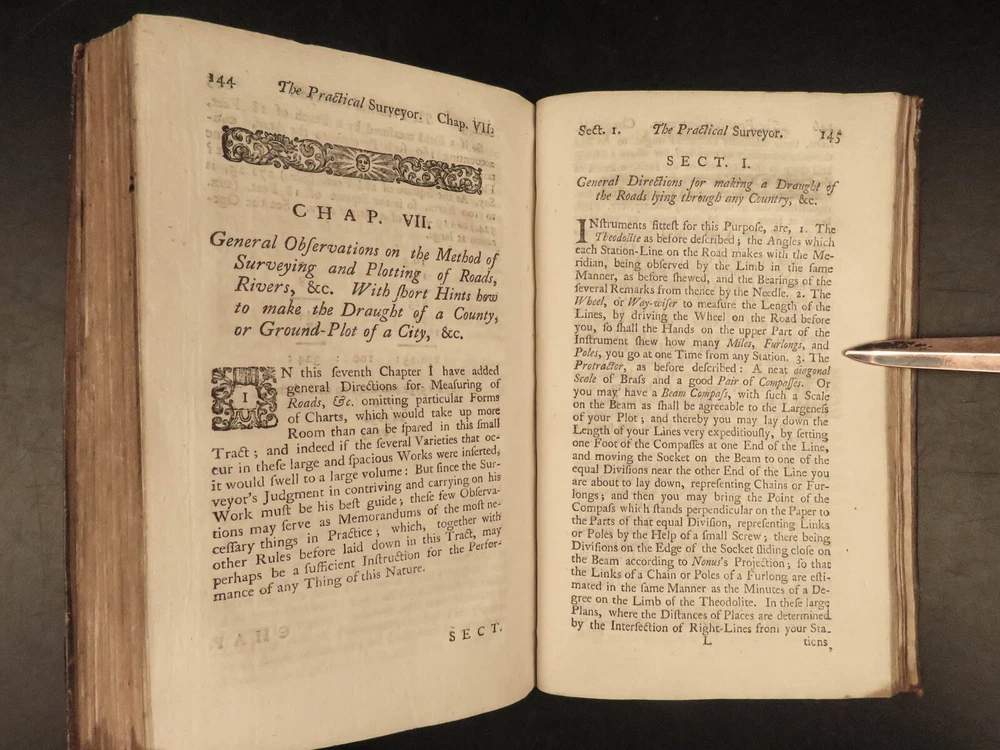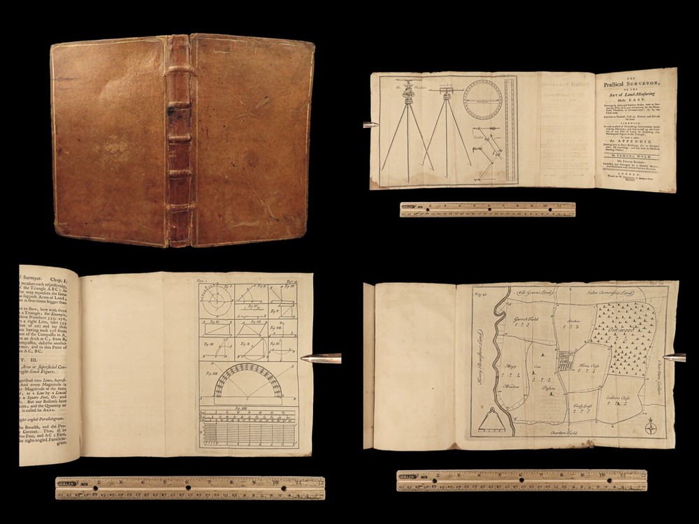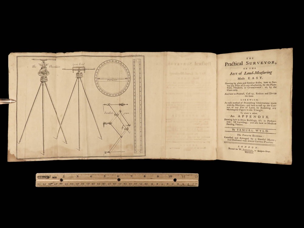 1760 Practical Surveyor Land Survey Geometry Illustrated Perspective Wyld Maps “ The Practical Surveyor ” is a rare 18 th -century treatise on surveying and land measuring by Samuel Wyld. First published in 1725, this book was one of the most comprehensive studies in land surveying methods describing various terrains and surveying equipment used in the 18 th -century. It is filled with numerous charts, illustrations, graphs, and engravings and this 1760 edition includes all of the expected folding illustrations. One particularly interesting section found in this work is Wyld’s instruction on how to use a compass. Item number: #25236 Price: $499 WYLD, Samuel The practical surveyor, or The art of land-measuring made easy London: Printed for W. Johnston, 1760. Details : · Collation: complete with all pages o viii, 191, [5] · Language: English · Binding: Leather; tight and secure · Size : ~8in X 5in (20cm x 13cm) Our Guarantee: Very Fast. Very Safe. Free Shipping Worldwide. Customer satisfaction is our priority! Notify us with 7 days of receiving, and we will offer a full refund without reservation! 25236