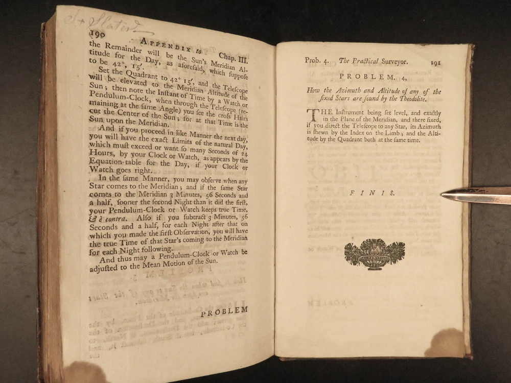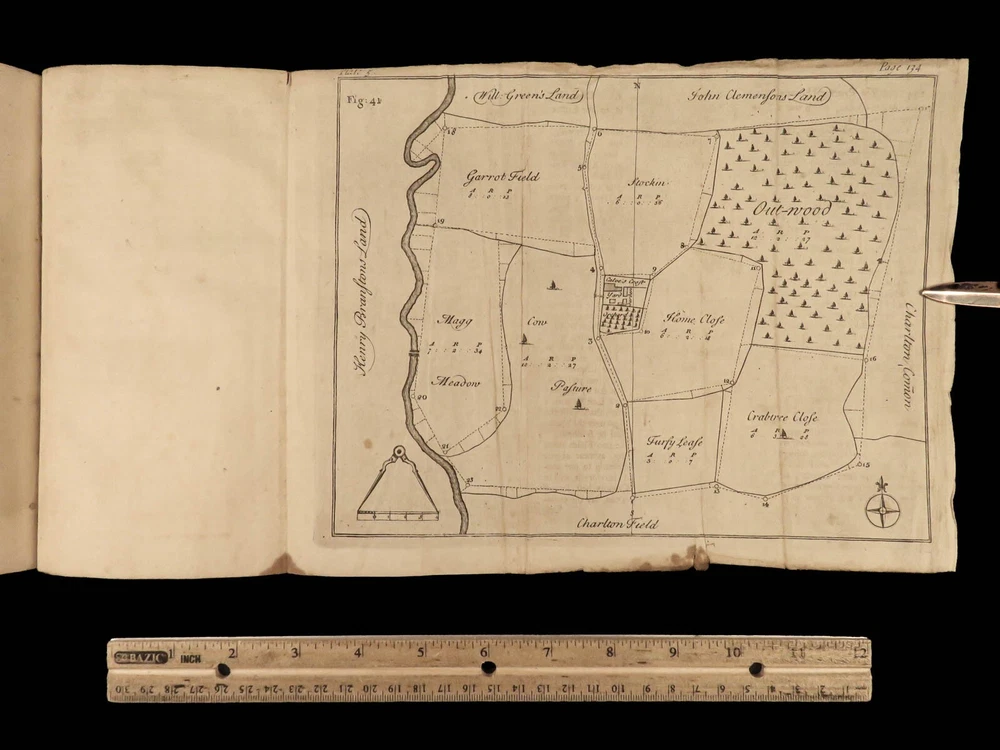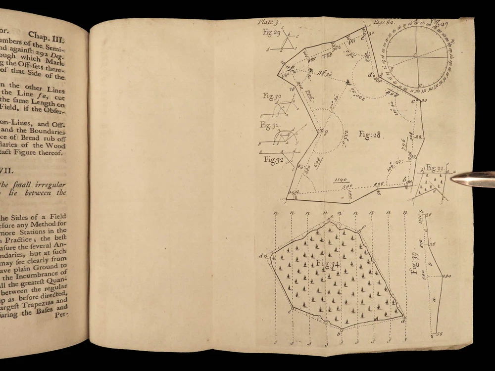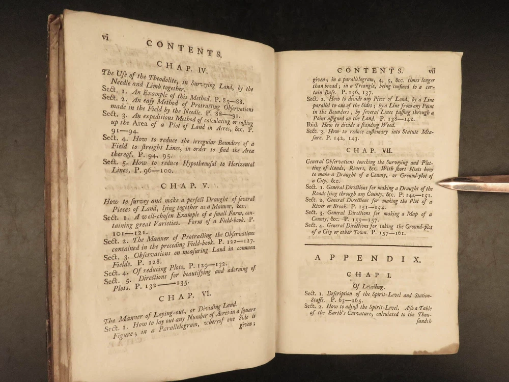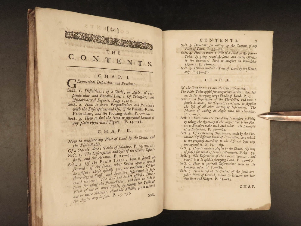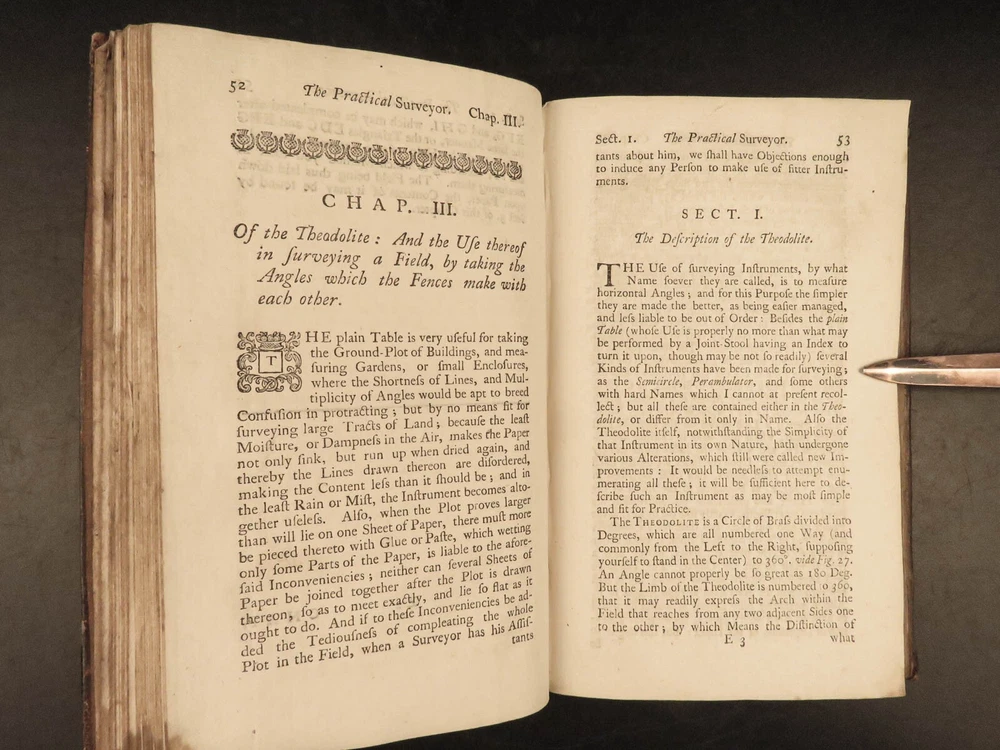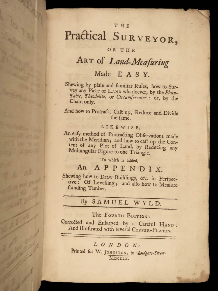 1760 Practical Surveyor Land Survey Geometry Illustrated Perspective Wyld Maps “ The Practical Surveyor ” is a rare 18 th -century treatise on surveying and land measuring by Samuel Wyld. First published in 1725, this book was one of the most comprehensive studies in land surveying methods describing various terrains and surveying equipment used in the 18 th -century. It is filled with numerous charts, illustrations, graphs, and engravings and this 1760 edition includes all of the expected folding illustrations. One particularly interesting section found in this work is Wyld’s instruction on how to use a compass. Item number: #25236 Price: $499 WYLD, Samuel The practical surveyor, or The art of land-measuring made easy London: Printed for W. Johnston, 1760. Details : · Collation: complete with all pages o viii, 191, [5] · Language: English · Binding: Leather; tight and secure · Size : ~8in X 5in (20cm x 13cm) Our Guarantee: Very Fast. Very Safe. Free Shipping Worldwide. Customer satisfaction is our priority! Notify us with 7 days of receiving, and we will offer a full refund without reservation! 25236