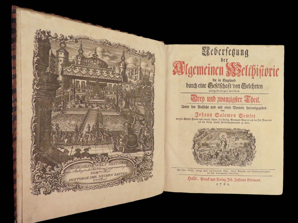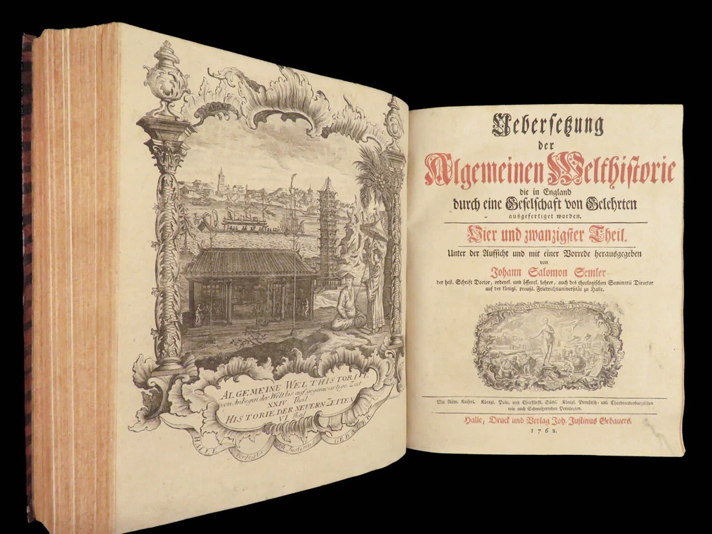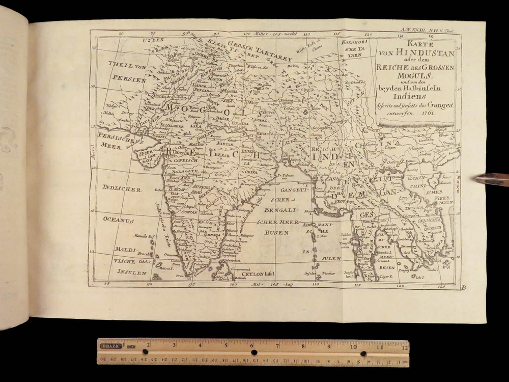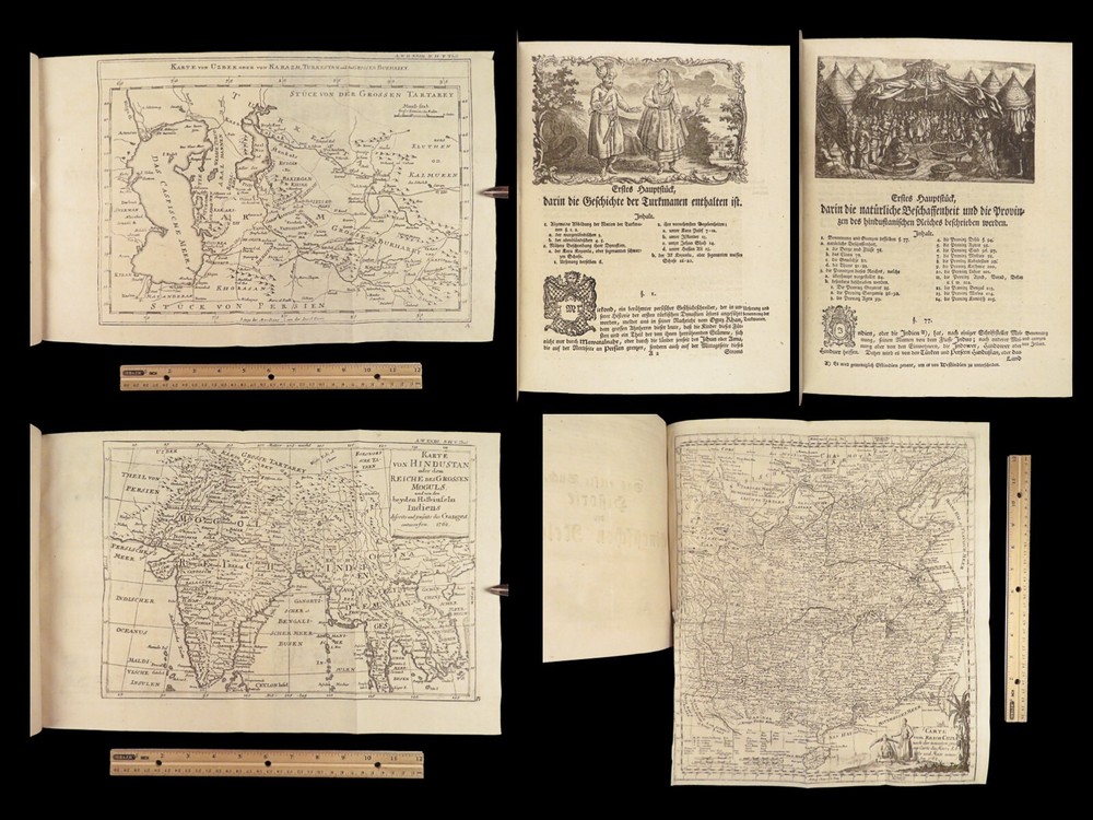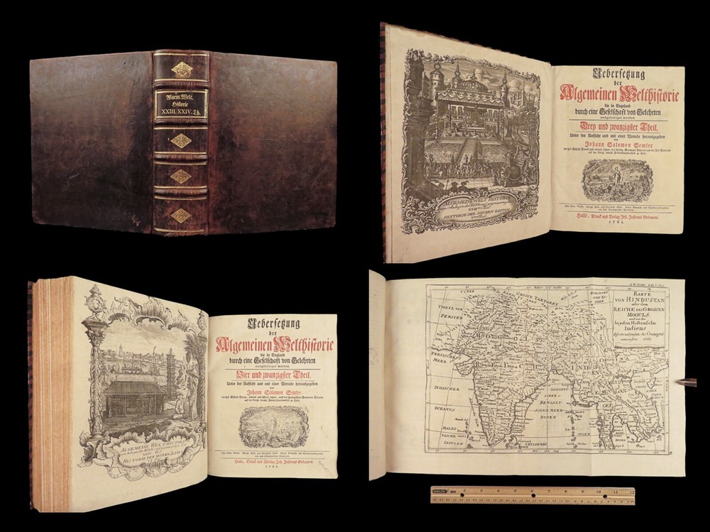 1761 ASIA 1 ed India HUGE MAPS Cambodia Laos Tonkin CHINA Siam PEGU Chinese Hindu The “ Allgemeinen Welthistorie ” was an 18 th -century historical journal collected to provide a complete and thorough history of the world. First edited by Siegmund Baumgarten and later by Johann Semler, this recurring work was a collection of articles by English scholars then translated and edited by Semler and Baumgarten – who Voltaire called ‘the crown of German scholars’. This particular tome covers interesting histories including: · History of the India, Persia, China, Southeast Asia · Chinnaballabaram, Gummi Palace · Extensive coverage of Hindustani religions, local tribes · Rulers and kings of Pegu, Hathawaddy Kingdom, and Burma and Laos, Cambodia, Singapore, Siam, Tonkin, o Portuguese Jesuit missionaries Item number: #26398 Price: $750 BAUMGARTEN, Siegmund Jacob; SEMLER, Johann Uebersetzung der Algemeinen Welthistorie die in Engeland durch eine Geselschaft von Gelehrten ausgefertiget worden Halle: Verlag Joh. Justinus Gebauers, 1761. 1 st edition Details : · Collation: Complete with all pages o Vol. XXIII – 29, [1]; 678, [34] o Vol. XXIV – 38; 660 o 3 maps, folding § Middle East, Persia § India & Southeast Asia § Eastern China · Language: German · Binding: Leather; tight and secure · Size : ~9.75in X 8.25in (25cm x 21cm) Our Guarantee: Very Fast. Very Safe. Free Shipping Worldwide. Customer satisfaction is our priority! Notify us with 7 days of receiving, and we will offer a full refund without reservation! 26398