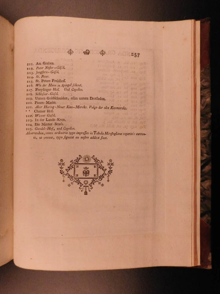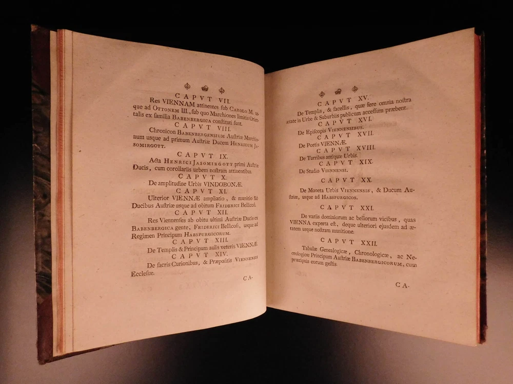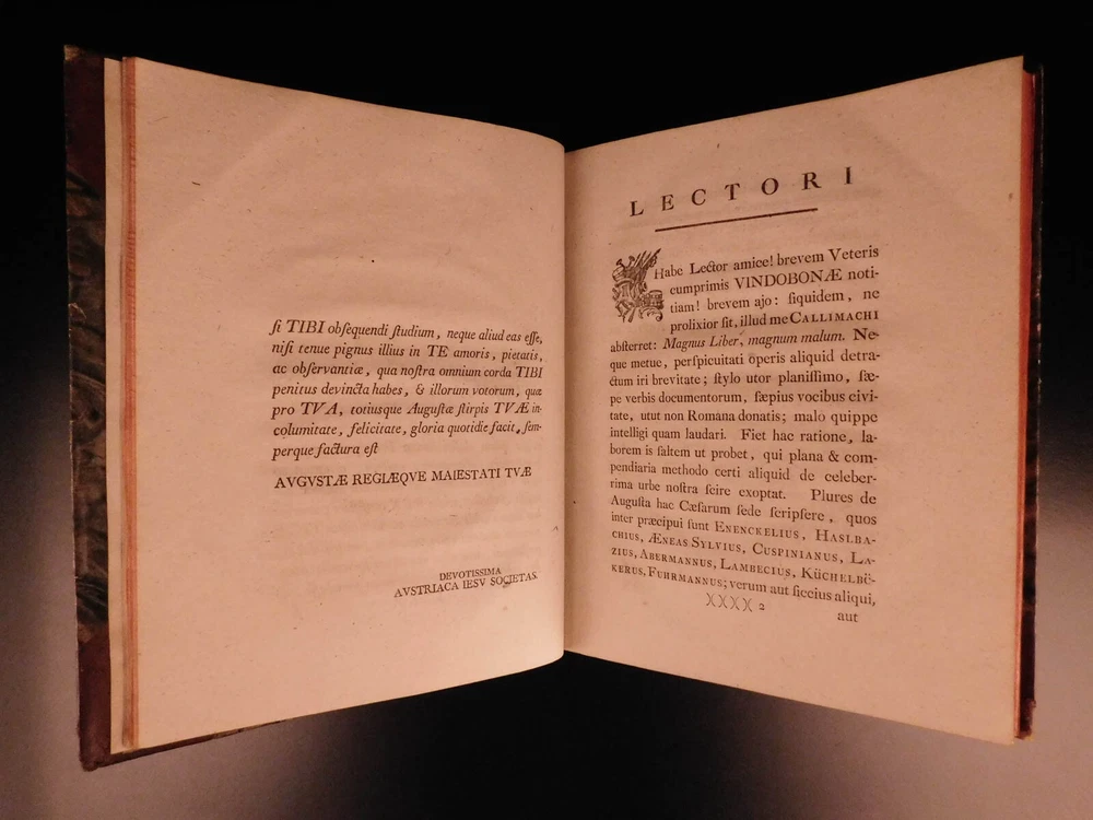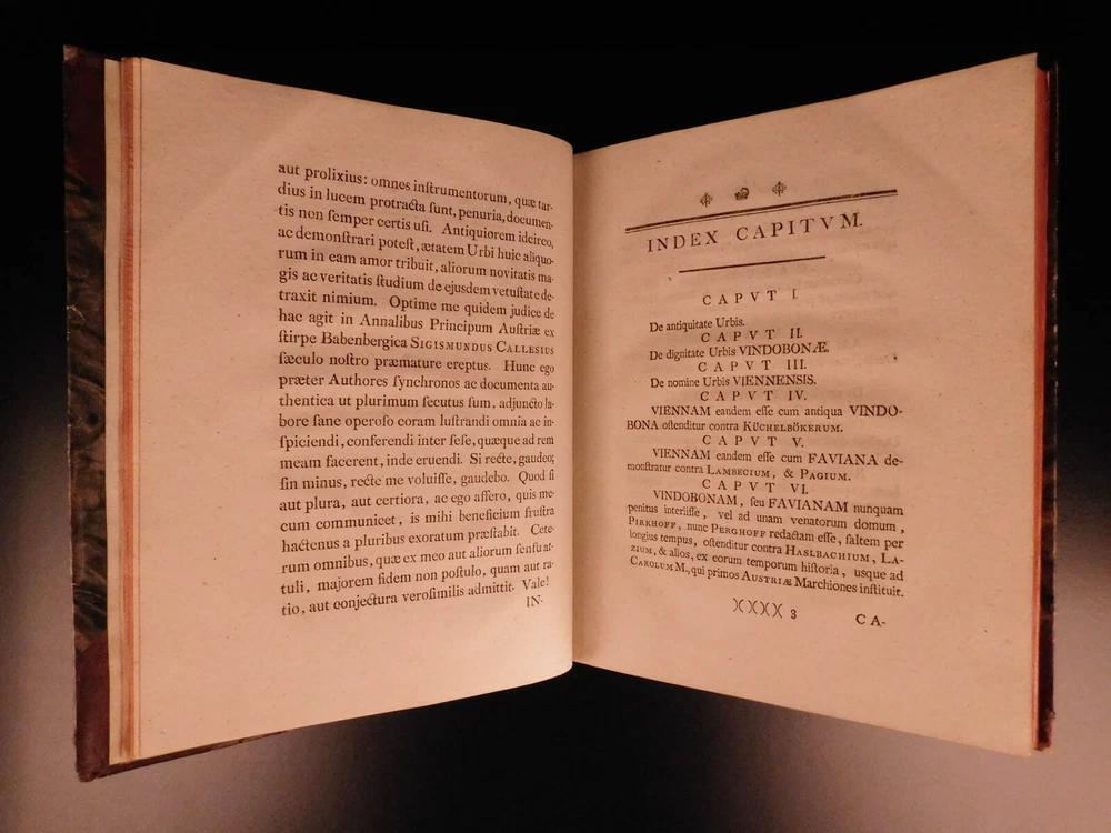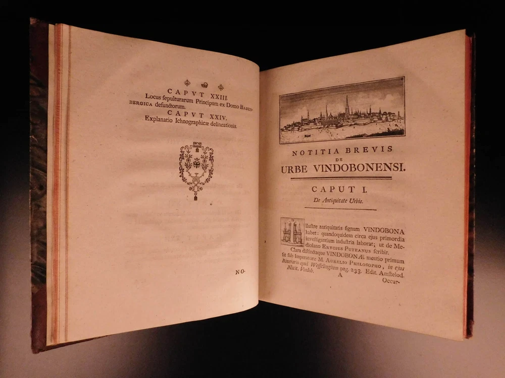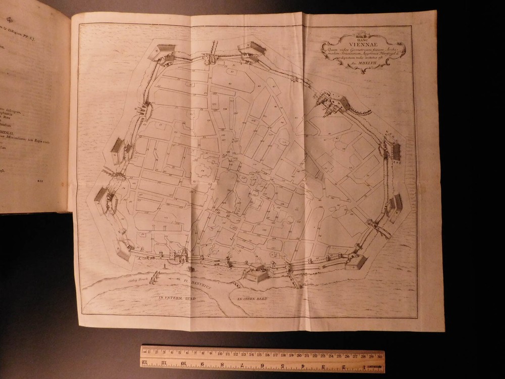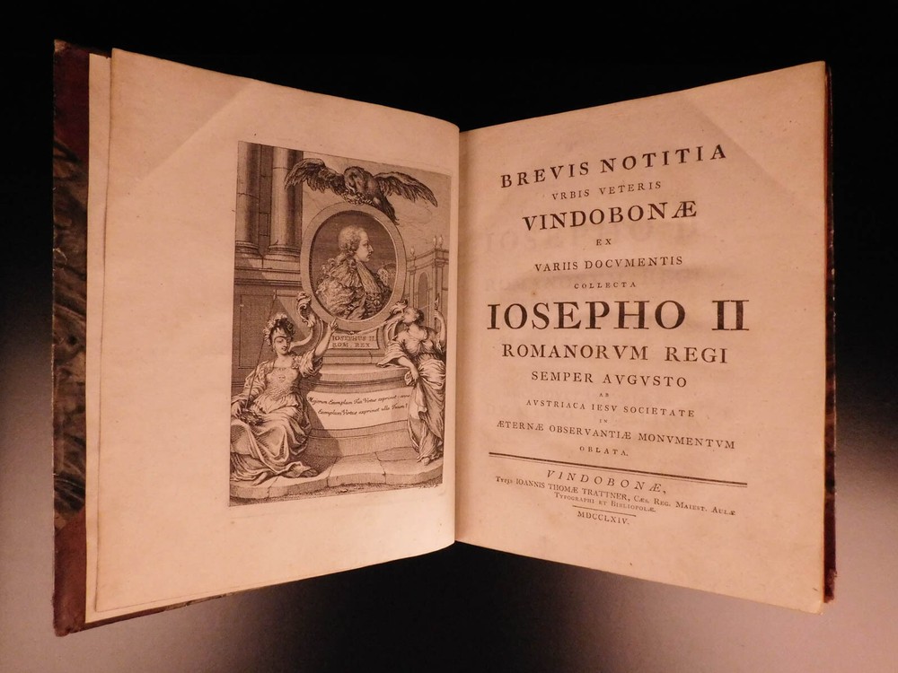 1764 1 ed History Vienna Austria Jesuit Leopold Fischer MAP Joseph II Illustrated A rare first edition of Leopold Fischer’s history of Vienna. Dedicated to Joseph II of the Holy Roman Empire, ‘Veteris Vindobonae’ is a work that documented the basics of the city through the lens of a Jesuit author. This work features an impressive folding map of the city of Vienna as well as a vignette of a ‘bird’s-eye-view’ of the city at the first chapter. Item number: #8015 Price: $599 FISCHER, Leopold Brevis notitia vrbis veteris Vindobonae ex variis docvmentis collecta, Iosepho II Romanorvm regi semper avgvsto ab Avstriaca Iesv Societate in aeternae observantiae monvmentvm oblata. Vindobonae [Vienna] Typis Ioannis Thomae Trattner, 1764. Details : · Collation: Complete with all pages o [32], 257, [1] o 1 folding map; 10 folding tables · References: de Backer III 756 · Language: Latin · Binding: Leather; tight & secure · Size : ~10in X 8in (25.5cm x 20cm) Our Guarantee: Very Fast. Very Safe. Free Shipping Worldwide. Customer satisfaction is our priority! Notify us with 7 days of receiving, and we will offer a full refund without reservation! 8015