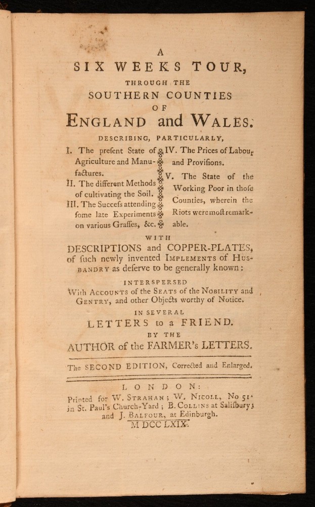 Click here to see our other books! A Six Weeks Tour Through the Southern Counties of England and Wales Arthur Young 1769 W. Strahan; W. Nicoll; B. Collins : London 8.5" by 5.5" xi [2], 2-377 [17]pp SUMMARY The second edition of agriculturalist Arthur Young's account of his travels around England and Wales. Early Edition,Folding Maps,Leather Binding Overall Condition: Very Good This book weighs 1 KG when packed UK Postage: £ 3.99 US Postage: £ 22.99 EU Postage : £ 16.99 European Postage: £ 17.99 Asia Postage: £ 22.99 Worldwide Postage: £ 28.99 DESCRIPTION The second edition of this work, first published the year prior. Illustrated with a folding engraved frontispiece. This work includes discussion of agricultural practices in each region visited, including methods of soil cultivation, the price of labour, and the state of the working poor. ESTC T139688 With the armorial bookplate of Rev Gervas Lowell to the front pastedown. Young is viewed as a major English writer on agriculture, and an early contributor to agricultural economics. He is also known as a social and political observer. CONDITION In a full calf binding. Rubbing to back strip head and tail, joints, and rear board perimeters. Joints starting, with boards firmly held. Armorial bookplate to front pastedown. Internally, generally firmly bound, but with one leaf - page 79-80 - detached and loosely inserted. Light spotting to title page head, and to head of frontispiece. Pages lightly age toned due to paper type, but clean. Overall Condition: Very Good GLOSSARY OF TERMS Overall Condition (Dustwrapper condition rating is shown after that for the book itself, where a dustwrapper is present) Fine - Very well preserved copy showing very little wear Very Good Indeed - Only one or two minor faults, really a very attractive copy Very Good - Quite a wide term meaning no major faults but probably several smaller ones often expected given the age of the book, but still a respectable copy Good - Meaning not very good. Some more serious faults as will be described in the condition report under 'condition' Good Only - Meaning one or more faults that could really do with repair Fair - As with good only above but with other faults leaving a compromised copy even after repair Poor - Really bad and possibly seriously incomplete. We only sell books in this condition where their rarity or value makes them attractive none the less. Major defects will be described. GUARANTEE We offer a full money back guarantee on our descriptions. Please ask for details and conditions. We prefer PAYPAL. If you pay via PAYPAL we will post the item off the same or the next working day with the postage you have selected. Please note we cannot accept USD cheques