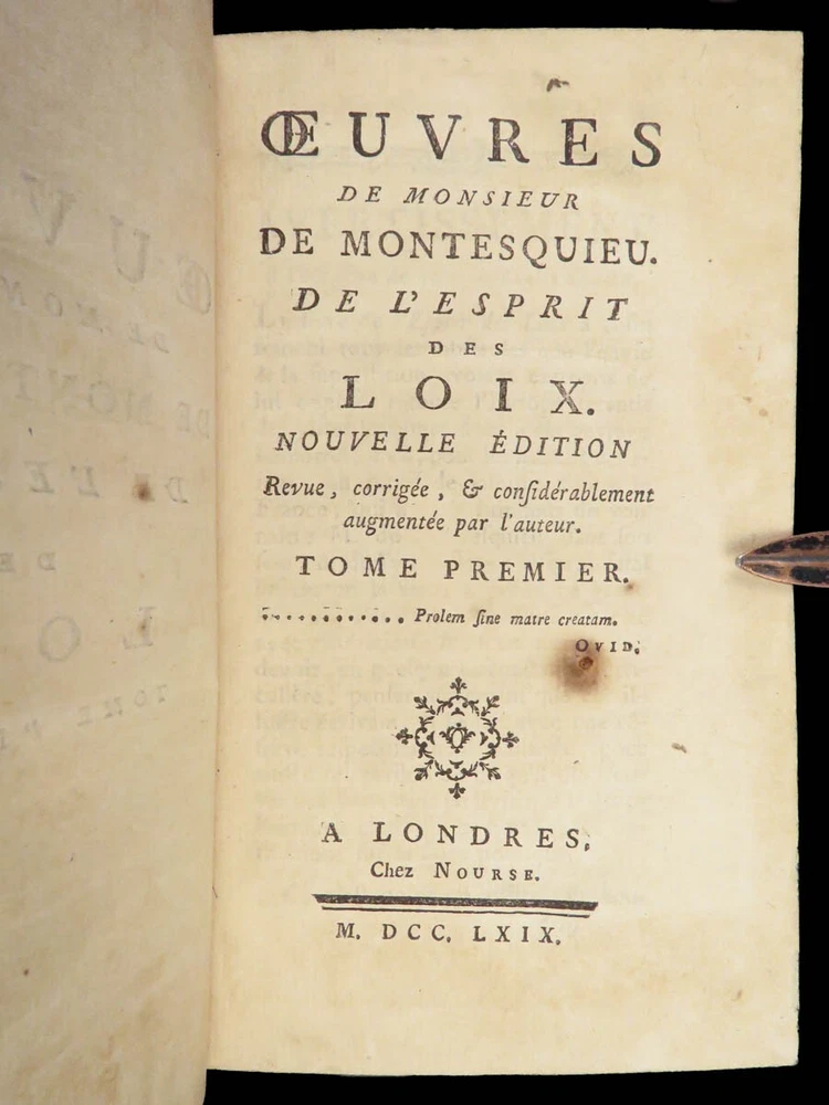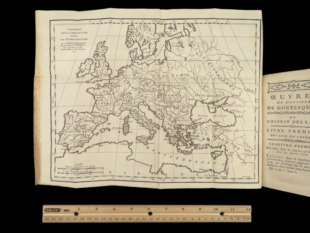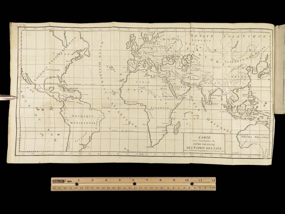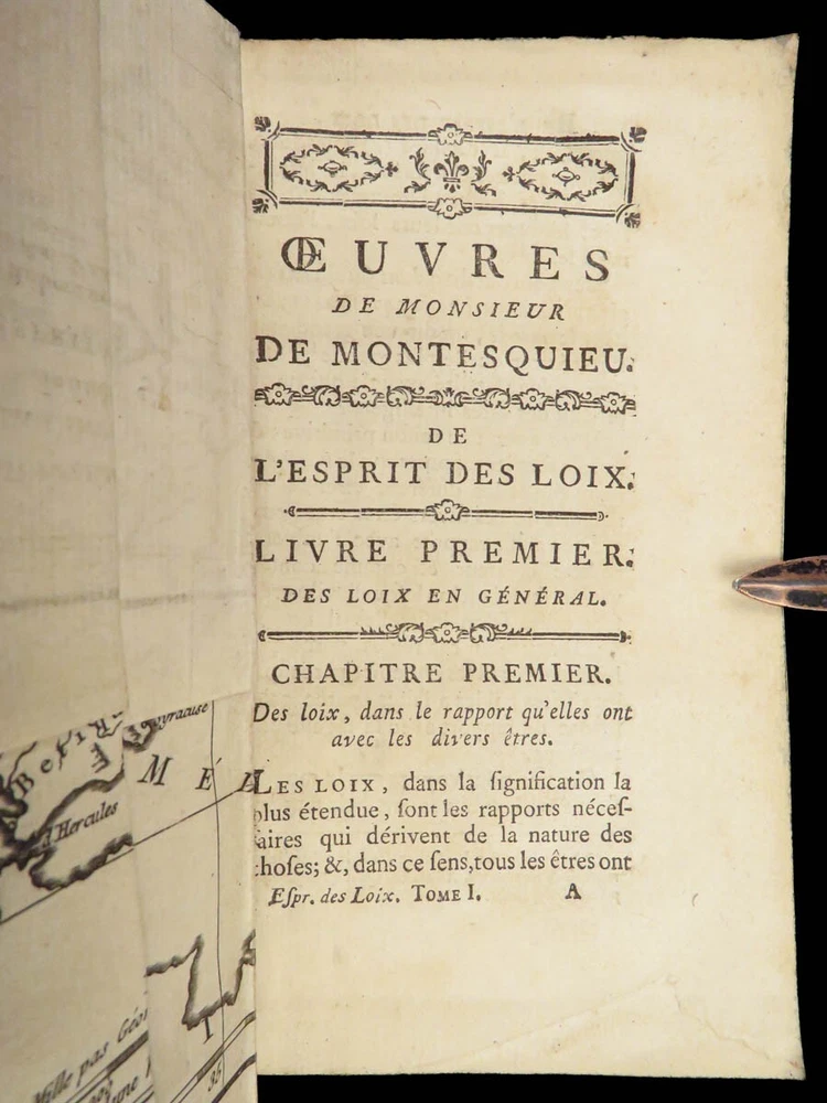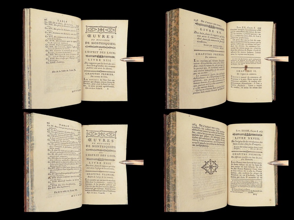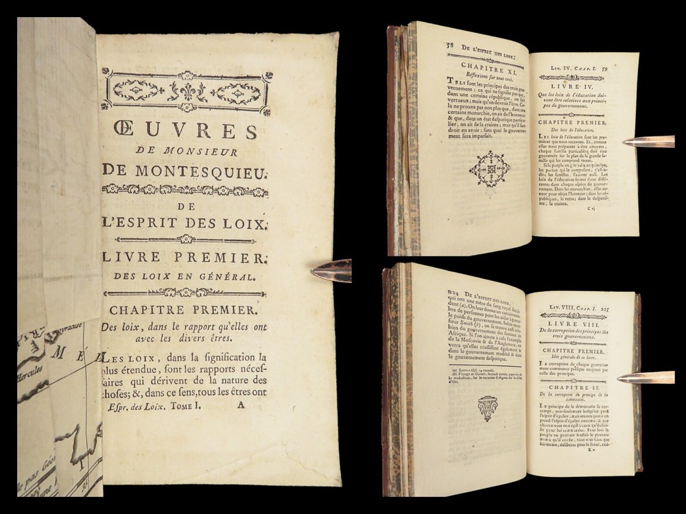 1769 Montesquieu Spirit of the Laws MAPS Political Government Democracy LAW 4v “Useless laws weaken the necessary laws.” ― Montesquieu , The Spirit of the Laws Charles-Louis de Montesquieu’s ‘ Spirit of the Laws’ is one of the most famous treaties ever written, especially on political theory. This work was so influential that world leaders such as Catherine the Great and the United States founding fathers applied the methods taught in this book to their culture’s future. This famed work found itself on the infamous ‘ Prohibited Book Index’ in 1751 even though it was well-respected and well-read around the world. Montesquieu lists a few major points in his work; points that have resonated with government for centuries. These include: · Separation of power · Liberty and democracy are one in the same · The point of civil and criminal law is to ensure personal security · Qualities and flaws of governmental types This 1769 French edition was published in as part of the complete works of Montesquieu. Item number: #27809 Price: $750 MONTESQUIEU, Charles-Louis de Oeuvres… De l'esprit des loix A Londres: Chez Nourse, 1769. Details : · Collation: Complete with all pages; 4 volumes o Vol. I –xliv, 24, 430 § 2 folding maps o Vol. II – xvi, 362 o Vol. III – xvi, 440 o Vol. IV – viii, 618 · Language: French · Binding: Leather; tight and secure · Size: ~6.75in X 4in (17cm x 10cm) Our Guarantee: Very Fast. Very Safe. Free Shipping Worldwide. Customer satisfaction is our priority! Notify us with 7 days of receiving, and we will offer a full refund without reservation!