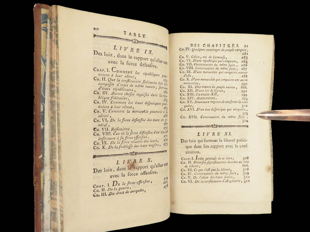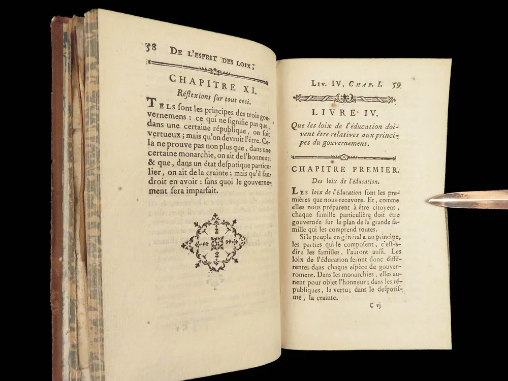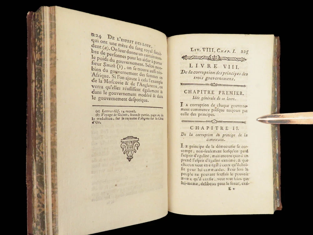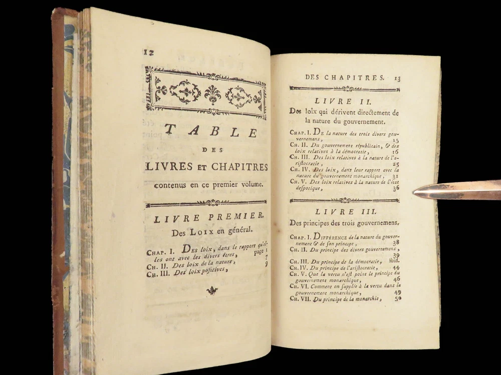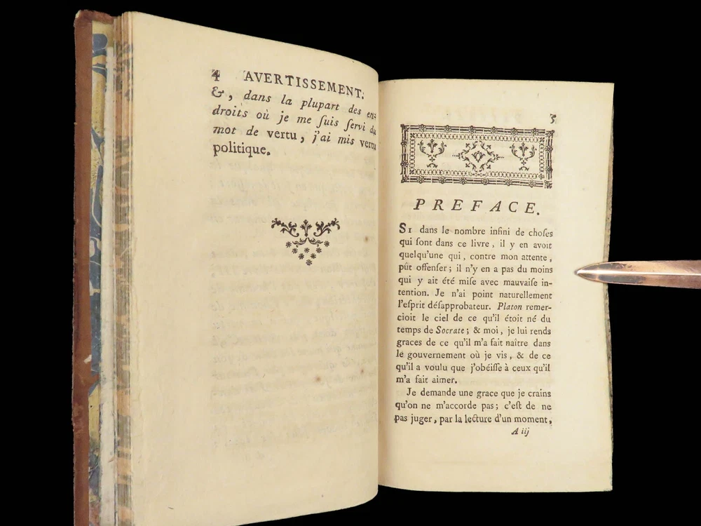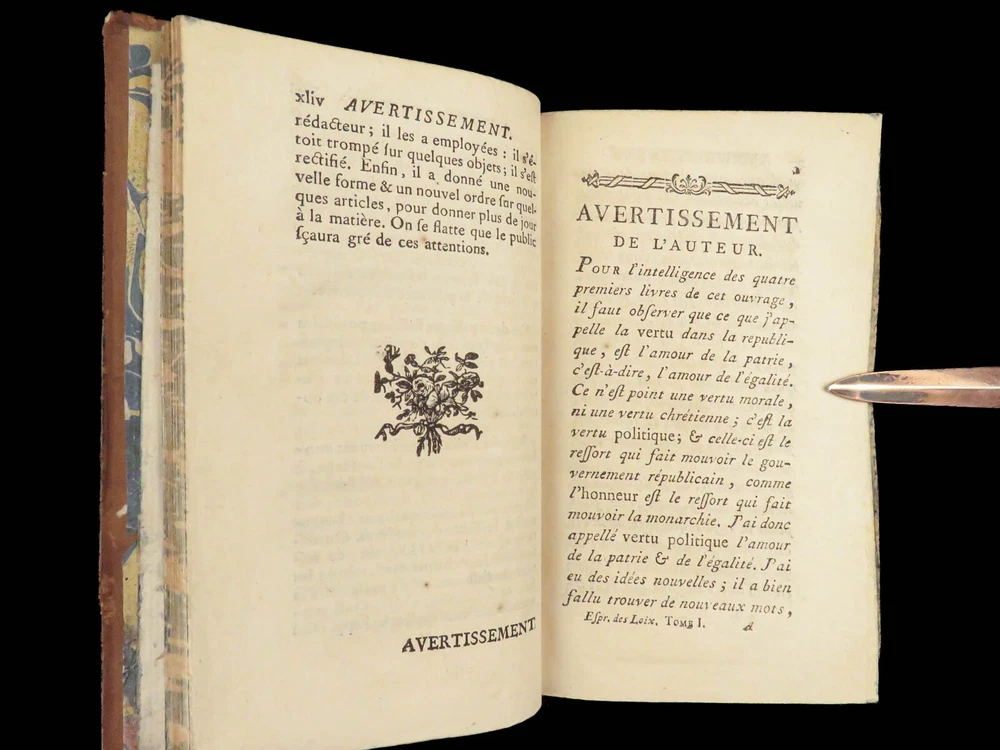 1769 Montesquieu Spirit of the Laws MAPS Political Government Democracy LAW 4v “Useless laws weaken the necessary laws.” ― Montesquieu , The Spirit of the Laws Charles-Louis de Montesquieu’s ‘ Spirit of the Laws’ is one of the most famous treaties ever written, especially on political theory. This work was so influential that world leaders such as Catherine the Great and the United States founding fathers applied the methods taught in this book to their culture’s future. This famed work found itself on the infamous ‘ Prohibited Book Index’ in 1751 even though it was well-respected and well-read around the world. Montesquieu lists a few major points in his work; points that have resonated with government for centuries. These include: · Separation of power · Liberty and democracy are one in the same · The point of civil and criminal law is to ensure personal security · Qualities and flaws of governmental types This 1769 French edition was published in as part of the complete works of Montesquieu. Item number: #27809 Price: $750 MONTESQUIEU, Charles-Louis de Oeuvres… De l'esprit des loix A Londres: Chez Nourse, 1769. Details : · Collation: Complete with all pages; 4 volumes o Vol. I –xliv, 24, 430 § 2 folding maps o Vol. II – xvi, 362 o Vol. III – xvi, 440 o Vol. IV – viii, 618 · Language: French · Binding: Leather; tight and secure · Size: ~6.75in X 4in (17cm x 10cm) Our Guarantee: Very Fast. Very Safe. Free Shipping Worldwide. Customer satisfaction is our priority! Notify us with 7 days of receiving, and we will offer a full refund without reservation!