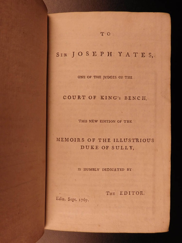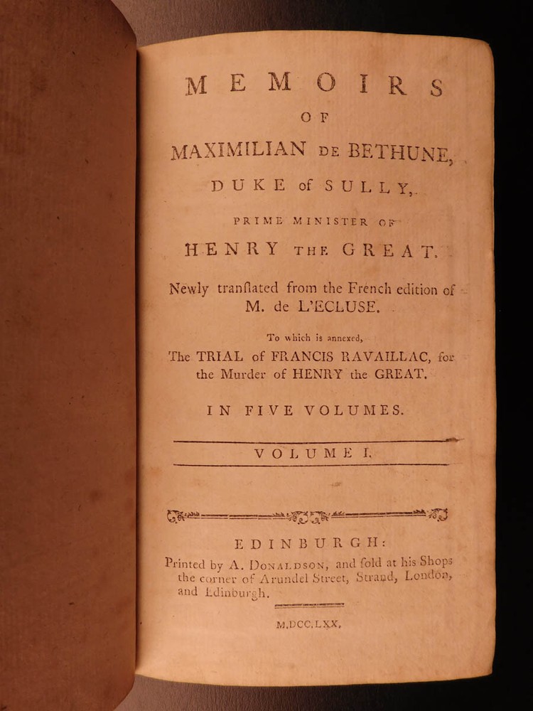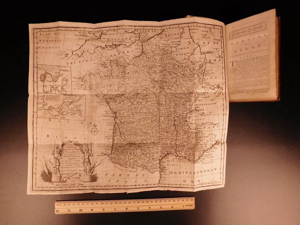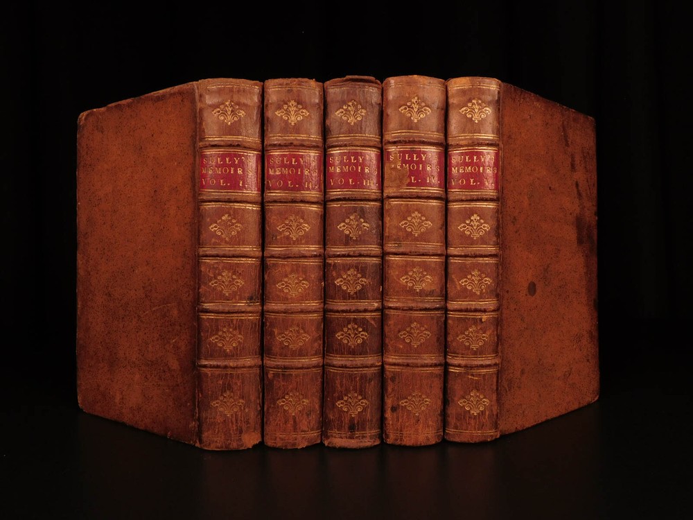 1770 Duke of Sully Memoires France Henry IV Huguenot Utopian Europe 5v SET Map “A very valuable memoire of the history of the reign of Henry IV” Maximlien de Bethune was a 16 th -century French statesman who was the first Duke of Sully. Most known for his service under Henry IV of France, Sully left a collection of memoirs which is now a valuable and important work on the history of France during the reign of Henry the Great. Even though ‘Memoires’ contains many fictitious stories, it is still recognized for its accuracy and portrayal of European royalty. The most controversial section of ‘Memoires’ is Sully’s vision of a utopian society designed for all of Europe. He envisioned a Christian republic that was governed by a ‘Very Christian Council’ in which all differences were resolved, and a military was complete removed. Some scholars even claim that Sully’s plan helped establish what would become the current European Union. According to Tulard, this work is a “very valuable memoire of the history of the reign of Henry IV.” Item number: #9642 Price: $599 BETHUNE, Maximilien de Duke of Sully Memoirs of Maximilian de Bethune, Duke of Sully, Prime Minister of Henry the Great. Newly translated from the French edition of M. de L'Ecluse. To which is annexed, the trial of Francis Ravaillac, for the murder of Henry the Great Edinburgh: Printed for A. Donaldson, and sold at his shops... Arundel Street, Strand, London, and Edinburgh, 1770. Details : · Collation: Complete with all pages; 5 volumes o Vol. I – [5], vi-xvi, [1], 409, [1] § Large folding map of France o Vol. II – [3], iv-viii, [1], 2-413, [1] o Vol. III – [3], iv-viii, [1], 2-430 o Vol. IV – [3], iv-viii, [1], 2-490 o Vol. V – [3], iv-vi, [1], 2-237, [181] · Language: English · Binding: Leather; tight & secure · Size : ~7in X 4.25in (17.5cm x 10.5cm) · Very rare and desirable Our Guarantee: Very Fast. Very Safe. Free Shipping Worldwide. Customer satisfaction is our priority! Notify us with 7 days of receiving, and we will offer a full refund without reservation! 9642