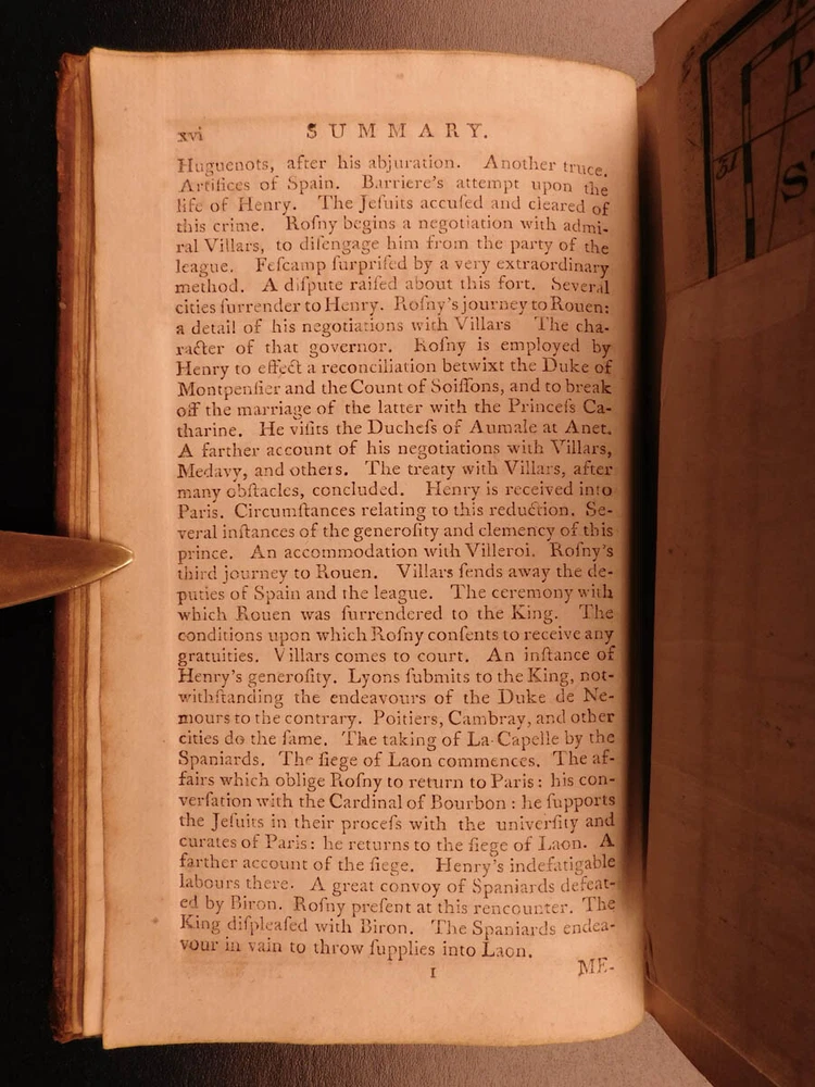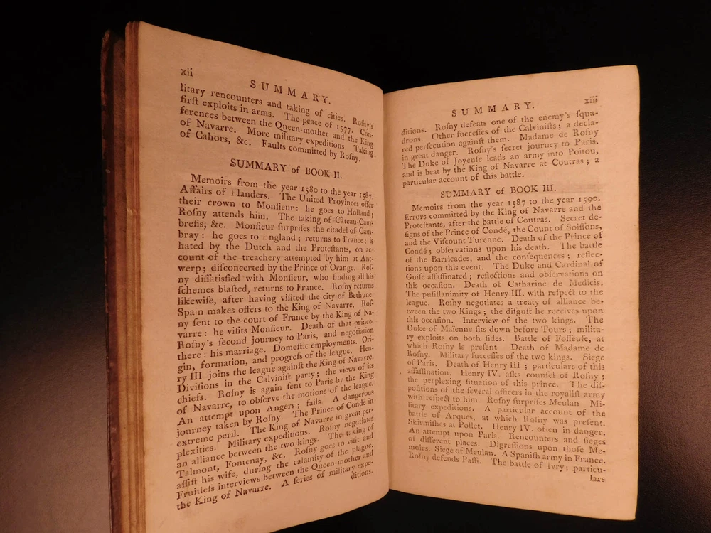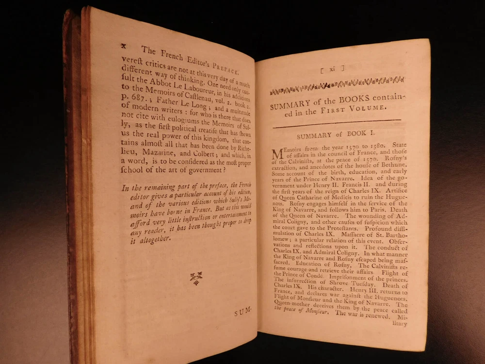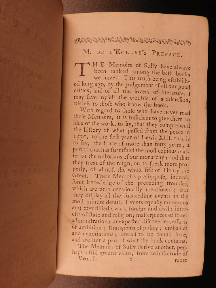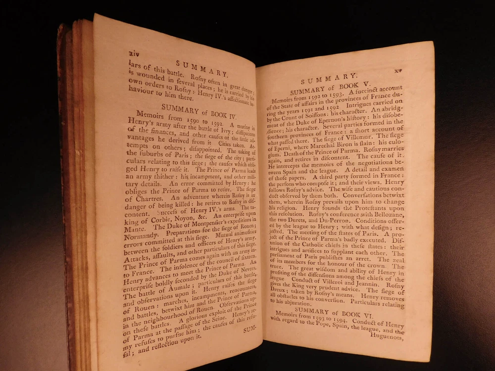 1770 Duke of Sully Memoires France Henry IV Huguenot Utopian Europe 5v SET Map “A very valuable memoire of the history of the reign of Henry IV” Maximlien de Bethune was a 16 th -century French statesman who was the first Duke of Sully. Most known for his service under Henry IV of France, Sully left a collection of memoirs which is now a valuable and important work on the history of France during the reign of Henry the Great. Even though ‘Memoires’ contains many fictitious stories, it is still recognized for its accuracy and portrayal of European royalty. The most controversial section of ‘Memoires’ is Sully’s vision of a utopian society designed for all of Europe. He envisioned a Christian republic that was governed by a ‘Very Christian Council’ in which all differences were resolved, and a military was complete removed. Some scholars even claim that Sully’s plan helped establish what would become the current European Union. According to Tulard, this work is a “very valuable memoire of the history of the reign of Henry IV.” Item number: #9642 Price: $599 BETHUNE, Maximilien de Duke of Sully Memoirs of Maximilian de Bethune, Duke of Sully, Prime Minister of Henry the Great. Newly translated from the French edition of M. de L'Ecluse. To which is annexed, the trial of Francis Ravaillac, for the murder of Henry the Great Edinburgh: Printed for A. Donaldson, and sold at his shops... Arundel Street, Strand, London, and Edinburgh, 1770. Details : · Collation: Complete with all pages; 5 volumes o Vol. I – [5], vi-xvi, [1], 409, [1] § Large folding map of France o Vol. II – [3], iv-viii, [1], 2-413, [1] o Vol. III – [3], iv-viii, [1], 2-430 o Vol. IV – [3], iv-viii, [1], 2-490 o Vol. V – [3], iv-vi, [1], 2-237, [181] · Language: English · Binding: Leather; tight & secure · Size : ~7in X 4.25in (17.5cm x 10.5cm) · Very rare and desirable Our Guarantee: Very Fast. Very Safe. Free Shipping Worldwide. Customer satisfaction is our priority! Notify us with 7 days of receiving, and we will offer a full refund without reservation! 9642