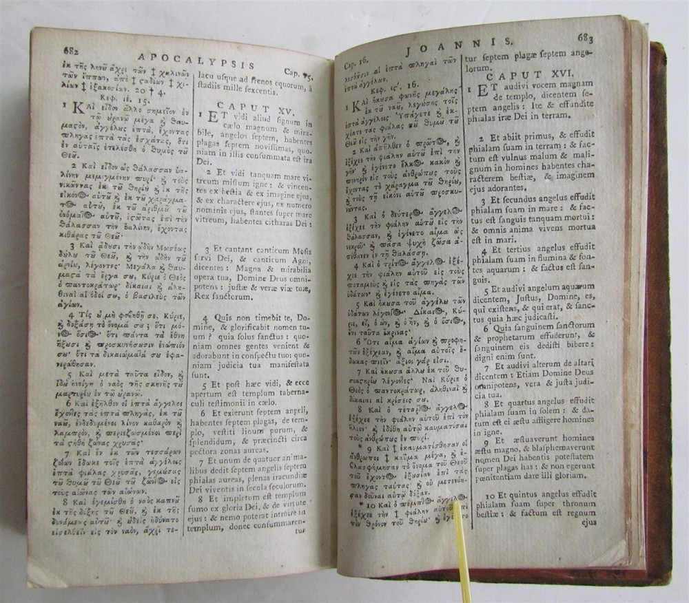 Lugduni Batavorum, Apud Wetstenios Londini, Apud Johannem Nourse; 1772 Size 3 3/4 by 6 1/4" Folding map [6] 699 pp. Repaired spine Some toning. Otherwise very good condition Text in Greek and Latin in 2 columns ======================== Johannes Leusden (1624-1699) is a Dutch Calvinist theologian and an Orientalist. Born in Utrecht,He studied in Amsterdam to become a Professor of Hebrew in his hometown. He is then the most prominent Bible expert of his time and has written several works on the Bible and Hebraic philology In 1660, in collaboration with the rabbi of Amsterdam and the printer Joseph Athias, he published his Biblia Hebraica, the first edition of the Hebrew Bible with numbered verses -------------- Please see my other auctions Refund Policy: We will issue a FULL REFUND, 100% money back if you are not satisfied with your purchase. Items must be returned to us within 20 days in order to receive a refund or replacement. Buyer is responsible for shipping costs. Powered by SixBit's eCommerce Solution