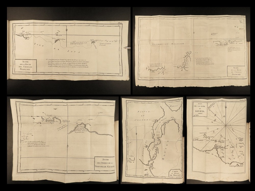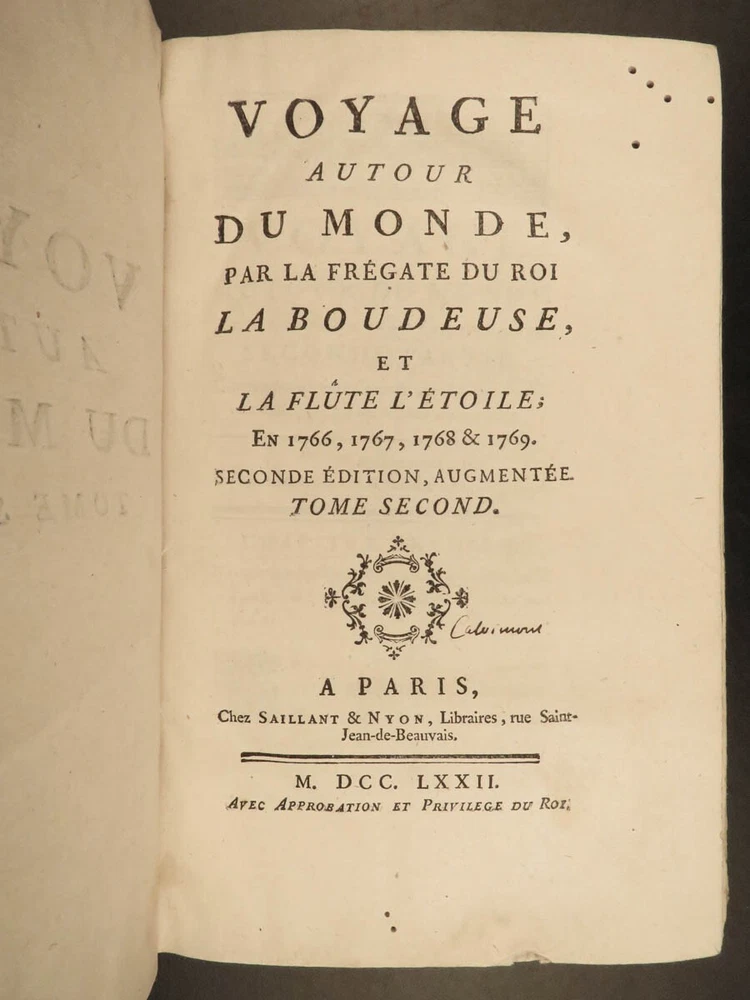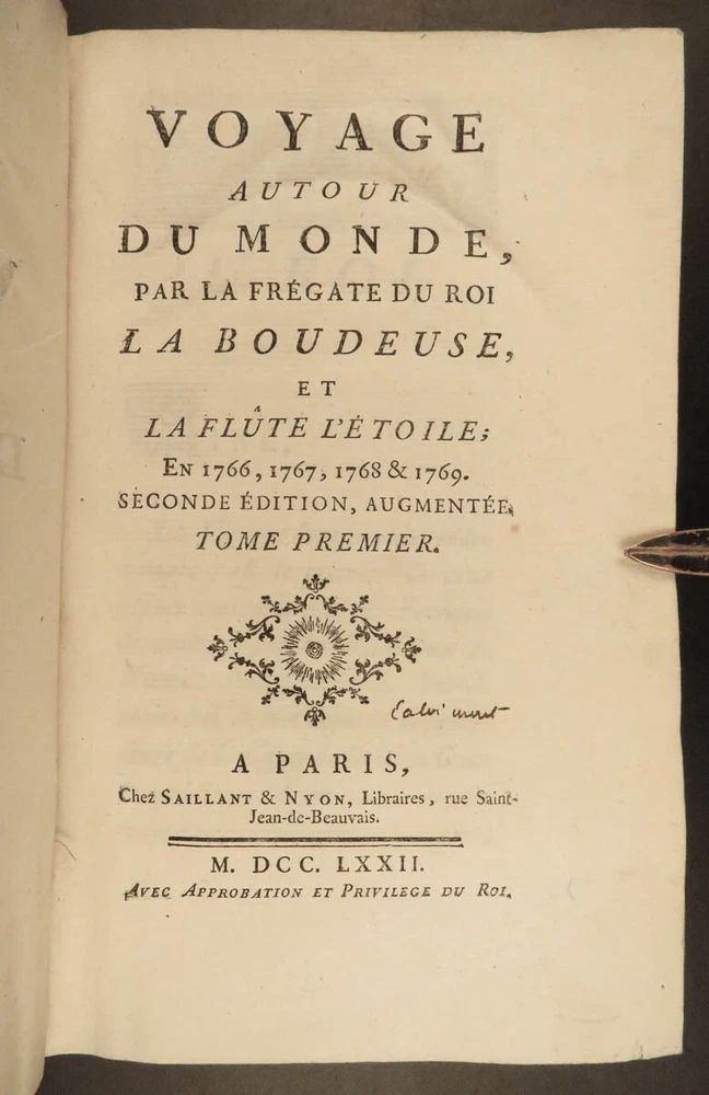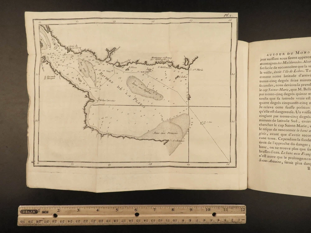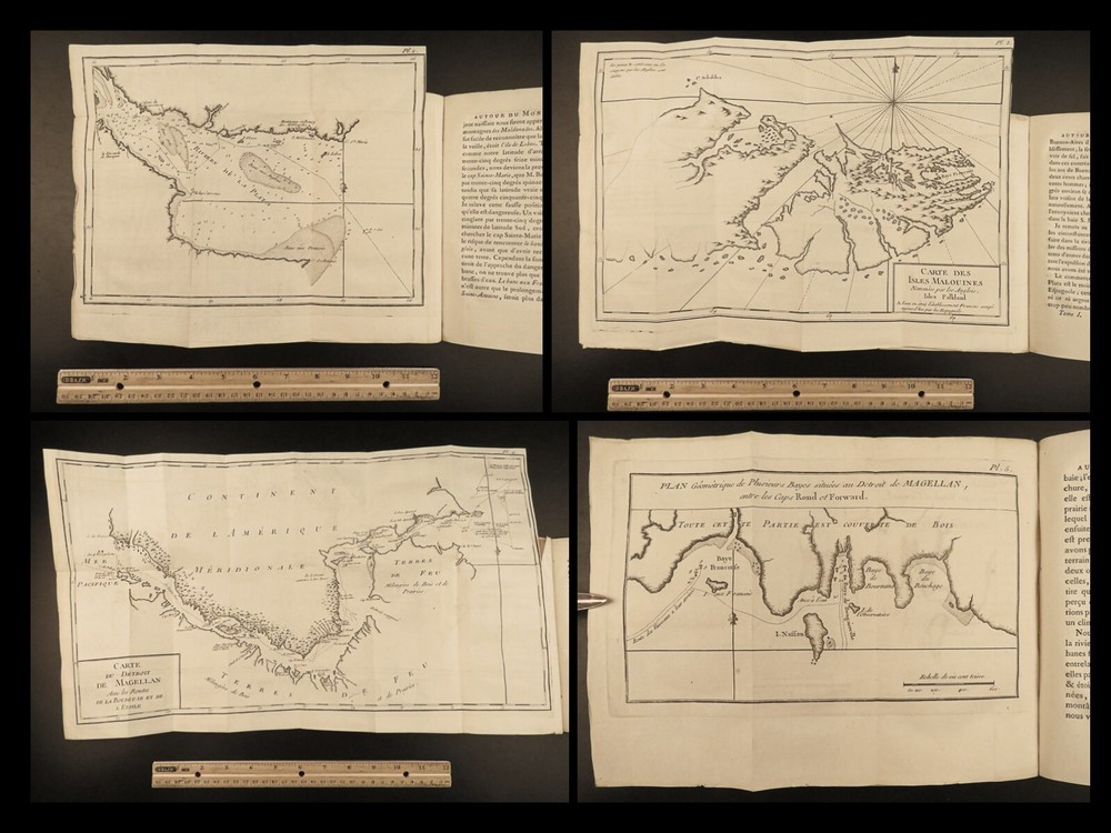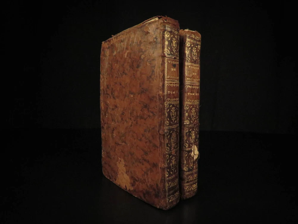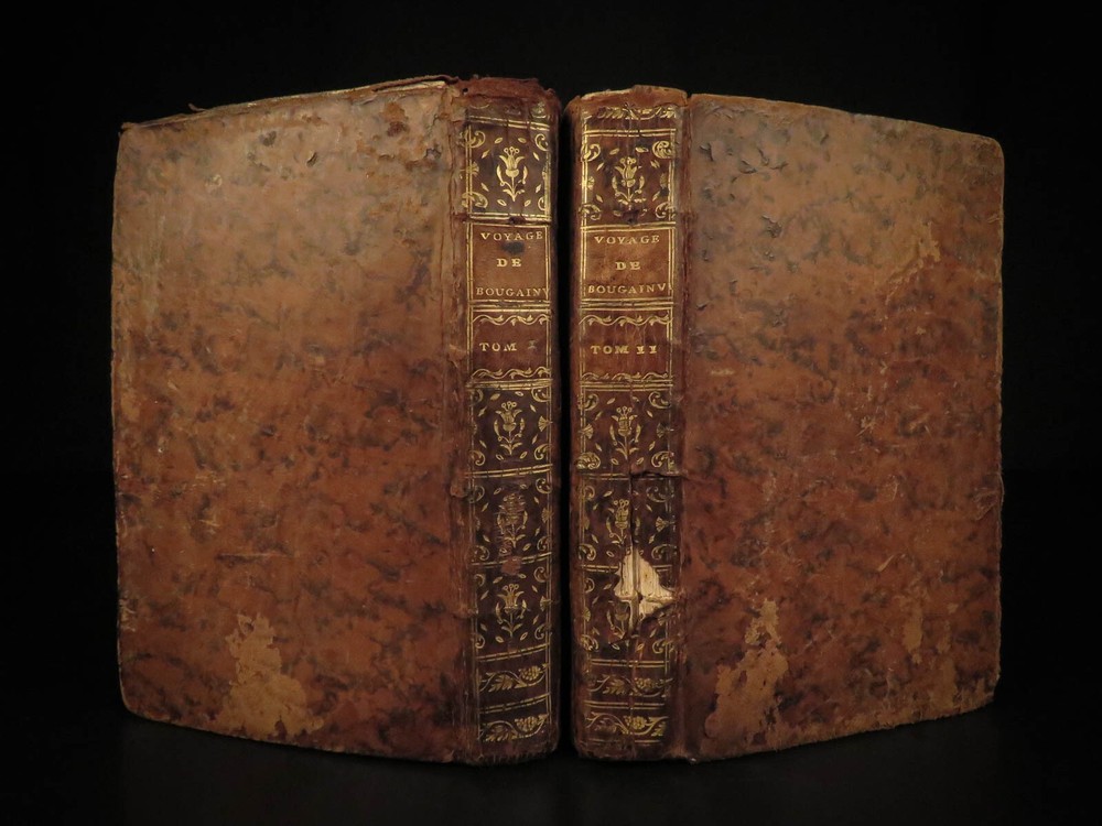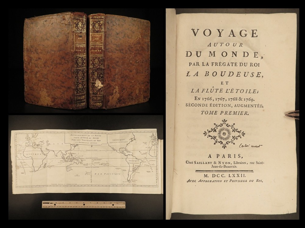 1772 Voyages of Louis Bougainville Pacific Ocean TAHITI Falkland Islands MAPS 2v SET Louis Antoine de Bougainville was an 18 th -century French explorer who, after serving in the American Revolution, gained notoriety for his attempt to circumnavigate the world. This voyage became famous for being the first expedition to make records of the Falkland Islands and other islands near Papua New Guinea. The two-ship expedition which began in 1766 spent much time in Tahiti and Samoa gaining information on the local tribes, and much of what we know now of these peoples is attributed to Bougainville and his expedition. Item number: #21910 Price: $1500 BOUGAINVILLE, Louis Antoine de Voyage autour du monde, par la frégate du Roi la Boudeuse et la Flûte l'Étoile A Paris: Chez Saillant & Nyon, 1772. Details : · Collation: Complete with all pages; 2 volumes o Vol. I – [8], xliii, [1], 336 o Vol. II – [4], 453, [3] o 15 folding illustrations/maps · Language: French · Binding: Leather; tight and secure · Size : ~8in X 5in (20cm x 13cm) · Very rare and desirable with auction records and price comparisons at $3,000 Our Guarantee: Very Fast. Very Safe. Free Shipping Worldwide. Customer satisfaction is our priority! Notify us with 7 days of receiving, and we will offer a full refund without reservation! 21910
