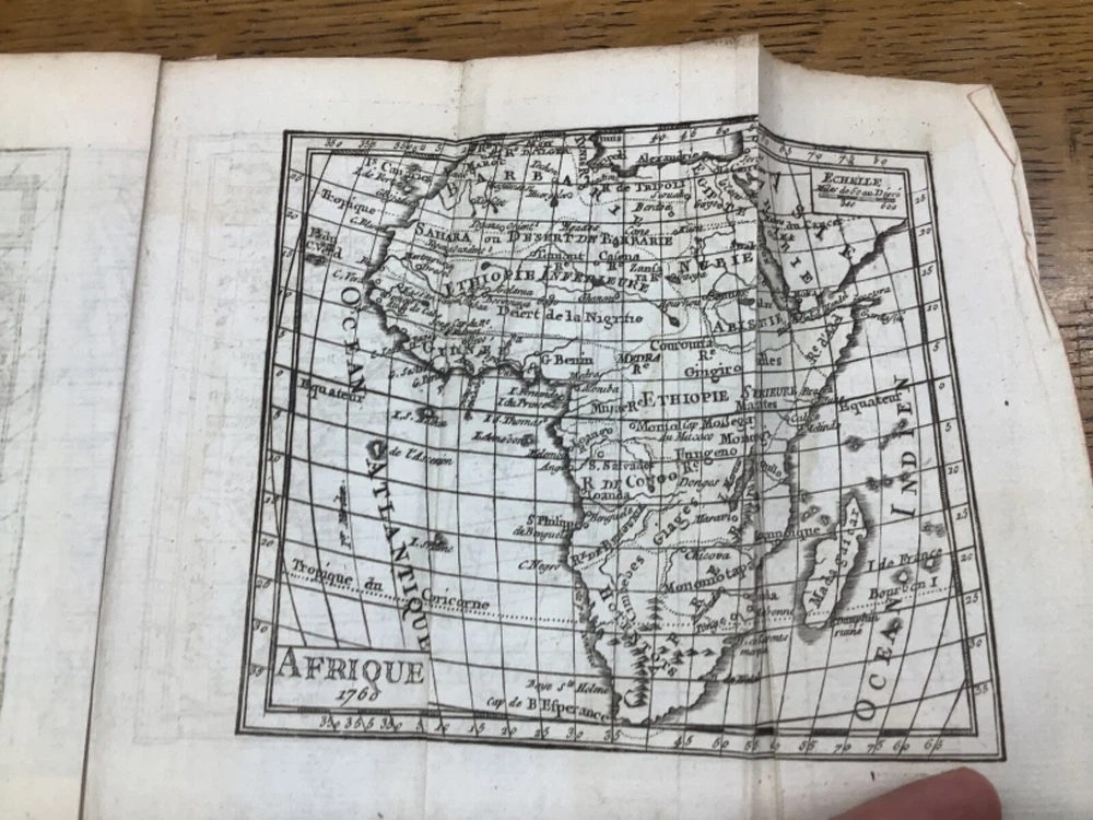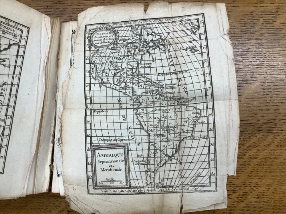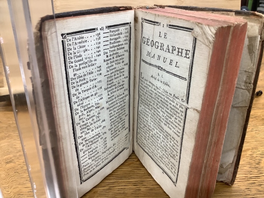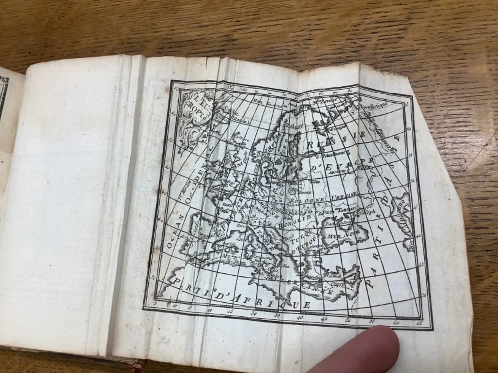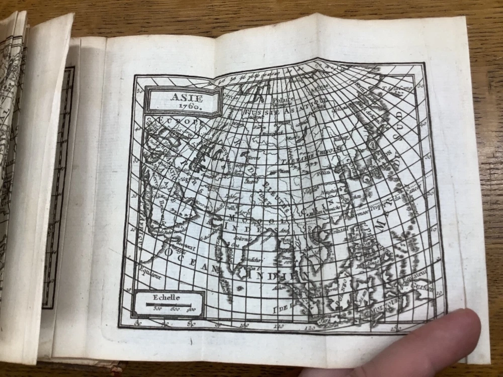 Le Chronologiste Manuel - The Manual Chronologist. Printed in Paris C. 1774. 456 pp, 5.25 x 3.5”, 32mo, full leather. In fair condition, with both boards attached. Wear to edges of boards, primarily on the front. Hinges worn, primarily towards the front and the back. Text block is intact with some hinge wear around p. 312. Some wear to head and tail of outer spine, with part of title label missing. Contains 5 maps, and may have included others (please reference 9th photograph): Europe, Africa, France, Asia, and North and South America, the latter of which is detached but included. Slight age-related toning to pages. Please see photographs and ask any questions prior to purchasing. A rare and unique geography book, especially for its maps, especially the one of the Americas, which was created shortly before the American Revolution and has French Louisiana noted. FORN-ABE-MSB-1021-Shelf-574-aj524