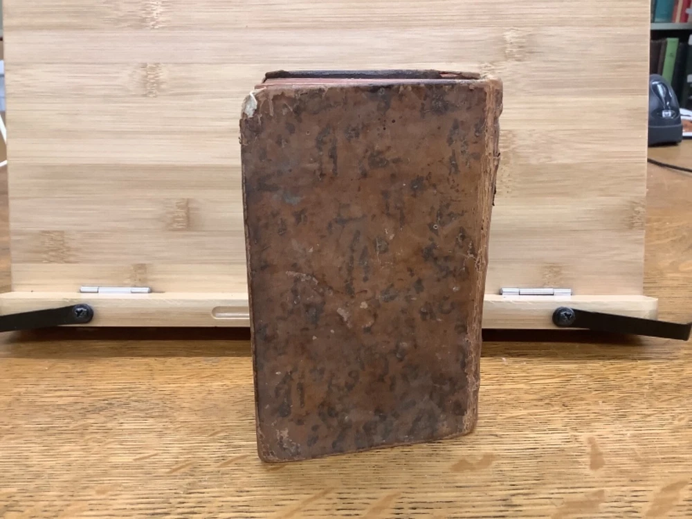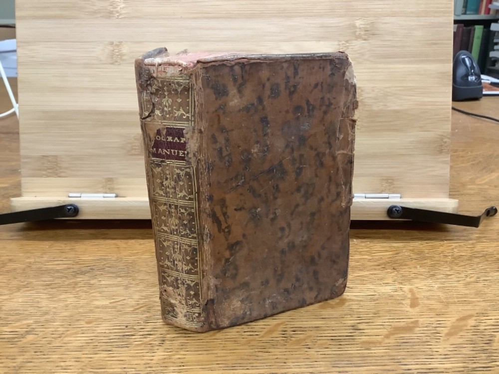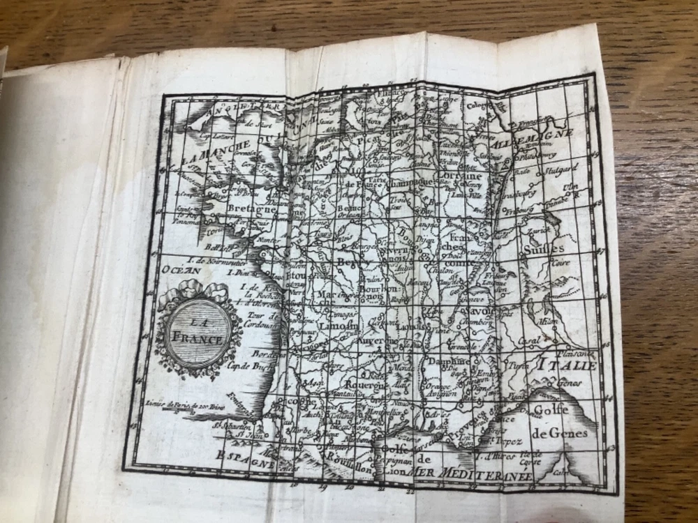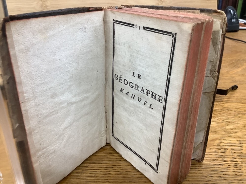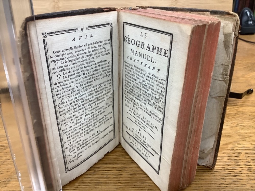 Le Chronologiste Manuel - The Manual Chronologist. Printed in Paris C. 1774. 456 pp, 5.25 x 3.5”, 32mo, full leather. In fair condition, with both boards attached. Wear to edges of boards, primarily on the front. Hinges worn, primarily towards the front and the back. Text block is intact with some hinge wear around p. 312. Some wear to head and tail of outer spine, with part of title label missing. Contains 5 maps, and may have included others (please reference 9th photograph): Europe, Africa, France, Asia, and North and South America, the latter of which is detached but included. Slight age-related toning to pages. Please see photographs and ask any questions prior to purchasing. A rare and unique geography book, especially for its maps, especially the one of the Americas, which was created shortly before the American Revolution and has French Louisiana noted. FORN-ABE-MSB-1021-Shelf-574-aj524