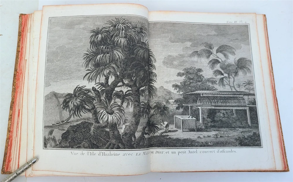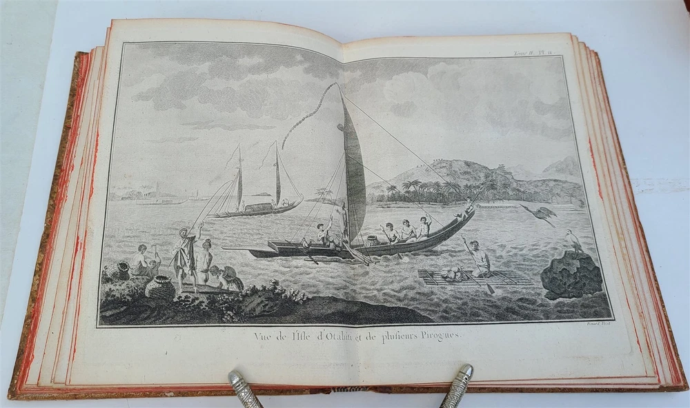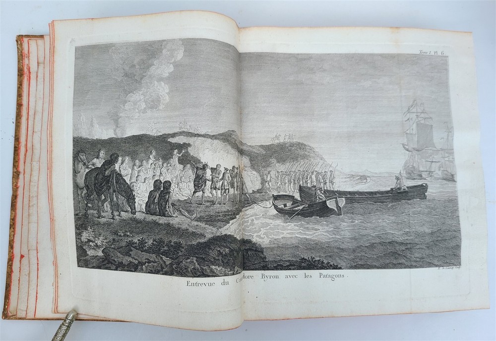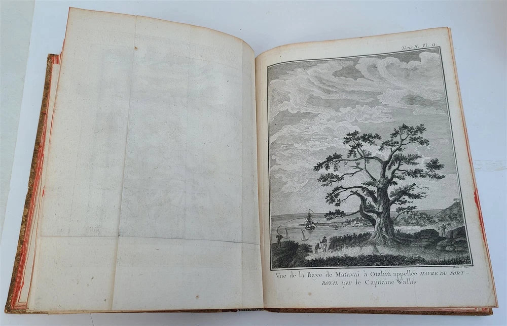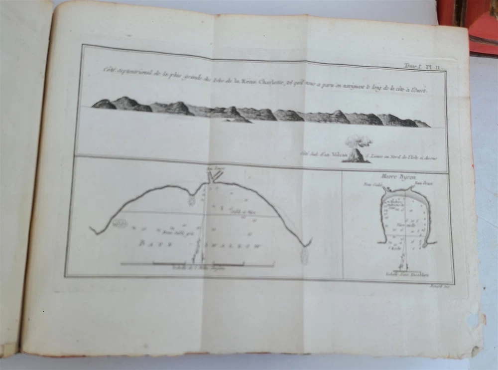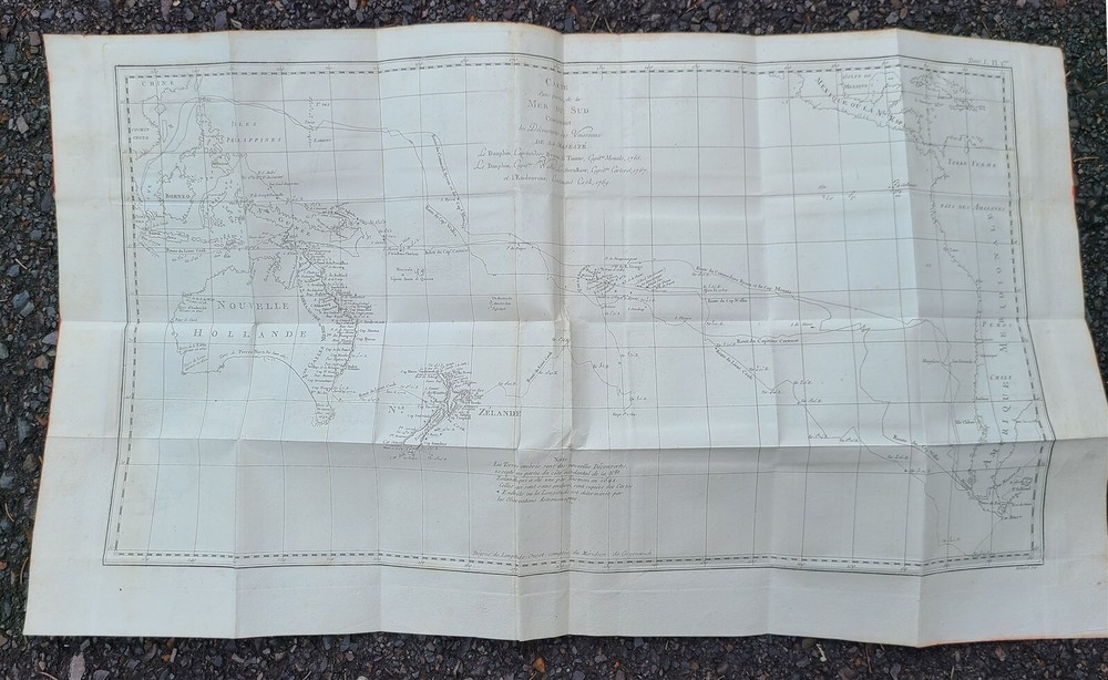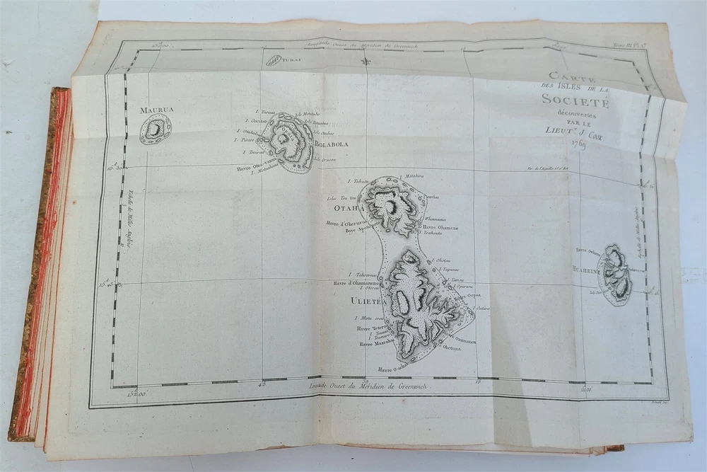 JAMES COOK. HAWKESWORTH, John. RELATION DES VOYAGES entrepris par ordre de sa Majeste Britannique, et successivement executes par le Commodore Byron, le Capitaine Carteret, le Capitaine Wallis et le Capitaine Cook, dans les Vaisseauax le Daupin, le Swallow & l’Endeavour; Traduite de l’Anglois. Eight volumes in four, plus atlas Paris, Saillant et Nyon, Panckoucke, 1774 4 text volumes: 5 by 8" atlas: 8 by 10 1/4" The atlas with 52 engraved maps and plates (most folding or double-page), pale stain to final five plates, the text in original mottled calf, all edges red Atlas in calf-backed paste paper boards. First French octavo edition of Cook’s first voyage, complete with the separate atlas. Very good condition Beddie, 660. Text in French ==================================== Please see my other auctions Thank You Refund Policy: We will issue a FULL REFUND, 100% money back if you are not satisfied with your purchase. Items must be returned to us within 20 days in order to receive a refund or replacement. Buyer is responsible for shipping costs. Powered by SixBit's eCommerce Solution