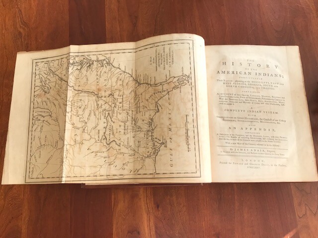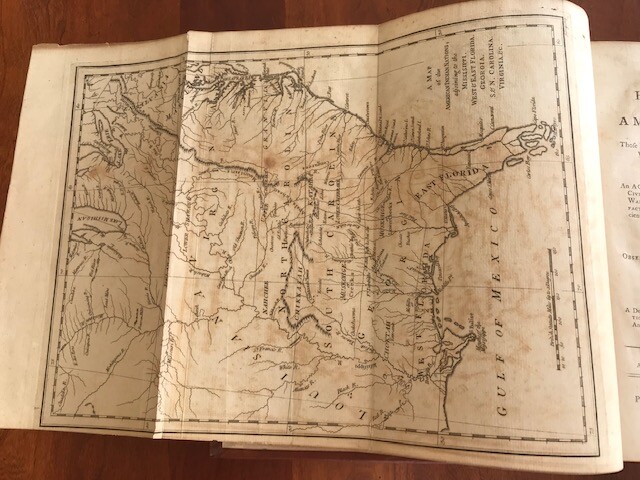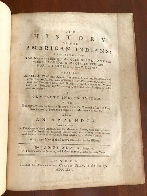 THE HISTORY OF THE AMERICAN INDIANS; PARTICULARLY THOSE NATIONS ADJOINING TO THE MISSISIPPI [sic], EAST AND WEST FLORIDA, GEORGIA, SOUTH AND NORTH CAROLINA, AND VIRGINIA.ALSO AN APPENDIX, CONTAINING A DESCRIPTION OF THE FLORIDAS, AND THE MISSISIPPI [sic] LANDS By James Adair Published: Printed for Edward and Charles Dilly, in the Poultry, London, 1775. [12],464pp., plus folding map. Half title. Quarto. Modern calf in an antique style, spine ruled in gilt, gilt leather labels. A few marginal annotations in ink and pencil. Small closed tear to top of leaves Ff and Ff2 (no text affected). Occasional mild foxing throughout. Very good. James Adair (1709-1783), "one of the most colorful figures in Southern colonial history" (Clark), emigrated from Ireland to South Carolina in 1735. He was heavily involved in trading with the Indians of the Southeast, including the Catawba, Cherokee, and Chickasaw, between 1735 and 1759, and this work contains a chapter on each of these major tribes. Considered by many to be the leading authority of his time on the southeast Indians, he offers detailed descriptions of Indian customs and religion, with many observations on Indian trade and traders. A large portion of the work is devoted to Adair's twenty-three arguments by which he attempts to prove the descent of the Indians from the Lost Tribes of Israel. The map "illustrates a Southeast with the Indians safely tucked away in the interior wilderness, exactly the condition Adair's readers would have approved of" (Cumming & De Vorsey). "The citations and quotations in Adair's HISTORY are evidence of wide and serious reading. He kept up the intellectual culture of an eighteenth-century gentleman, but he lacked polish in personal demeanor. In 1768 he visited Sir William Johnson, superintendent of Indian affairs, in an unsuccessful attempt to get Johnson's endorsement of his HISTORY. Johnson was condescending, writing to General Thomas Gage (10 Dec. 1768) that Adair's "appearance may not be much in his favor. but he is certainly well acquainted with the Southern Indians, and a man of Learning tho Rusticated by 30 years residence in a Wild Country." In 1775 Adair voyaged to England to get his HISTORY published. Returning to America in the same year, he resumed trading in new surroundings in western Tennessee, where tradition has settled him with an anonymous Indian wife or mistress. He believed that Englishmen could never live in security as long as Indians were numerous and strong and that English policy should therefore be to incite the tribes to war mercilessly against each other, a precept that Adair practiced. He is notable today for his active involvement in intertribal intrigues and wars and for his record of Indian culture" - ANB. HOWES A38. PILLING, PROOF-SHEETS 18. CLARK I:28. VAIL 643. FIELD 11. JCB (3)I:2013. SERVIES 517. BELL A59. SABIN 155. GRAFF 10. CUMMING & DE VORSEY 448. ESTC T86841. REESE & OSBORN, STRUGGLE FOR NORTH AMERICA 82. ANB 1, pp.60-61. I've done my best to describe the book, but if you have additional questions, please don't hesitate to send me an e-mail.