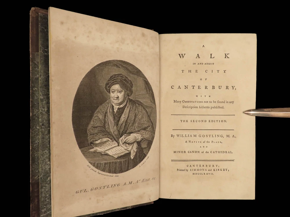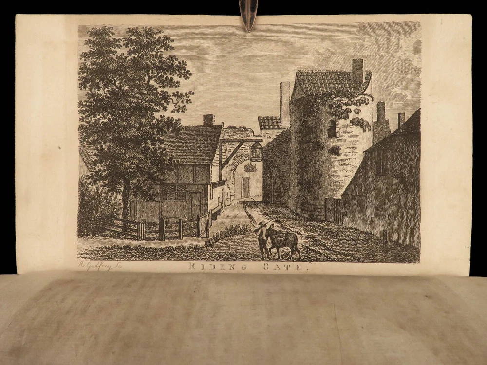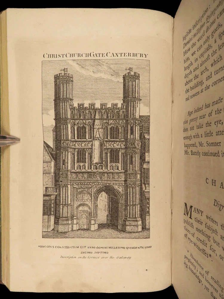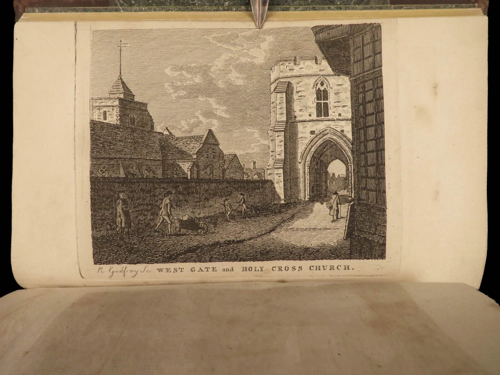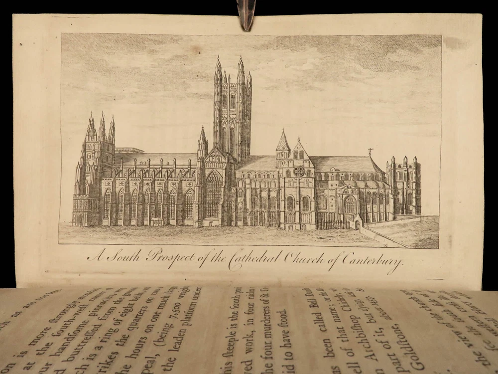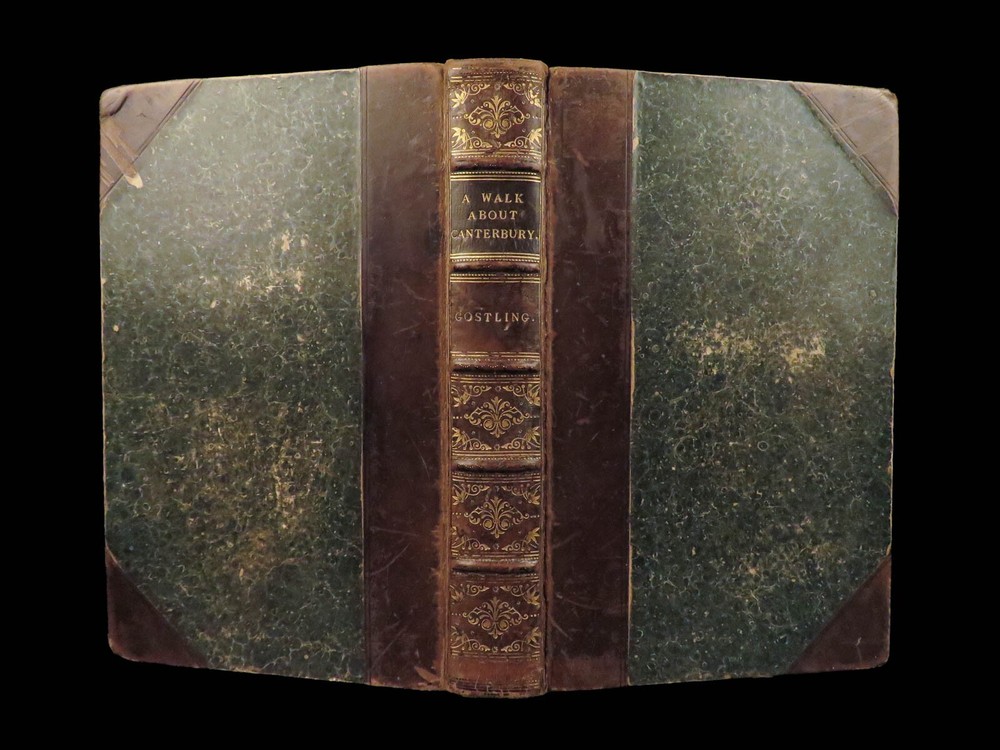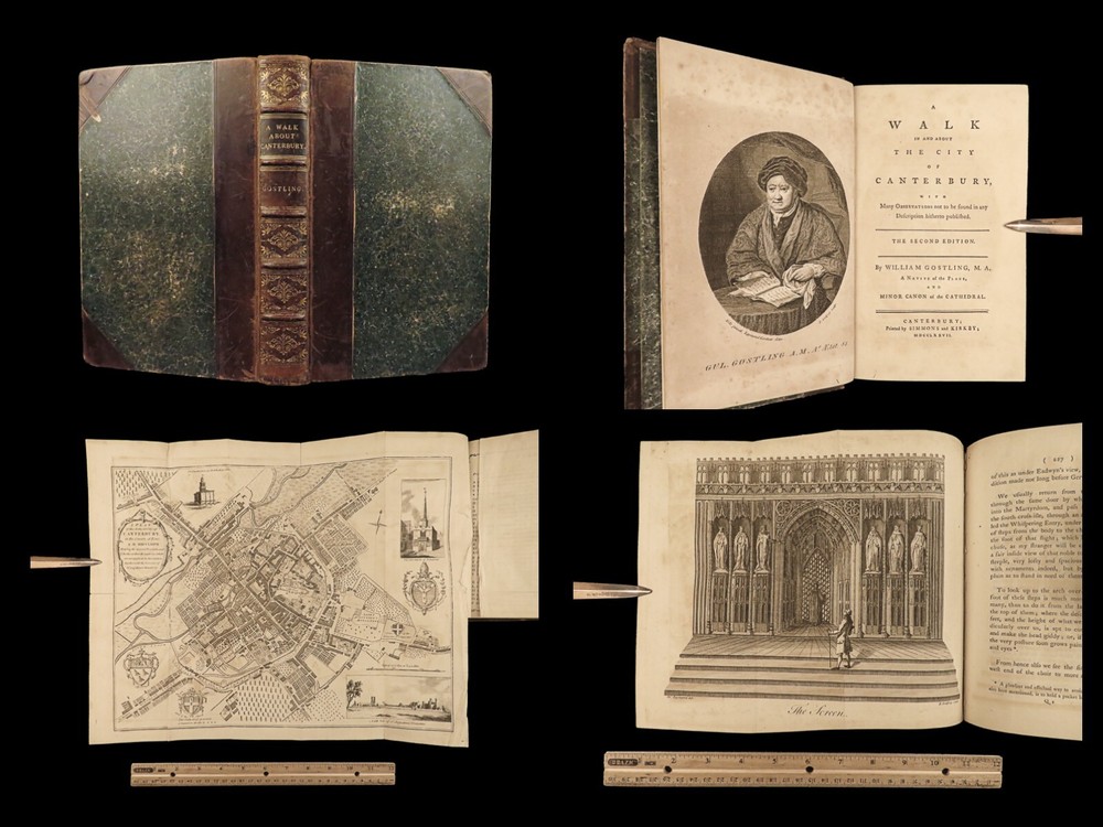 1777 Walk in Canterbury England Illustrated Cathedral Castle MAP Monks Gostling William Gostling was an 18 th -century English historian who is primarily remembered for his history of Canterbury. As a native of Canterbury, Gostling had a first-hand perspective of the city and its environs. In this history, “ A Walk in and About the City of Canterbury ”, Gostling focuses heavily on the iconic structures including Canterbury Castle, Church of St. Martin, St. Augustine’s Monastery and Abbey, Canterbury Cathedral, and many others. Gostling also offers an interesting perspective on the 1174 fire of the cathedral, which is often thought to have been deliberately begun by monks! This desirable 1777 edition includes 24 full-page engravings including numerous views of the cathedral and a folding map of the city! Item number: #23158 Price: $550 GOSTLING, William A walk in and about the city of Canterbury : with many observations not to be found in any description hitherto published Canterbury: Printed by Simmons and Kirkby, 1777. Details : · Collation: Complete with all pages o ix, [2], 12-36, 402, [16] o 24 engravings § Includes folding map of Canterbury · Language: English · Binding: Leather; tight and secure · Size : ~8.5in X 5.25in (21.5cm x 13.5cm) Our Guarantee: Very Fast. Very Safe. Free Shipping Worldwide. Customer satisfaction is our priority! Notify us with 7 days of receiving, and we will offer a full refund without reservation! 23158