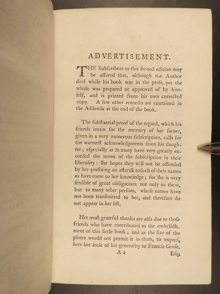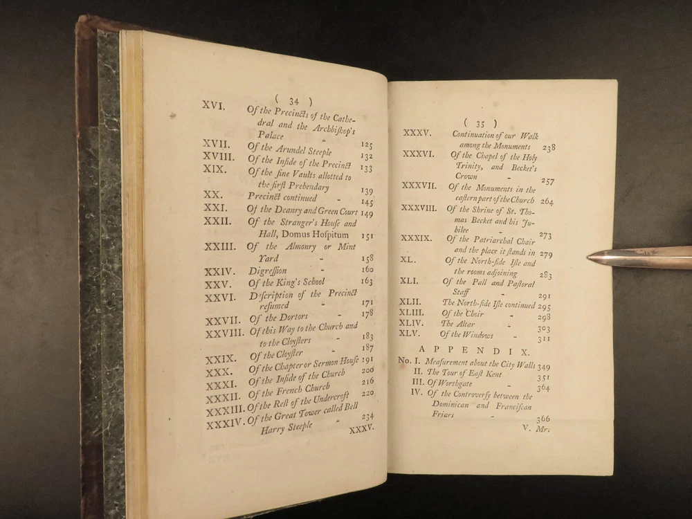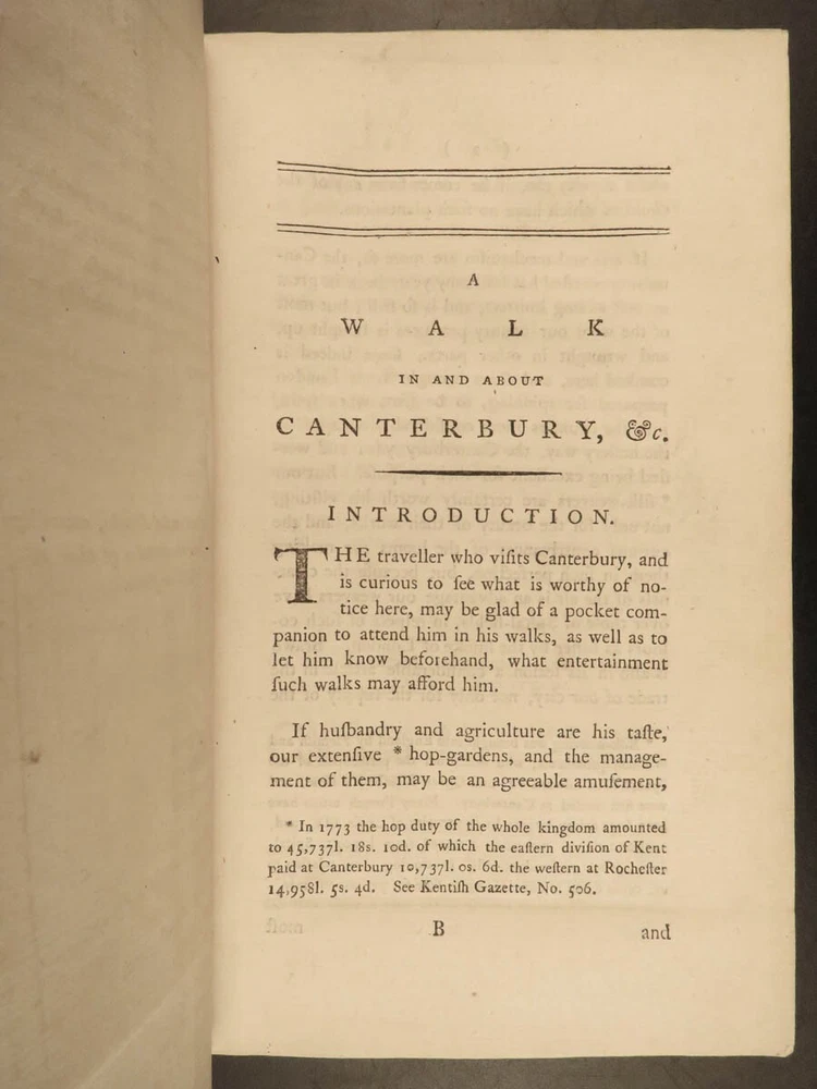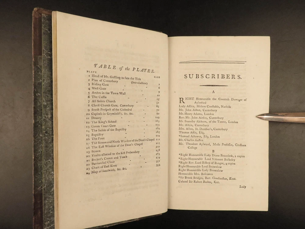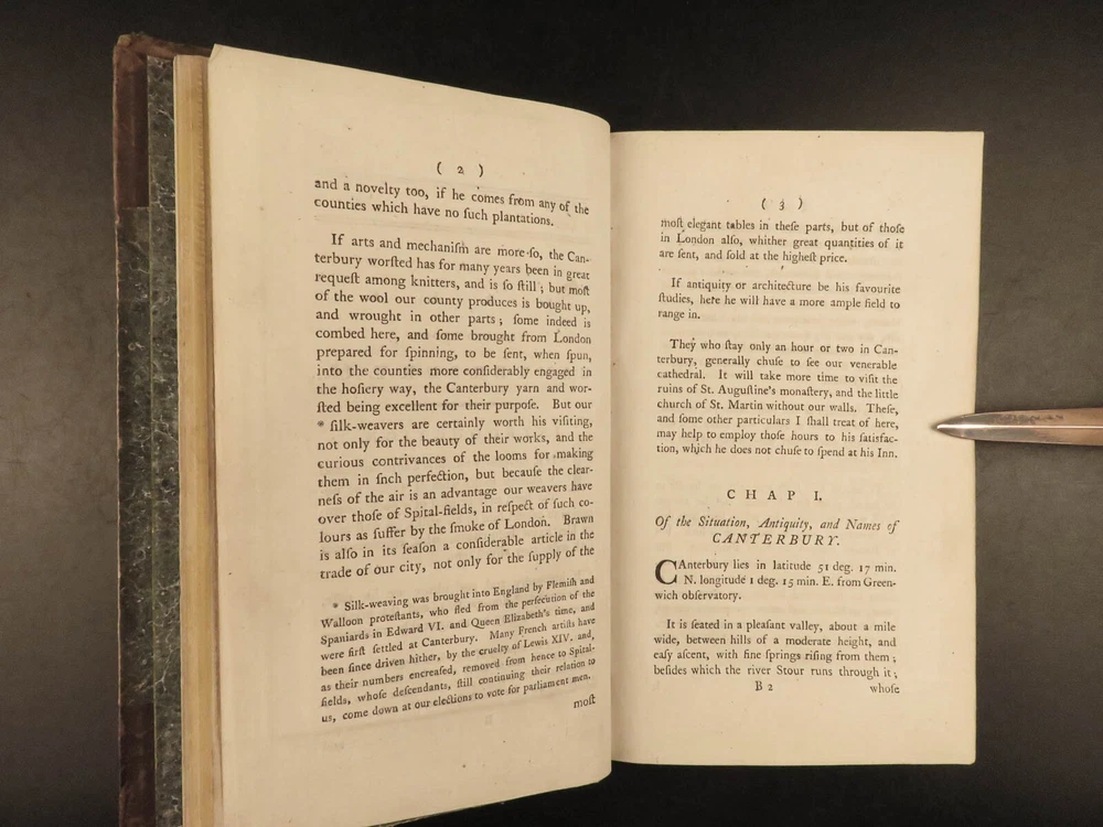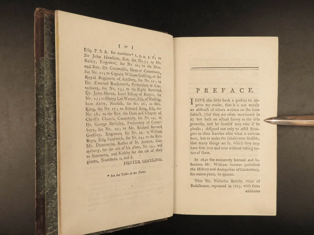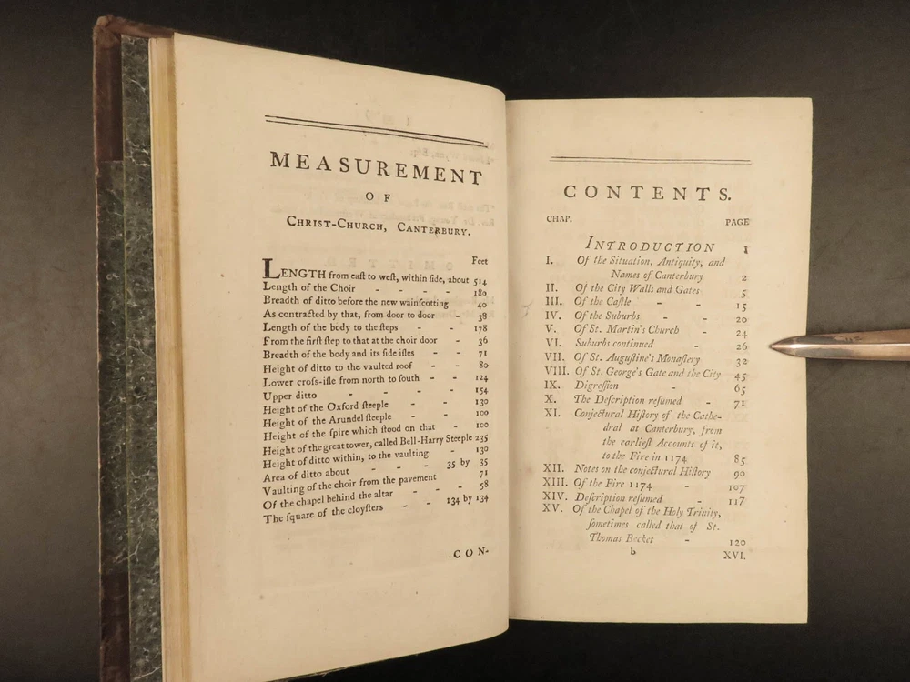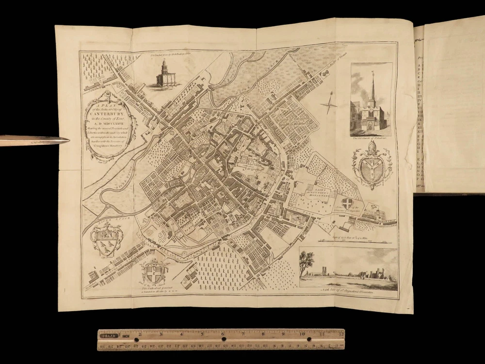 1777 Walk in Canterbury England Illustrated Cathedral Castle MAP Monks Gostling William Gostling was an 18 th -century English historian who is primarily remembered for his history of Canterbury. As a native of Canterbury, Gostling had a first-hand perspective of the city and its environs. In this history, “ A Walk in and About the City of Canterbury ”, Gostling focuses heavily on the iconic structures including Canterbury Castle, Church of St. Martin, St. Augustine’s Monastery and Abbey, Canterbury Cathedral, and many others. Gostling also offers an interesting perspective on the 1174 fire of the cathedral, which is often thought to have been deliberately begun by monks! This desirable 1777 edition includes 24 full-page engravings including numerous views of the cathedral and a folding map of the city! Item number: #23158 Price: $550 GOSTLING, William A walk in and about the city of Canterbury : with many observations not to be found in any description hitherto published Canterbury: Printed by Simmons and Kirkby, 1777. Details : · Collation: Complete with all pages o ix, [2], 12-36, 402, [16] o 24 engravings § Includes folding map of Canterbury · Language: English · Binding: Leather; tight and secure · Size : ~8.5in X 5.25in (21.5cm x 13.5cm) Our Guarantee: Very Fast. Very Safe. Free Shipping Worldwide. Customer satisfaction is our priority! Notify us with 7 days of receiving, and we will offer a full refund without reservation! 23158