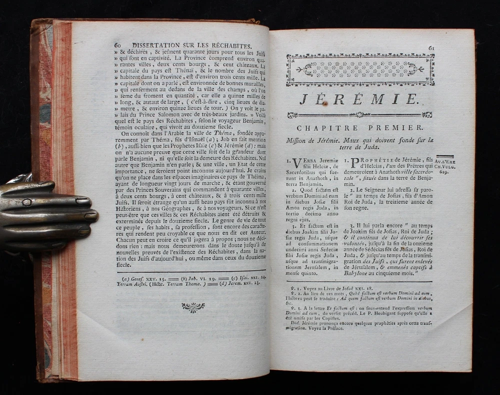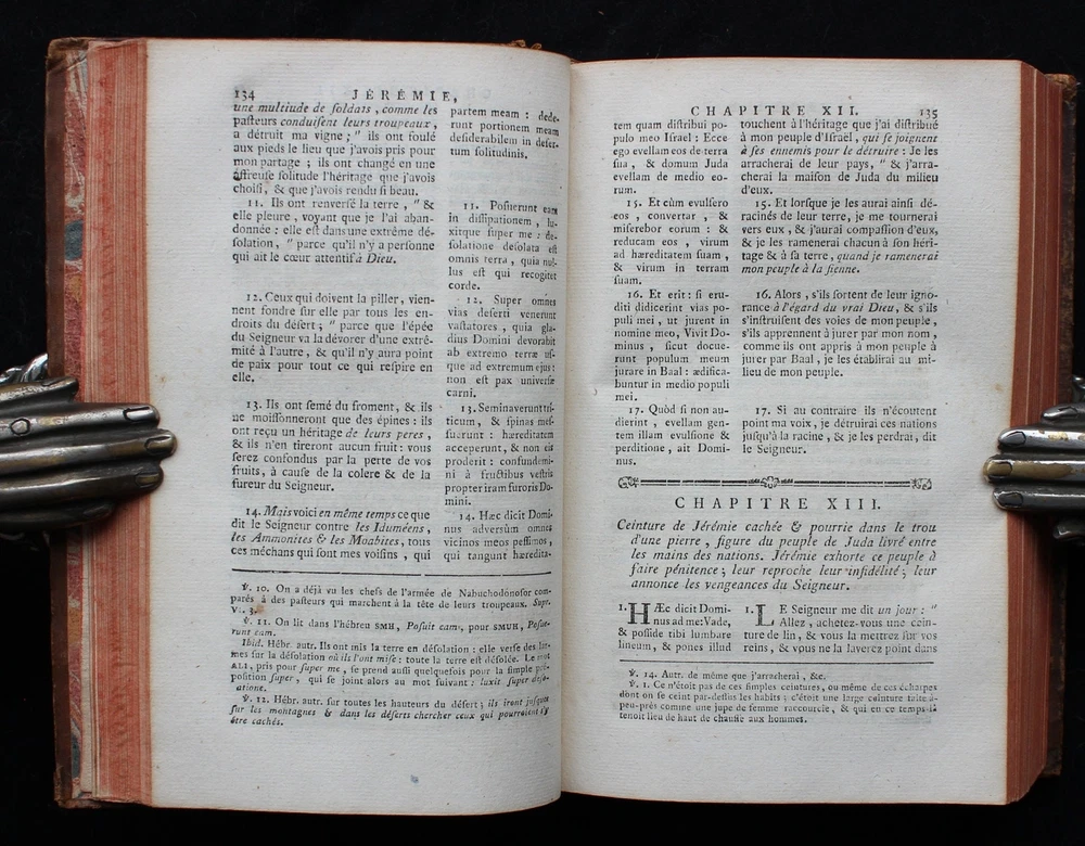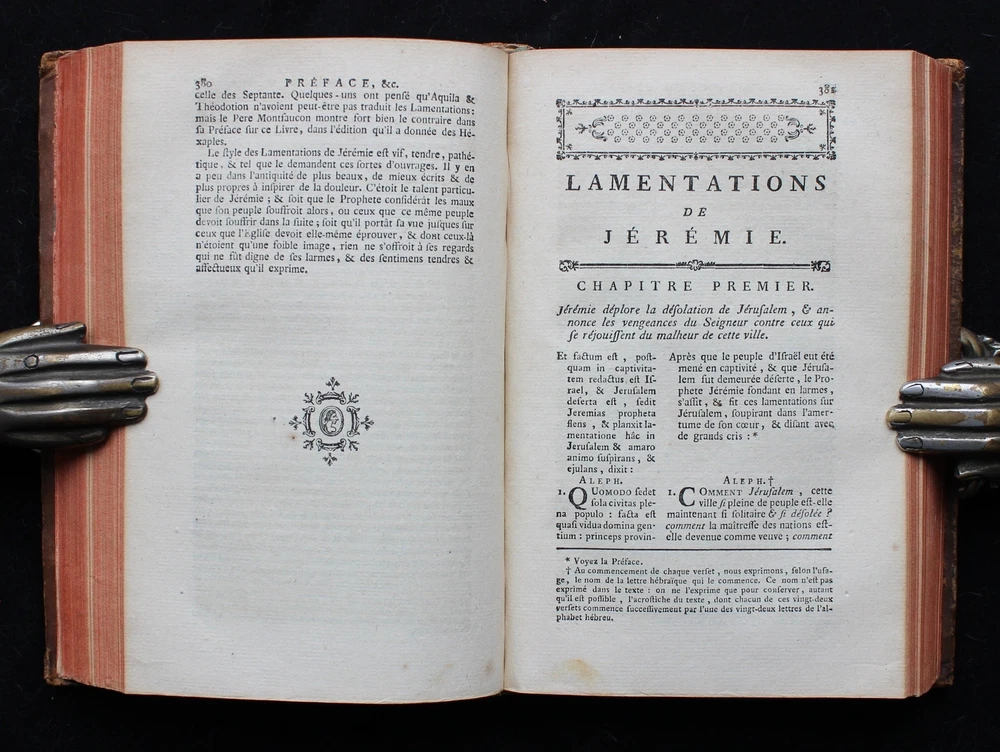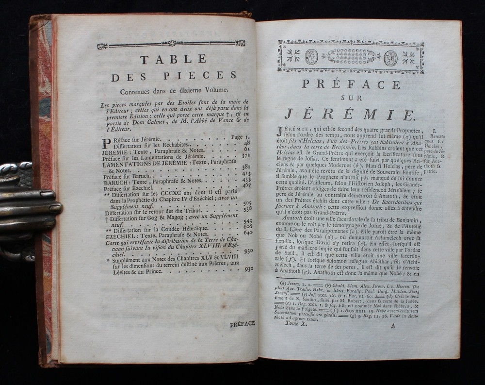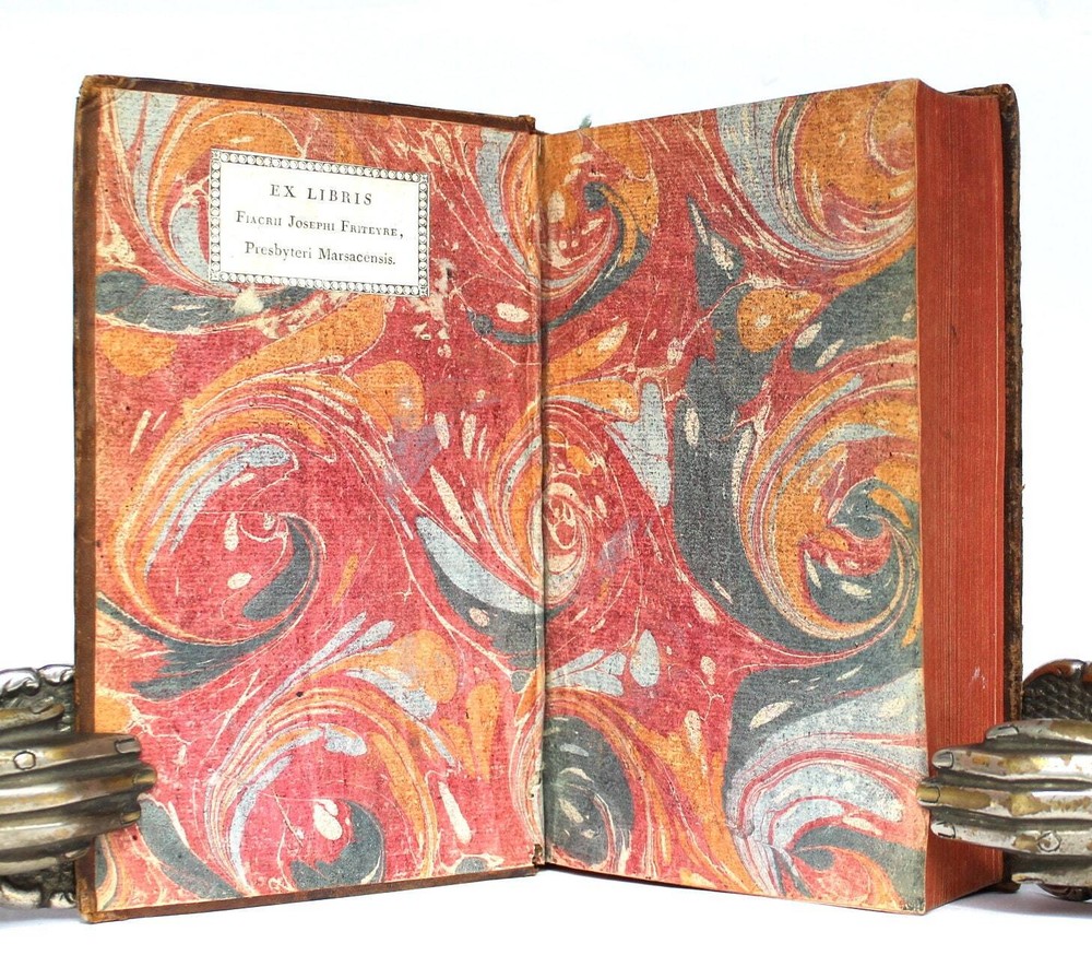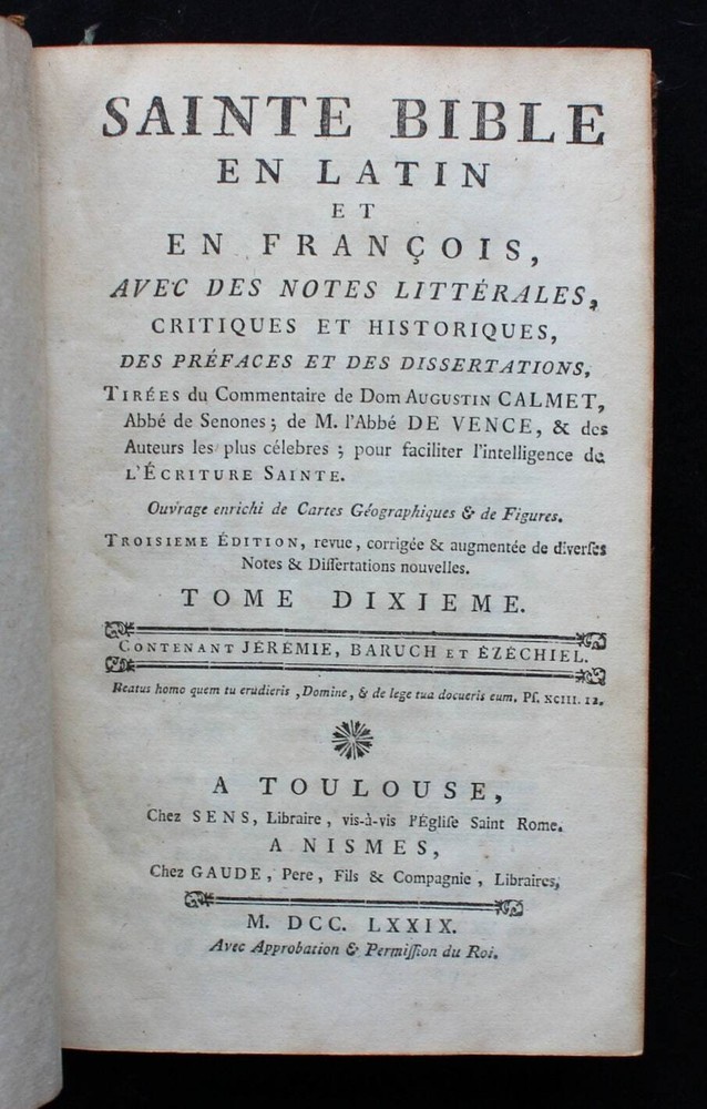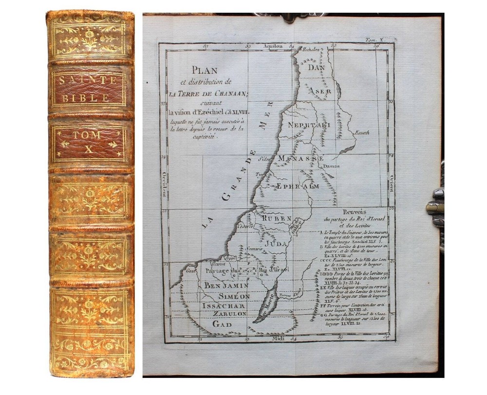 An antique edition from 1779 of the Books of Jeremiah, Baruch and Ezechiel featuring both Latin and French translations. Enriched with a comprehensive French commentary, this edition is a linguistic and literary gem, providing insights into the profound wisdom embedded in these timeless texts. The edition is further distinguished by a fold-out map showcasing Ezekiel's vision of the Land of Canaan and its distribution. "Sainte Bible en Latin et en François, avec des Notes Littérales, Critiques et Historiques, des Préfaces et des Dissertations, Tirées du Commentaire de Dom Augustin Calmet, Abbé de Senones, de M. l'Abbé De Vence, & des Auteurs les Plus Célèbres; pour Faciliter l'Intelligence de l'Ecriture Sainte. Tome Dixième. Contenant Jérémie, Baruch et Ezechiel". Toulousse, Chez Sens, 1779. 21 x 14 cm., 936 pages. Text in Latin and French. Bound in period full leather, raised bands, gilt to spine, marbled endpapers, red edges. This book is a true testament to both craftsmanship and historical charm. It invites you to explore its pages with the assurance of a well-preserved and captivating piece. The classic elegance of the leather binding adds a touch of sophistication, making it an exquisite addition to any collection. Very good condition.