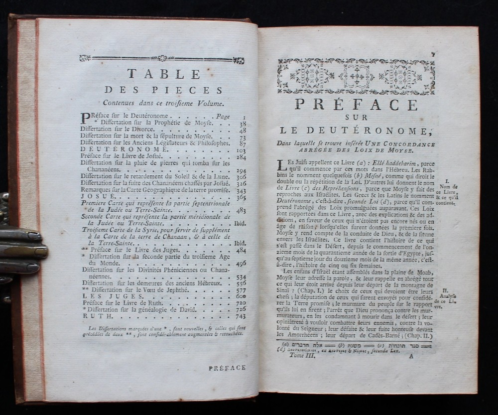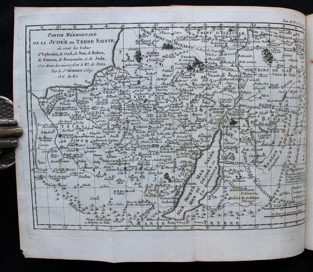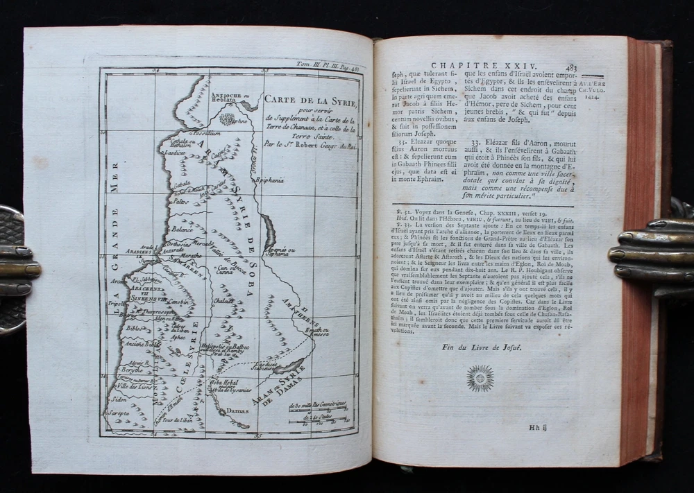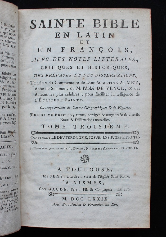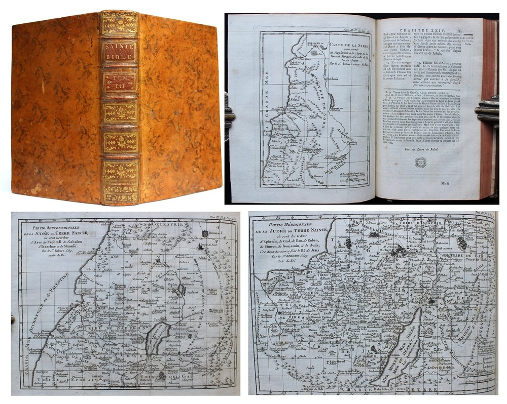 'The Books of Deuteronomy, Joshua, Judges and Ruth' presented in Latin and French, accompanied by an extensive commentary in French. This 1779 edition is not only a linguistic treasure but also a visual delight, adorned with 3 magnificent fold-out maps of the Holy Land and Syria. These detailed maps provide a captivating geographical context to the biblical narratives, allowing readers to trace the journeys and events depicted in the texts. "Sainte Bible en Latin et en François, avec des Notes Littérales, Critiques et Historiques, des Préfaces et des Dissertations, Tirées du Commentaire de Dom Augustin Calmet, Abbé de Senones, de M. l'Abbé De Vence, & des Auteurs les Plus Célèbres; pour Faciliter l'Intelligence de l'Ecriture Sainte. Tome Troisième. Contenant Le Deutéronome, Josué, les Juges et Ruth". Toulouse, Chez Sens, 1779. 21 x 14 cm., 762 pages + 3 fold-out maps. Text in Latin and French. Bound in period full leather, raised bands, gilt to spine, marbled endpapers, red edges. This book is a true testament to both craftsmanship and historical charm. In excellent condition, it invites you to explore its pages with the assurance of a well-preserved and captivating piece. The classic elegance of the leather binding adds a touch of sophistication, making it an exquisite addition to any collection.