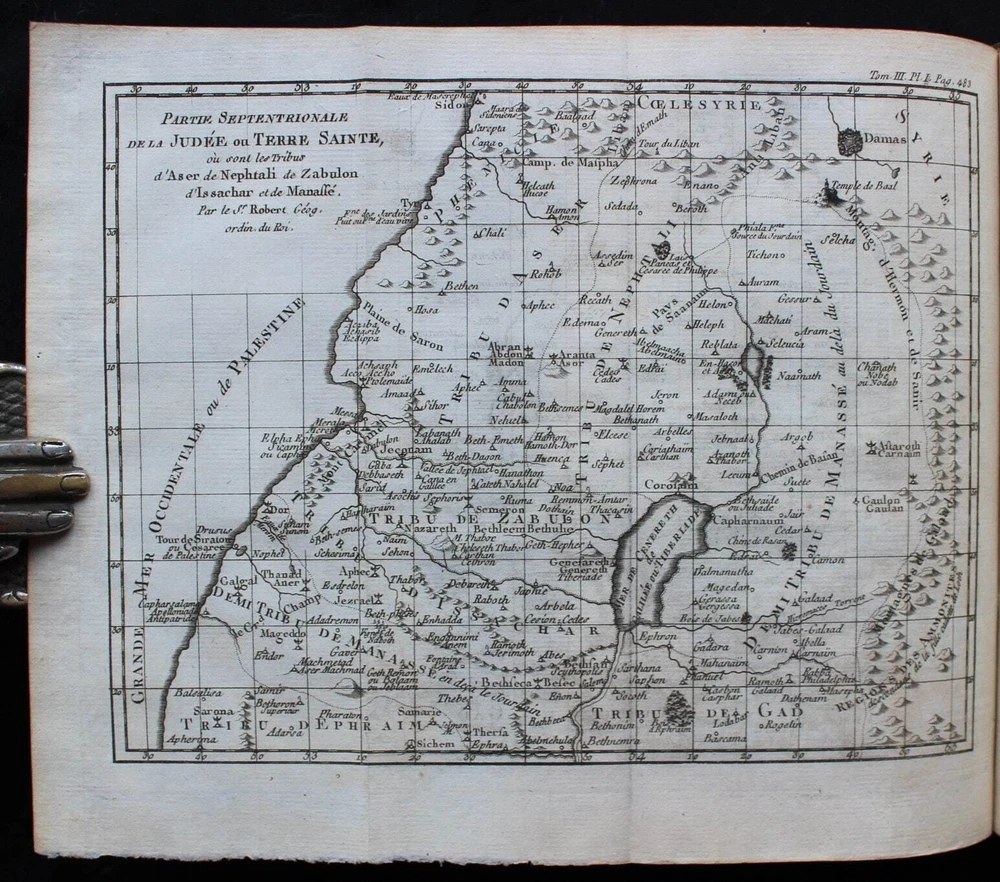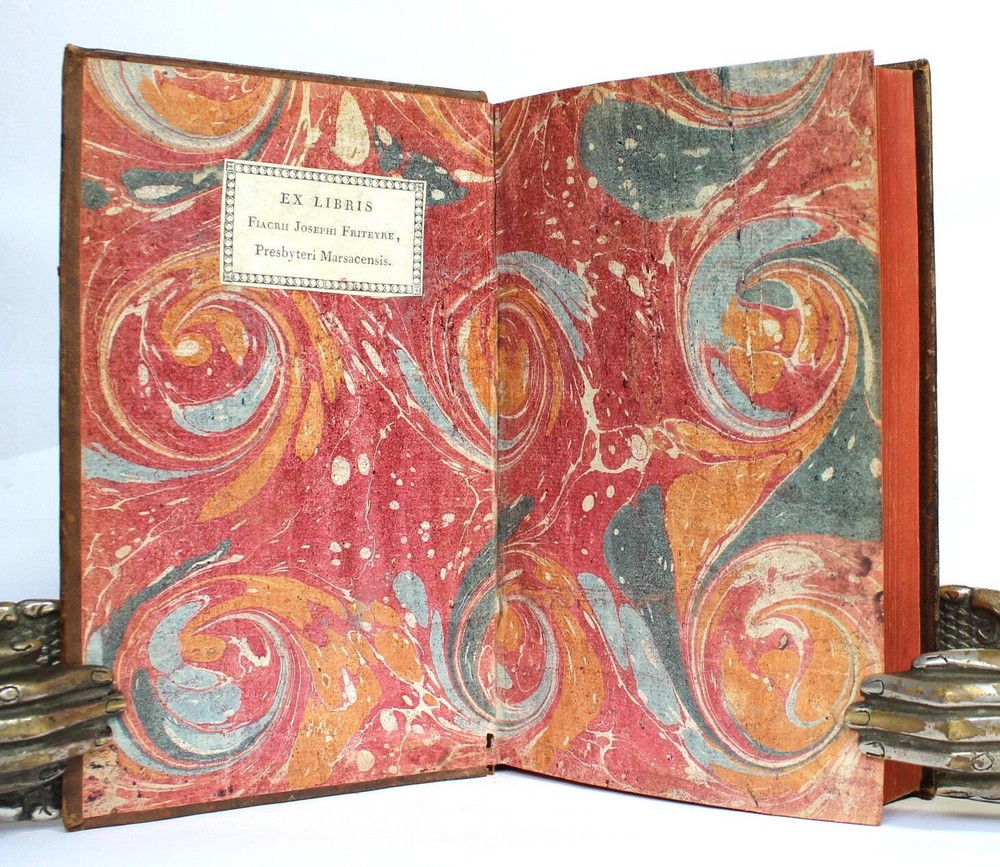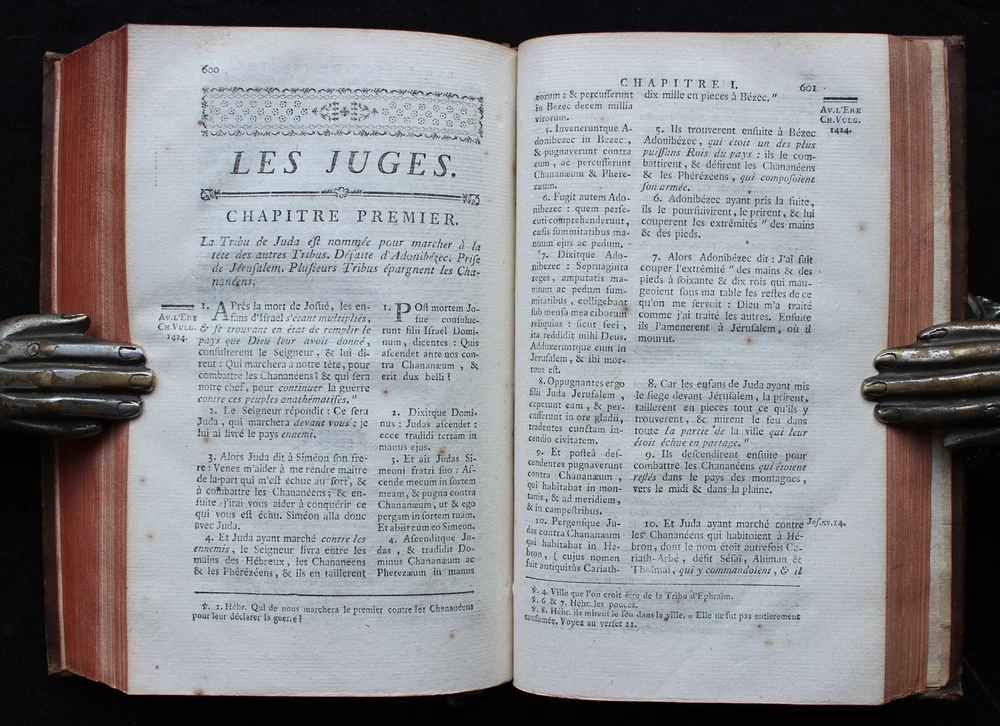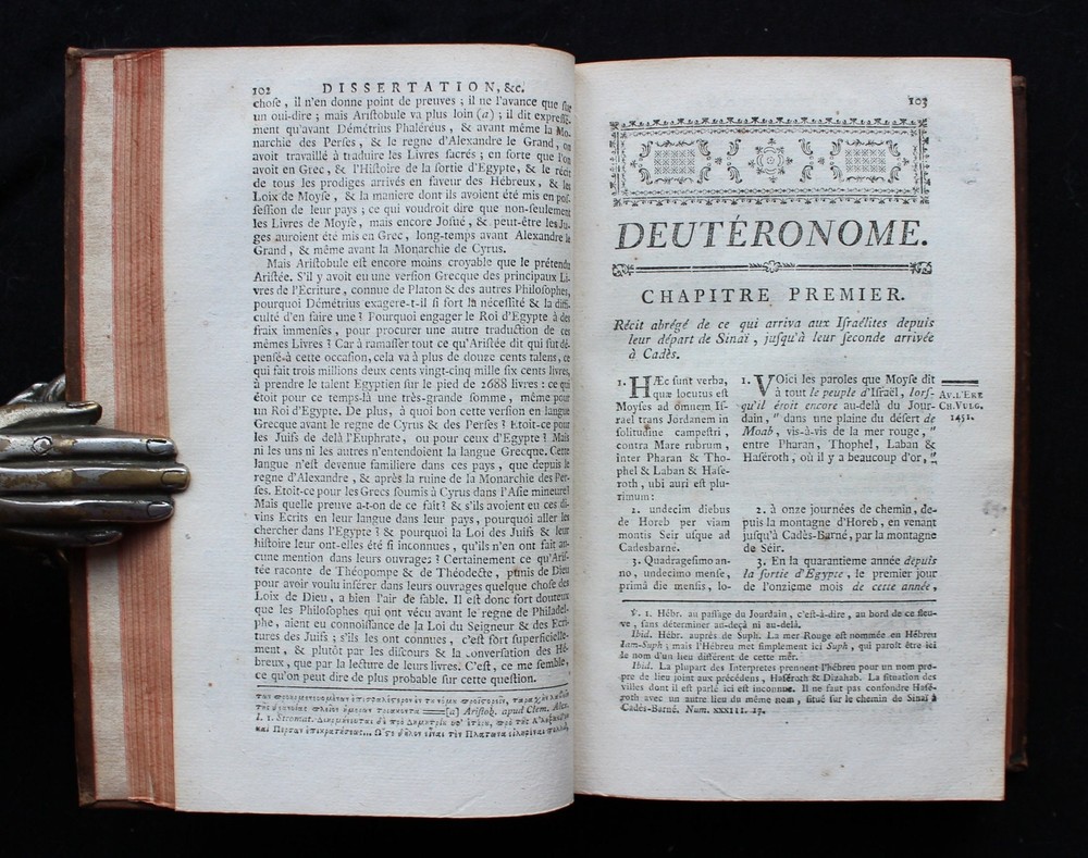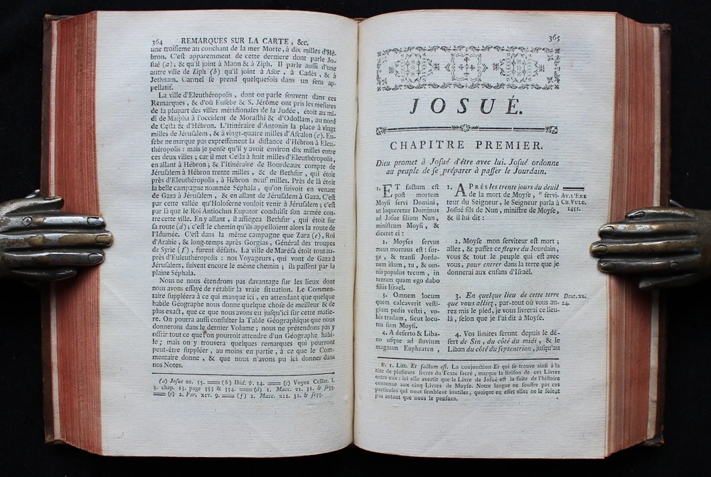 'The Books of Deuteronomy, Joshua, Judges and Ruth' presented in Latin and French, accompanied by an extensive commentary in French. This 1779 edition is not only a linguistic treasure but also a visual delight, adorned with 3 magnificent fold-out maps of the Holy Land and Syria. These detailed maps provide a captivating geographical context to the biblical narratives, allowing readers to trace the journeys and events depicted in the texts. "Sainte Bible en Latin et en François, avec des Notes Littérales, Critiques et Historiques, des Préfaces et des Dissertations, Tirées du Commentaire de Dom Augustin Calmet, Abbé de Senones, de M. l'Abbé De Vence, & des Auteurs les Plus Célèbres; pour Faciliter l'Intelligence de l'Ecriture Sainte. Tome Troisième. Contenant Le Deutéronome, Josué, les Juges et Ruth". Toulouse, Chez Sens, 1779. 21 x 14 cm., 762 pages + 3 fold-out maps. Text in Latin and French. Bound in period full leather, raised bands, gilt to spine, marbled endpapers, red edges. This book is a true testament to both craftsmanship and historical charm. In excellent condition, it invites you to explore its pages with the assurance of a well-preserved and captivating piece. The classic elegance of the leather binding adds a touch of sophistication, making it an exquisite addition to any collection.