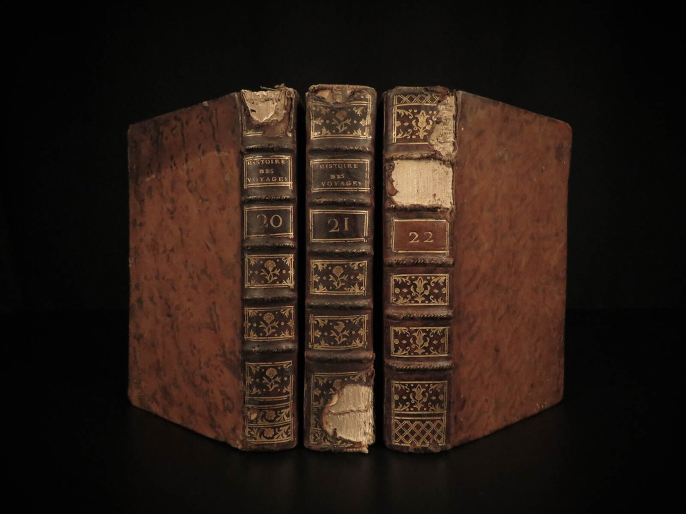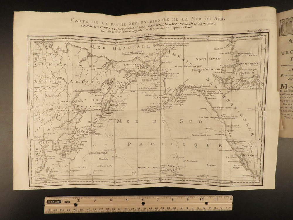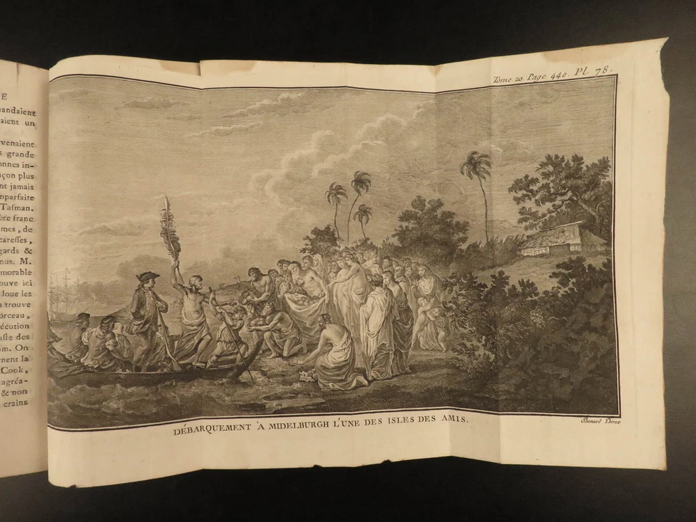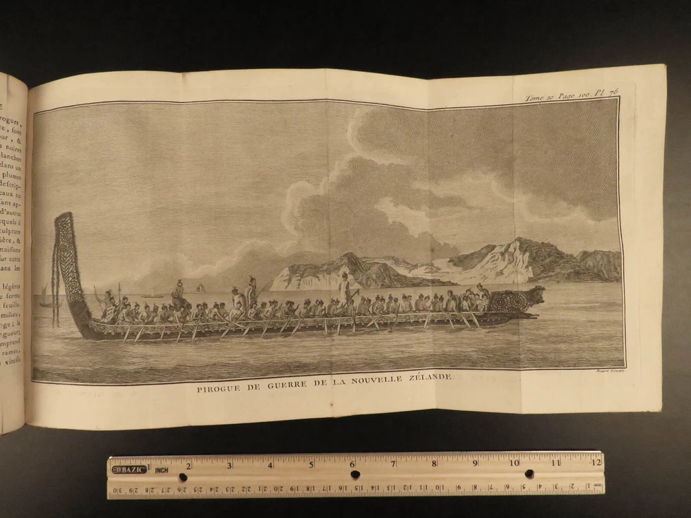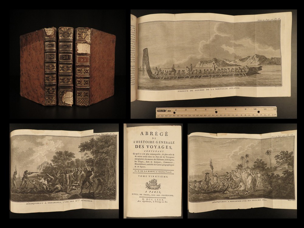 1780 Captain Cook NEW ZEALAND Tonga WAR Boats Australia Pacific Voyages MAP The best book of its kind! A rare book La Harpe’s ‘ General History of Voyages’ ! This extensive work was begun by La Harpe, and, after the first 21 volumes, was completed by several other historians. Not only does this work describe the geography of specific voyages, but it covers the sciences, commerce, religion, and customs of people groups from Africa, Asia, Americas, and Pacific Islands. According to Sabin, La Harpe’s ‘Voyages’ is “a work that has met with greater success than any other of the same kind; the fidelity of the narration, the striking details of adventures, and the lively pictures of manners, etc., it presents, will always give it a peculiar and lasting merit. Contains all the early voyages of America. ” These volumes include some of the most popular voyages of the 18 th -century including Captain Cook’s famous expeditions! It is illustrated with folding plates of important scenes from these expeditions including · Head Warrior from New Zealand · Pirogue of War; New Zealand battle boat (folding) · Indoor dance of the Island of Ulietea (folding) · Landing of Middleburgh on the Island of Amis/Tonga (folding) · Man from Easter Island · St. Christine island natives, Chief · Impressive folding map of the Pacific Ocean Item number: #16689 Price: $750 La HARPE, Jean-François Abrégé de l'histoire générale des voyages. A Paris : Hôtel de Thou, 1780. Details : · Collation: Complete with all pages – 3 tomes o Vol. 20 – [4], 490, [2] o Vol. 21 – [2], 671, [1] o Vol. 22 – [4], 56; 558 o 12 engraved plates, maps · References: Brunet III, 771; Sabin 38632 · Language: French · Binding: Leather; tight & secure · Size : ~8in X 5.25in (20.5cm x 13.5cm) Our Guarantee: Very Fast. Very Safe. Free Shipping Worldwide. Customer satisfaction is our priority! Notify us with 7 days of receiving, and we will offer a full refund without reservation! 16689