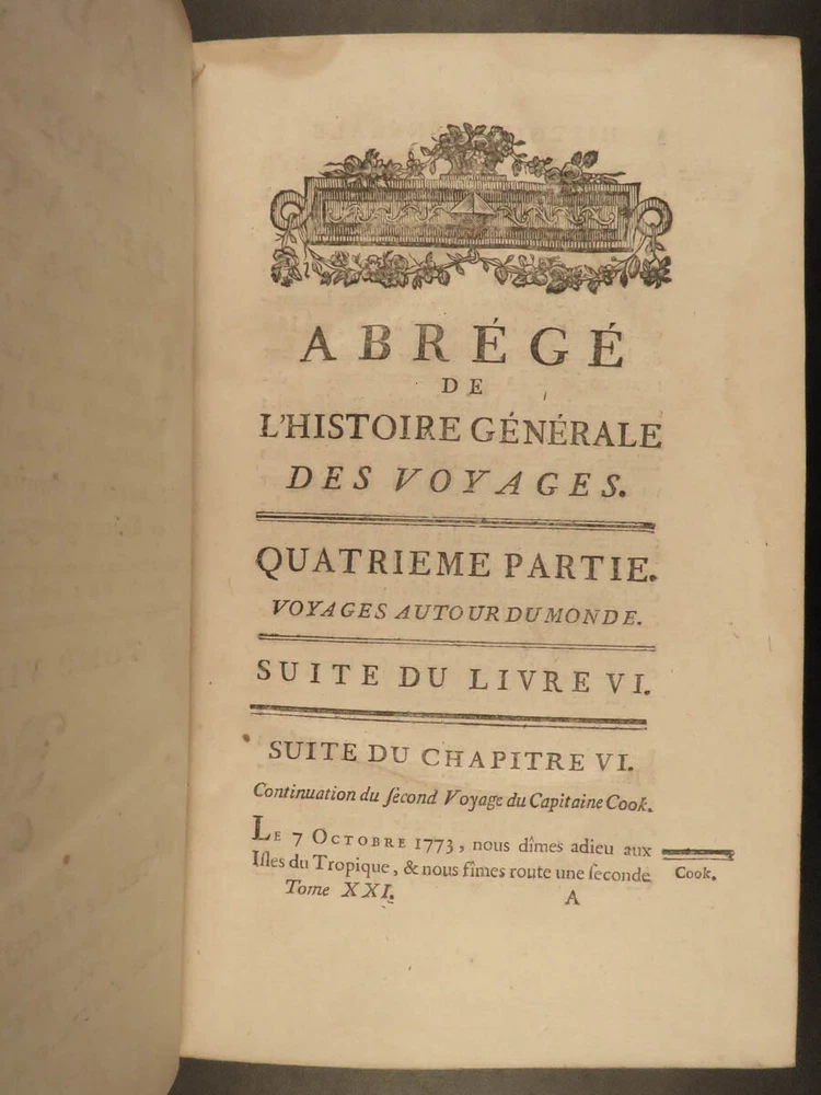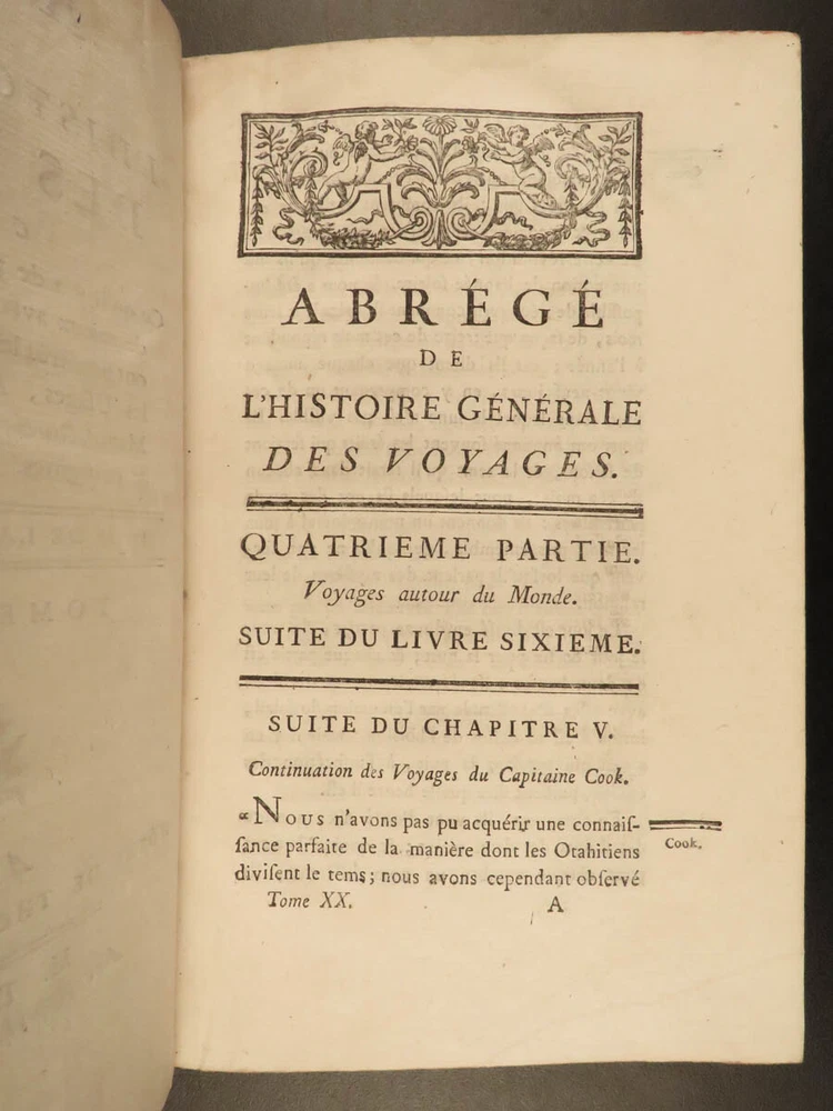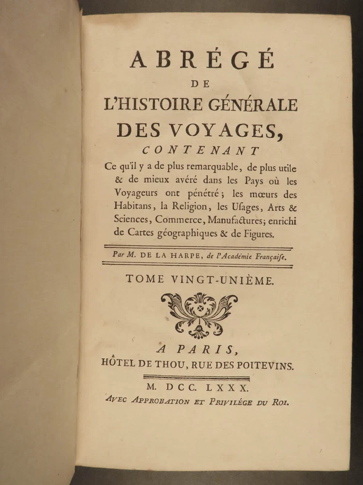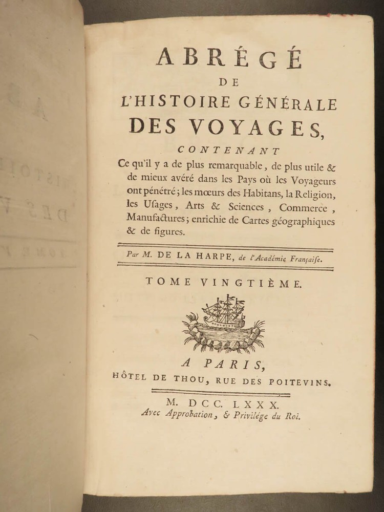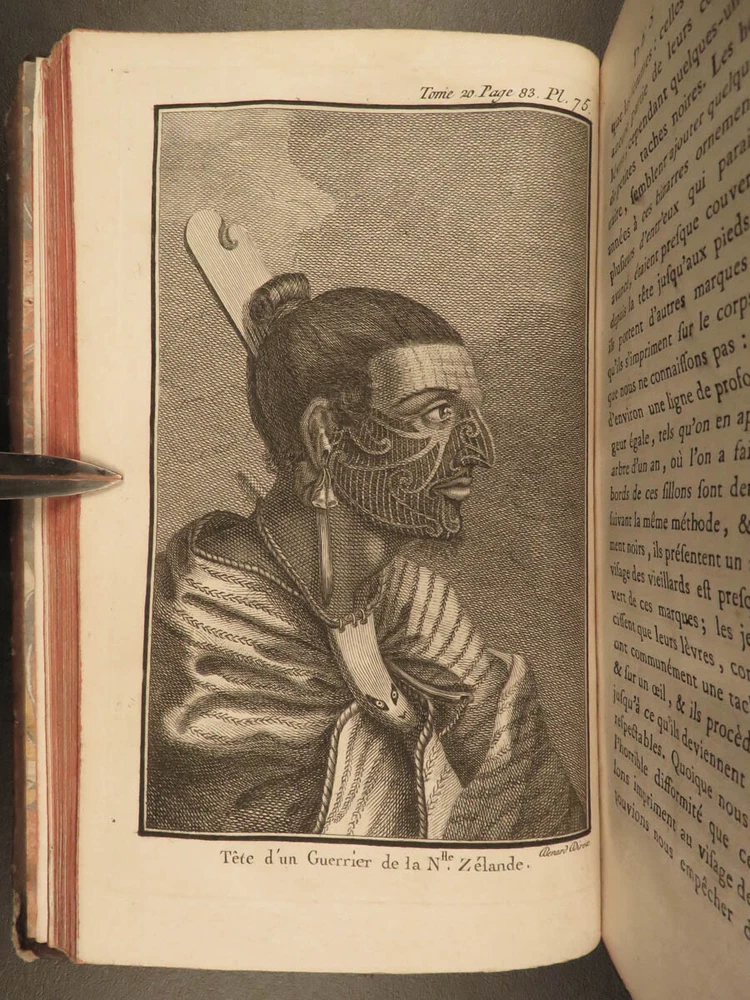 1780 Captain Cook NEW ZEALAND Tonga WAR Boats Australia Pacific Voyages MAP The best book of its kind! A rare book La Harpe’s ‘ General History of Voyages’ ! This extensive work was begun by La Harpe, and, after the first 21 volumes, was completed by several other historians. Not only does this work describe the geography of specific voyages, but it covers the sciences, commerce, religion, and customs of people groups from Africa, Asia, Americas, and Pacific Islands. According to Sabin, La Harpe’s ‘Voyages’ is “a work that has met with greater success than any other of the same kind; the fidelity of the narration, the striking details of adventures, and the lively pictures of manners, etc., it presents, will always give it a peculiar and lasting merit. Contains all the early voyages of America. ” These volumes include some of the most popular voyages of the 18 th -century including Captain Cook’s famous expeditions! It is illustrated with folding plates of important scenes from these expeditions including · Head Warrior from New Zealand · Pirogue of War; New Zealand battle boat (folding) · Indoor dance of the Island of Ulietea (folding) · Landing of Middleburgh on the Island of Amis/Tonga (folding) · Man from Easter Island · St. Christine island natives, Chief · Impressive folding map of the Pacific Ocean Item number: #16689 Price: $750 La HARPE, Jean-François Abrégé de l'histoire générale des voyages. A Paris : Hôtel de Thou, 1780. Details : · Collation: Complete with all pages – 3 tomes o Vol. 20 – [4], 490, [2] o Vol. 21 – [2], 671, [1] o Vol. 22 – [4], 56; 558 o 12 engraved plates, maps · References: Brunet III, 771; Sabin 38632 · Language: French · Binding: Leather; tight & secure · Size : ~8in X 5.25in (20.5cm x 13.5cm) Our Guarantee: Very Fast. Very Safe. Free Shipping Worldwide. Customer satisfaction is our priority! Notify us with 7 days of receiving, and we will offer a full refund without reservation! 16689