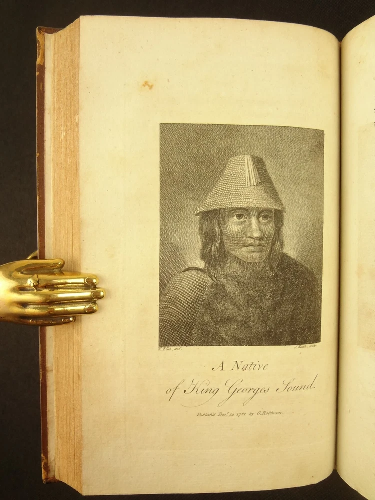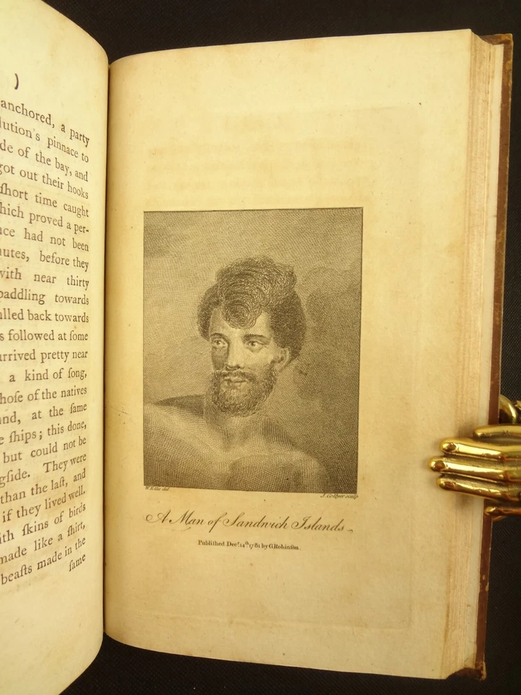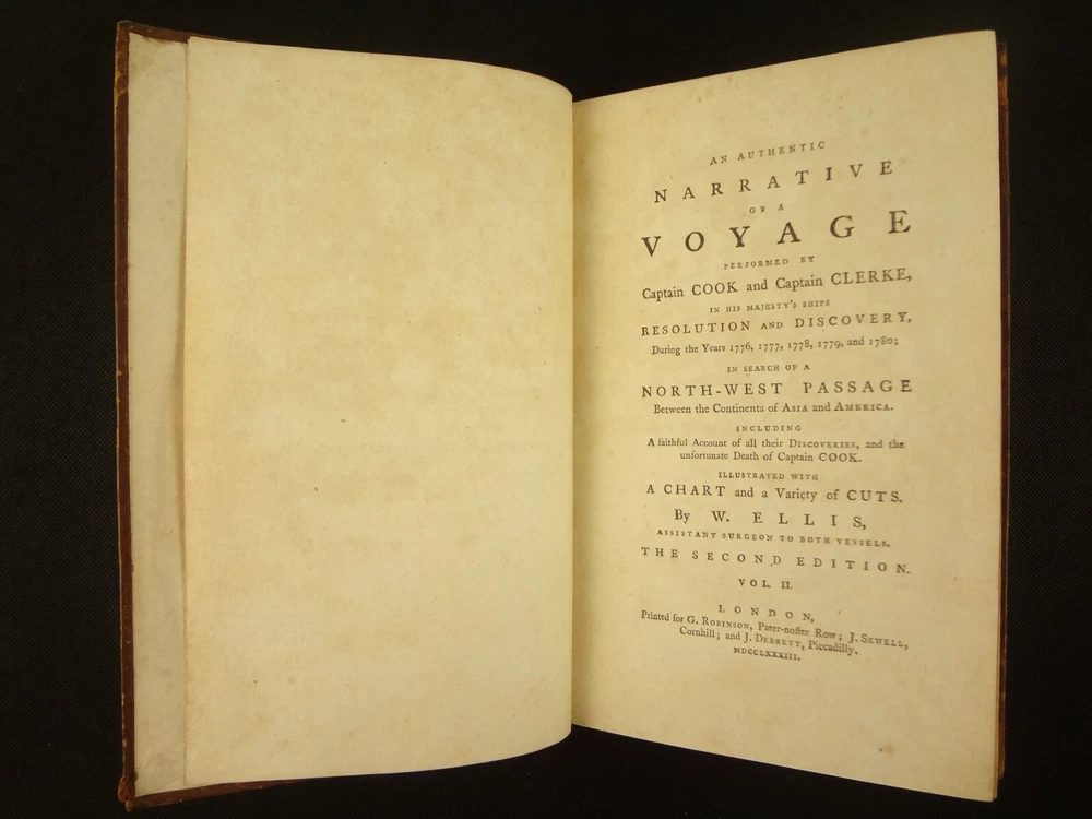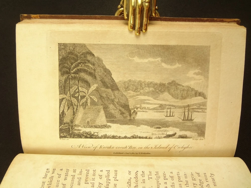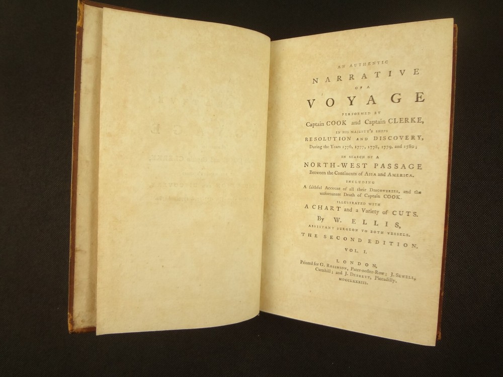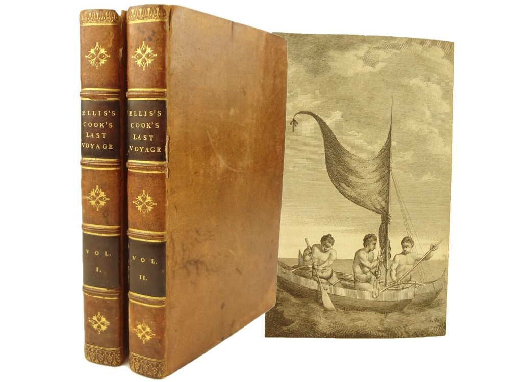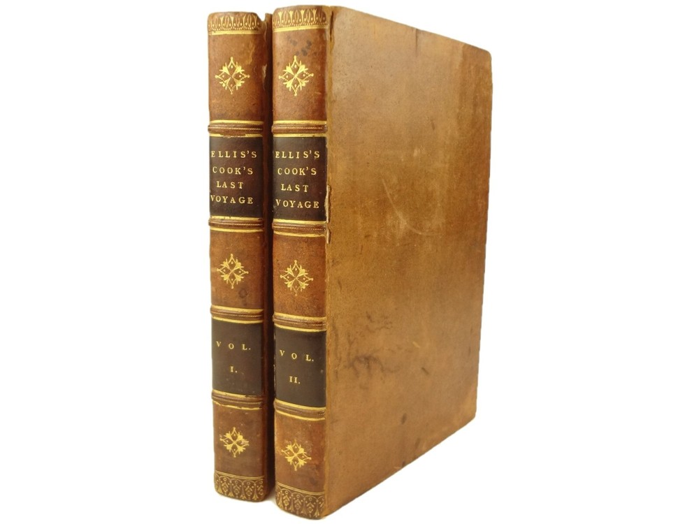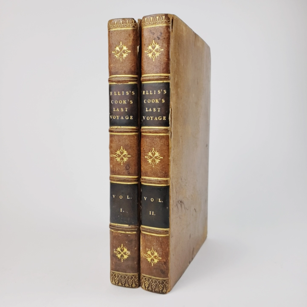 Complete with all 21 plates, and the map, a handsome copy of Ellis' recounting of Cook's last voyage; includes wonderful plates depicting Hawaii (among others). Second edition. Full title: 1783 An Authentic Narrative of a Voyage Performed by Captain Cook and Captain Clerke in his Majesty's Ships Resolution and Discovery, During the Years 1776, 1777, 1778, 1779 and 1780; In Search of a North-west Passage Between the Continents of Asia and America, including A faithful Account of all their Discoveries, and the unfortunate Death of Captain Cook. About the Voyage - James Cook's third and final voyage (12 July 1776 – 4 October 1780) took the route from Plymouth via Cape Town and Tenerife to New Zealand and the Hawaiian Islands, and along the North American coast to the Bering Strait. Its ostensible purpose was to return Omai, a young man from Raiatea, to his homeland, but the Admiralty used this as a cover for their plan to send Cook on a voyage to discover the Northwest Passage. HMS Resolution, to be commanded by Cook, and HMS Discovery, commanded by Charles Clerke, were prepared for the voyage which started from Plymouth in 1776. Omai was returned to his homeland and the ships sailed onwards, encountering the Hawaiian Archipelago, before reaching the Pacific coast of North America. The two charted the west coast of the continent and passed through the Bering Strait when they were stopped by ice from sailing either east or west. The vessels returned to the Pacific and called briefly at the Aleutians before retiring towards Hawaii for the winter. At Kealakekua Bay, a number of quarrels broke out between the Europeans and Hawaiians culminating in Cook's death in a violent exchange on 14 February 1779. The command of the expedition was assumed by Charles Clerke who tried in vain to find the passage before his own death. Under the command of John Gore the crews returned to a subdued welcome in London in October 1780. About this Recounting - As Captain Cook’s official account was prepared (from his journals), the ship’s crew rushed to cash-in on public interest. “As on the earlier voyages, unofficial accounts written by members of the crew were produced. The first to appear, in 1781, was a narrative based on the journal of John Rickman entitled Journal of Captain Cook's Last Voyage. Heinrich Zimmermann published in 1781 his diary Reise um die Welt mit Capitain Cook. Then in 1782 an account by William Ellis, Surgeon's Mate on the Discovery, was published, followed in 1783 by John Ledyard's A Journal of Captain Cook's Last Voyage published in Connecticut.” This is the second edition of Ellis’ account. There is some discussion of whether this is an update of Rickman's work, or Ellis' account, since the title page could be interpreted as stating that Ellis prepared the illustrations only. Bibliographic Details - English Short Title Catalogue number 006022580. Found in 22 of the world's libraries. Physical Attributes - Each volume measures approx. 22 x 13.5 x 2.5 cm. Leather bindings. Spine with four raised bands; three compartments with a central gilt medallion, Title, author and volume in gilt on black morocco in two compartments. Illustrated. 21 plates and one fold-out map. Pages: V1 - xii, 358, (1 leaf with directions to placement of the cuts). V2 - viii, 347 (verso of last leaf blank). Collation: V1 - A6, B-Z8, Aa4. V2 - A4, B-Y8, Z6. Condition - See pictures. Leather binding worn with edge wear, corner wear, some rubs, a few worm holes at joints, etc.; but they are holding well (not dried out and cracked). Signs of oiling of leather at endpapers (ghosted oil marks of turn-ins). Some cracking along hinges. Surprisingly devoid of any endpaper annotations (perhaps it hasn't been passed around much). Some toning and light foxing to paper throughout. Occasional darker spot, thumb, dog-eared corner. Deckled bottom edge H4 (good margins). Folding map with 2" tear at gutter/fold; some creasing along gutter edge. V1, quire S to X with more toning than other printed leaves. Light moisture mark top margin of volume 2, intermittent. Some ink lighter and darker in volume 2, with occasional stain; somewhat careless printing. Map and all plates accounted for and in their correct position (per the directions for placing the cuts). A handsome and complete copy; I'll be sorry to see it leave my shop.