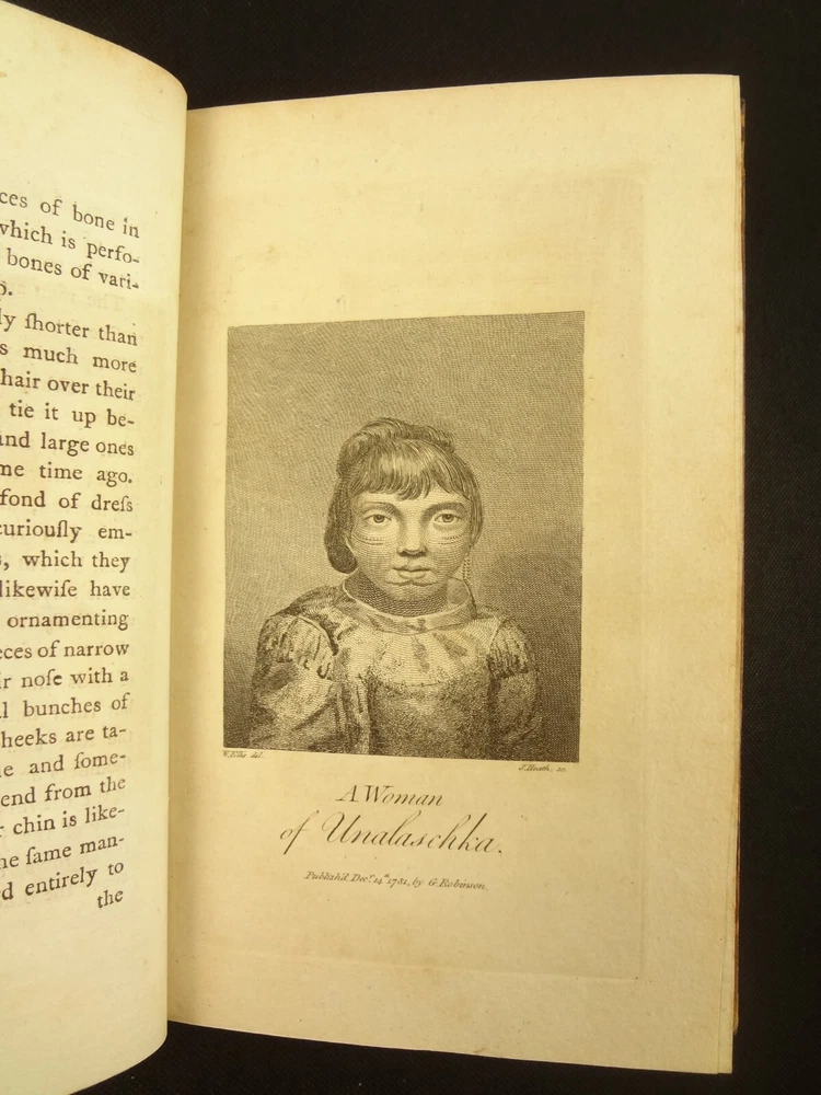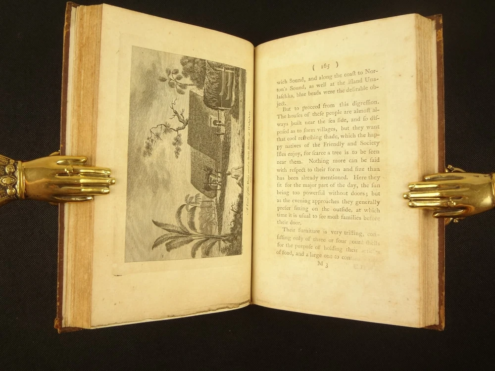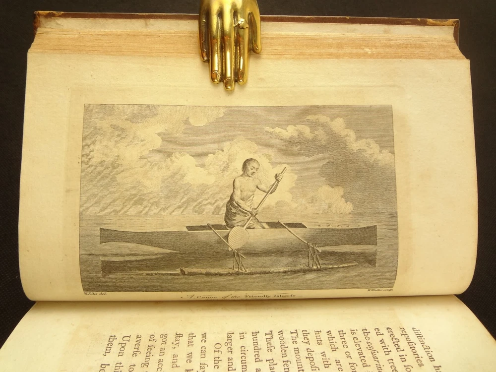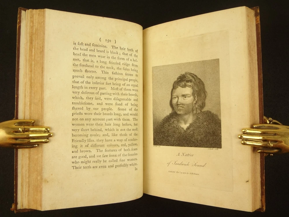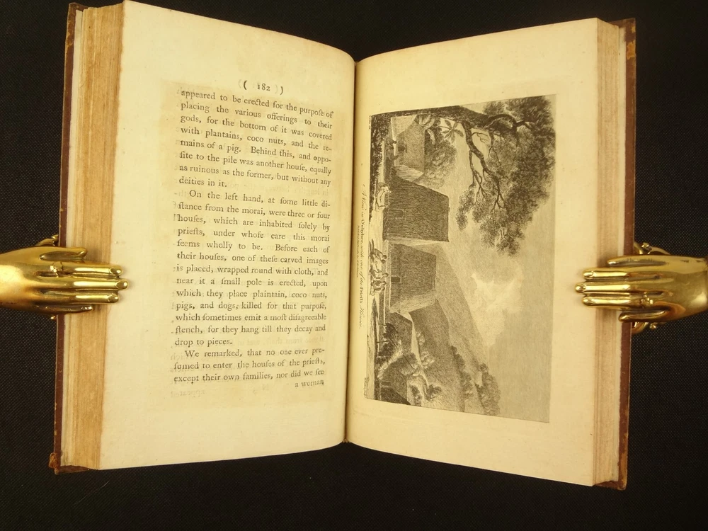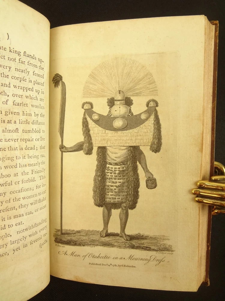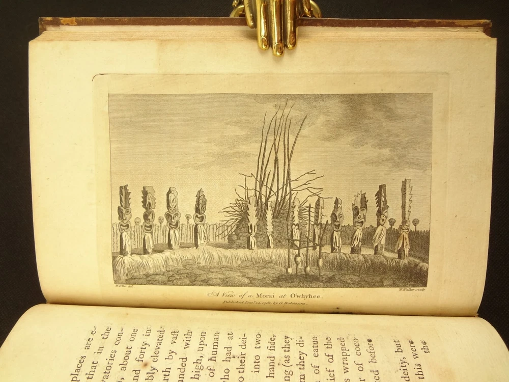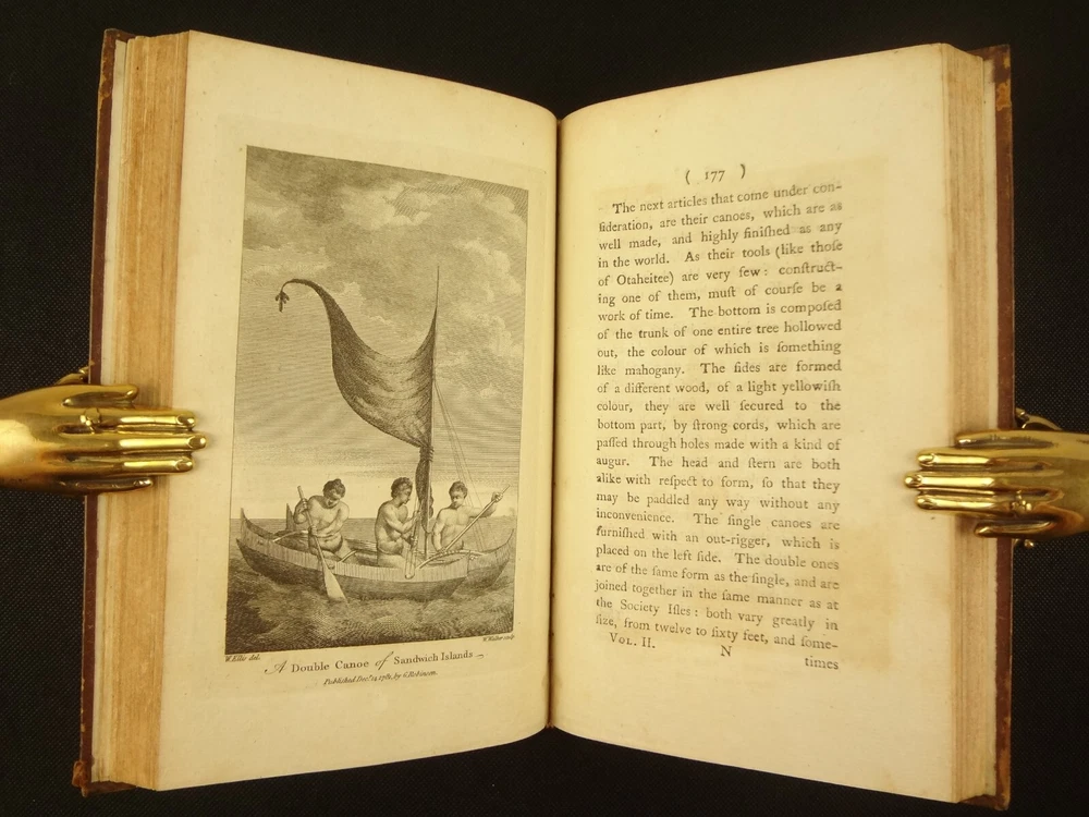 Complete with all 21 plates, and the map, a handsome copy of Ellis' recounting of Cook's last voyage; includes wonderful plates depicting Hawaii (among others). Second edition. Full title: 1783 An Authentic Narrative of a Voyage Performed by Captain Cook and Captain Clerke in his Majesty's Ships Resolution and Discovery, During the Years 1776, 1777, 1778, 1779 and 1780; In Search of a North-west Passage Between the Continents of Asia and America, including A faithful Account of all their Discoveries, and the unfortunate Death of Captain Cook. About the Voyage - James Cook's third and final voyage (12 July 1776 – 4 October 1780) took the route from Plymouth via Cape Town and Tenerife to New Zealand and the Hawaiian Islands, and along the North American coast to the Bering Strait. Its ostensible purpose was to return Omai, a young man from Raiatea, to his homeland, but the Admiralty used this as a cover for their plan to send Cook on a voyage to discover the Northwest Passage. HMS Resolution, to be commanded by Cook, and HMS Discovery, commanded by Charles Clerke, were prepared for the voyage which started from Plymouth in 1776. Omai was returned to his homeland and the ships sailed onwards, encountering the Hawaiian Archipelago, before reaching the Pacific coast of North America. The two charted the west coast of the continent and passed through the Bering Strait when they were stopped by ice from sailing either east or west. The vessels returned to the Pacific and called briefly at the Aleutians before retiring towards Hawaii for the winter. At Kealakekua Bay, a number of quarrels broke out between the Europeans and Hawaiians culminating in Cook's death in a violent exchange on 14 February 1779. The command of the expedition was assumed by Charles Clerke who tried in vain to find the passage before his own death. Under the command of John Gore the crews returned to a subdued welcome in London in October 1780. About this Recounting - As Captain Cook’s official account was prepared (from his journals), the ship’s crew rushed to cash-in on public interest. “As on the earlier voyages, unofficial accounts written by members of the crew were produced. The first to appear, in 1781, was a narrative based on the journal of John Rickman entitled Journal of Captain Cook's Last Voyage. Heinrich Zimmermann published in 1781 his diary Reise um die Welt mit Capitain Cook. Then in 1782 an account by William Ellis, Surgeon's Mate on the Discovery, was published, followed in 1783 by John Ledyard's A Journal of Captain Cook's Last Voyage published in Connecticut.” This is the second edition of Ellis’ account. There is some discussion of whether this is an update of Rickman's work, or Ellis' account, since the title page could be interpreted as stating that Ellis prepared the illustrations only. Bibliographic Details - English Short Title Catalogue number 006022580. Found in 22 of the world's libraries. Physical Attributes - Each volume measures approx. 22 x 13.5 x 2.5 cm. Leather bindings. Spine with four raised bands; three compartments with a central gilt medallion, Title, author and volume in gilt on black morocco in two compartments. Illustrated. 21 plates and one fold-out map. Pages: V1 - xii, 358, (1 leaf with directions to placement of the cuts). V2 - viii, 347 (verso of last leaf blank). Collation: V1 - A6, B-Z8, Aa4. V2 - A4, B-Y8, Z6. Condition - See pictures. Leather binding worn with edge wear, corner wear, some rubs, a few worm holes at joints, etc.; but they are holding well (not dried out and cracked). Signs of oiling of leather at endpapers (ghosted oil marks of turn-ins). Some cracking along hinges. Surprisingly devoid of any endpaper annotations (perhaps it hasn't been passed around much). Some toning and light foxing to paper throughout. Occasional darker spot, thumb, dog-eared corner. Deckled bottom edge H4 (good margins). Folding map with 2" tear at gutter/fold; some creasing along gutter edge. V1, quire S to X with more toning than other printed leaves. Light moisture mark top margin of volume 2, intermittent. Some ink lighter and darker in volume 2, with occasional stain; somewhat careless printing. Map and all plates accounted for and in their correct position (per the directions for placing the cuts). A handsome and complete copy; I'll be sorry to see it leave my shop.