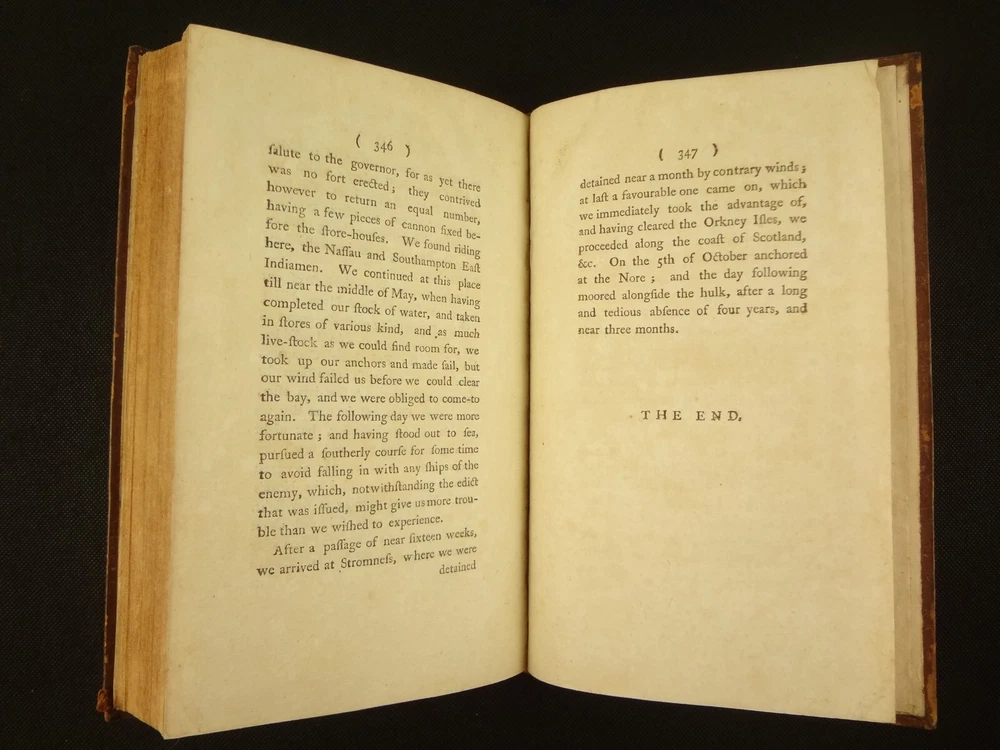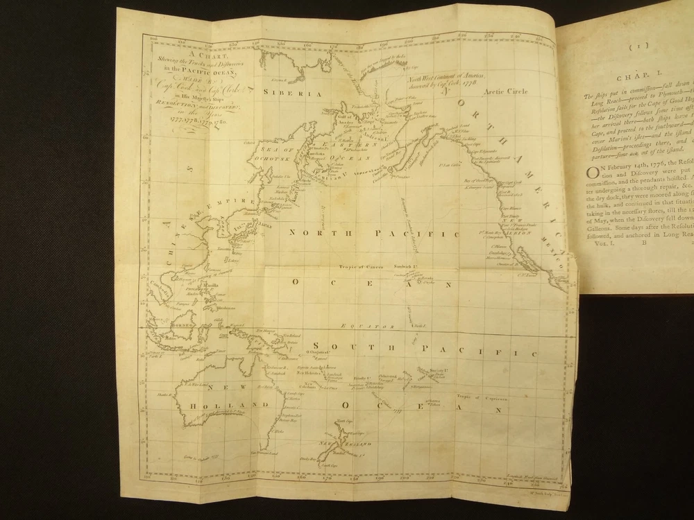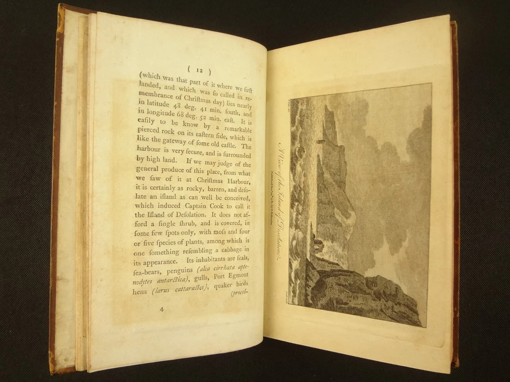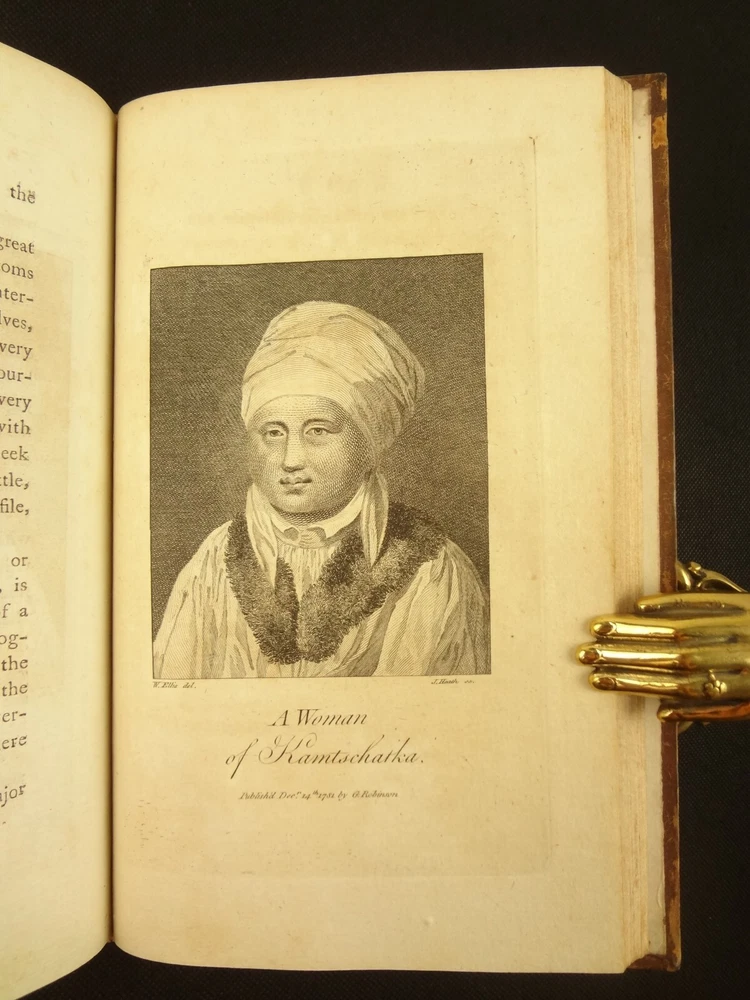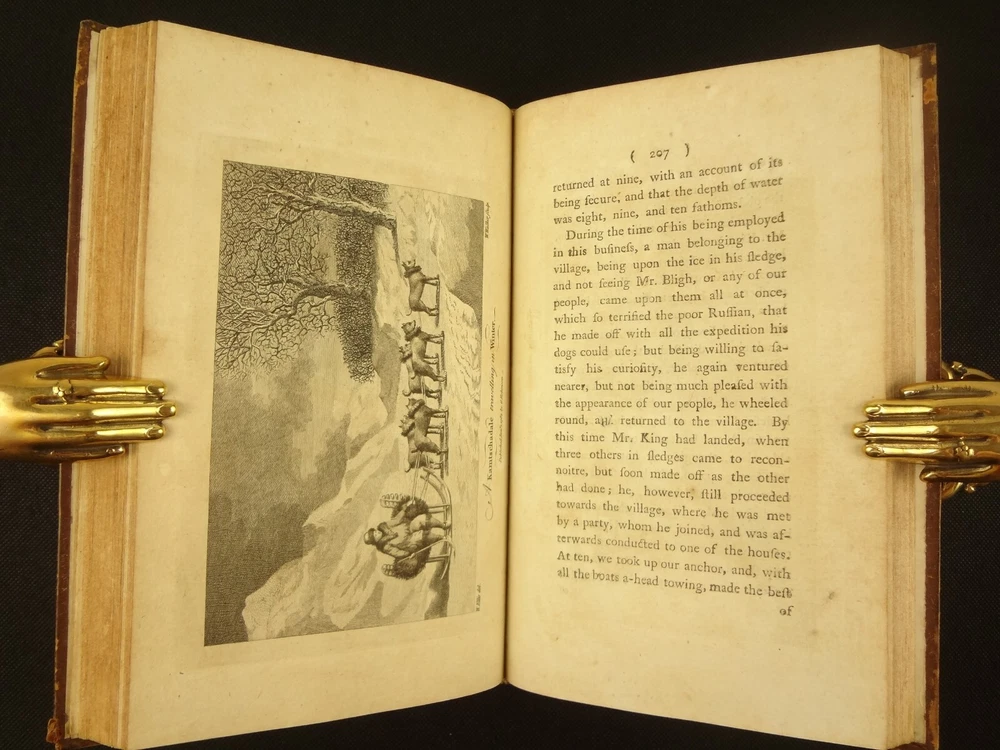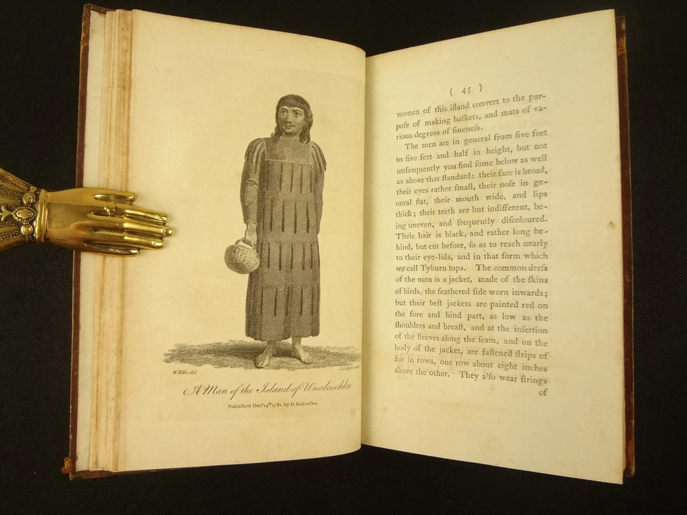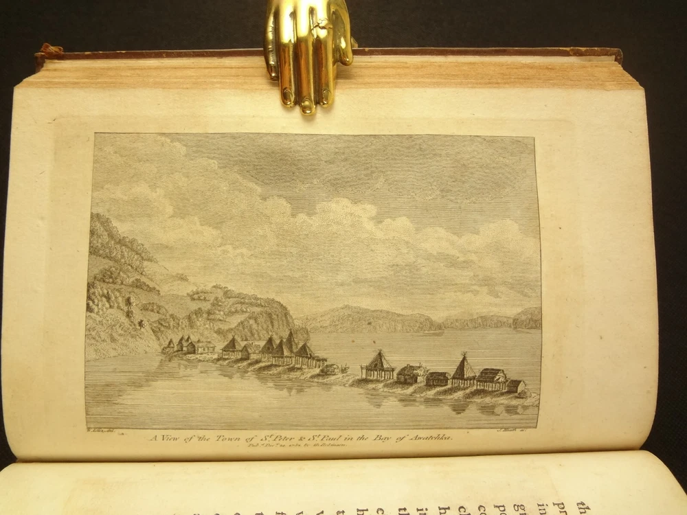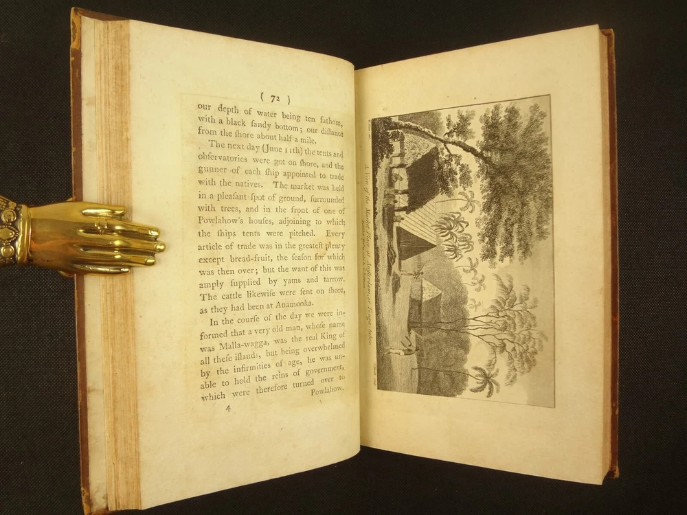Complete with all 21 plates, and the map, a handsome copy of Ellis' recounting of Cook's last voyage; includes wonderful plates depicting Hawaii (among others). Second edition. Full title: 1783 An Authentic Narrative of a Voyage Performed by Captain Cook and Captain Clerke in his Majesty's Ships Resolution and Discovery, During the Years 1776, 1777, 1778, 1779 and 1780; In Search of a North-west Passage Between the Continents of Asia and America, including A faithful Account of all their Discoveries, and the unfortunate Death of Captain Cook. About the Voyage - James Cook's third and final voyage (12 July 1776 – 4 October 1780) took the route from Plymouth via Cape Town and Tenerife to New Zealand and the Hawaiian Islands, and along the North American coast to the Bering Strait. Its ostensible purpose was to return Omai, a young man from Raiatea, to his homeland, but the Admiralty used this as a cover for their plan to send Cook on a voyage to discover the Northwest Passage. HMS Resolution, to be commanded by Cook, and HMS Discovery, commanded by Charles Clerke, were prepared for the voyage which started from Plymouth in 1776. Omai was returned to his homeland and the ships sailed onwards, encountering the Hawaiian Archipelago, before reaching the Pacific coast of North America. The two charted the west coast of the continent and passed through the Bering Strait when they were stopped by ice from sailing either east or west. The vessels returned to the Pacific and called briefly at the Aleutians before retiring towards Hawaii for the winter. At Kealakekua Bay, a number of quarrels broke out between the Europeans and Hawaiians culminating in Cook's death in a violent exchange on 14 February 1779. The command of the expedition was assumed by Charles Clerke who tried in vain to find the passage before his own death. Under the command of John Gore the crews returned to a subdued welcome in London in October 1780. About this Recounting - As Captain Cook’s official account was prepared (from his journals), the ship’s crew rushed to cash-in on public interest. “As on the earlier voyages, unofficial accounts written by members of the crew were produced. The first to appear, in 1781, was a narrative based on the journal of John Rickman entitled Journal of Captain Cook's Last Voyage. Heinrich Zimmermann published in 1781 his diary Reise um die Welt mit Capitain Cook. Then in 1782 an account by William Ellis, Surgeon's Mate on the Discovery, was published, followed in 1783 by John Ledyard's A Journal of Captain Cook's Last Voyage published in Connecticut.” This is the second edition of Ellis’ account. There is some discussion of whether this is an update of Rickman's work, or Ellis' account, since the title page could be interpreted as stating that Ellis prepared the illustrations only. Bibliographic Details - English Short Title Catalogue number 006022580. Found in 22 of the world's libraries. Physical Attributes - Each volume measures approx. 22 x 13.5 x 2.5 cm. Leather bindings. Spine with four raised bands; three compartments with a central gilt medallion, Title, author and volume in gilt on black morocco in two compartments. Illustrated. 21 plates and one fold-out map. Pages: V1 - xii, 358, (1 leaf with directions to placement of the cuts). V2 - viii, 347 (verso of last leaf blank). Collation: V1 - A6, B-Z8, Aa4. V2 - A4, B-Y8, Z6. Condition - See pictures. Leather binding worn with edge wear, corner wear, some rubs, a few worm holes at joints, etc.; but they are holding well (not dried out and cracked). Signs of oiling of leather at endpapers (ghosted oil marks of turn-ins). Some cracking along hinges. Surprisingly devoid of any endpaper annotations (perhaps it hasn't been passed around much). Some toning and light foxing to paper throughout. Occasional darker spot, thumb, dog-eared corner. Deckled bottom edge H4 (good margins). Folding map with 2" tear at gutter/fold; some creasing along gutter edge. V1, quire S to X with more toning than other printed leaves. Light moisture mark top margin of volume 2, intermittent. Some ink lighter and darker in volume 2, with occasional stain; somewhat careless printing. Map and all plates accounted for and in their correct position (per the directions for placing the cuts). A handsome and complete copy; I'll be sorry to see it leave my shop.