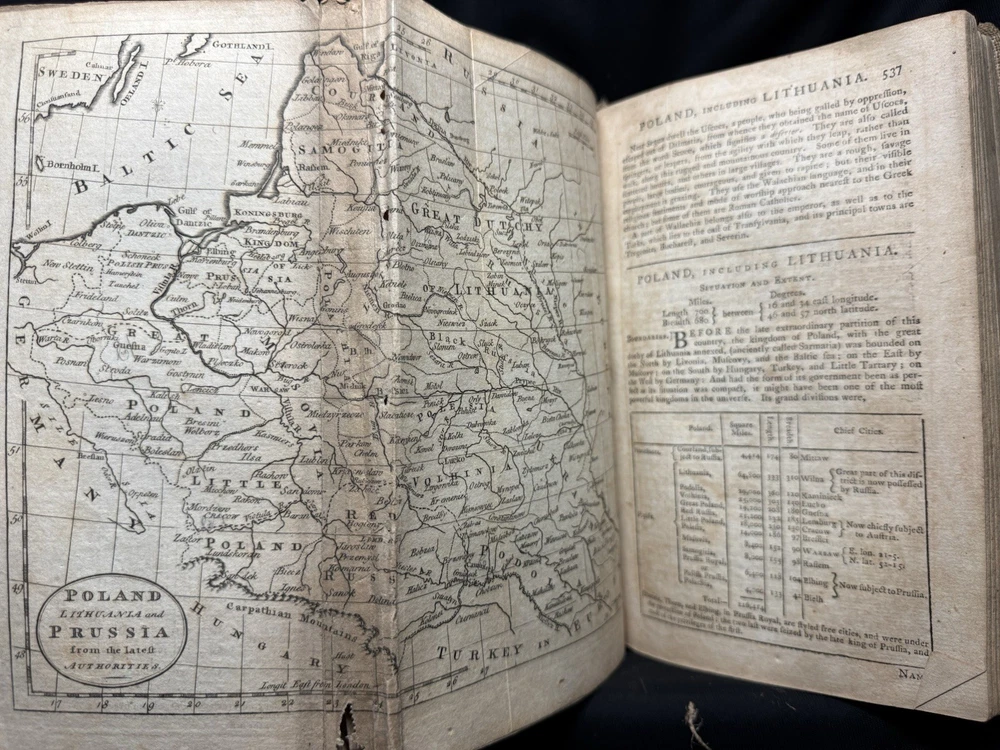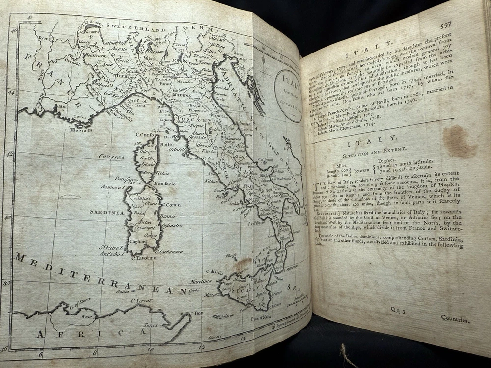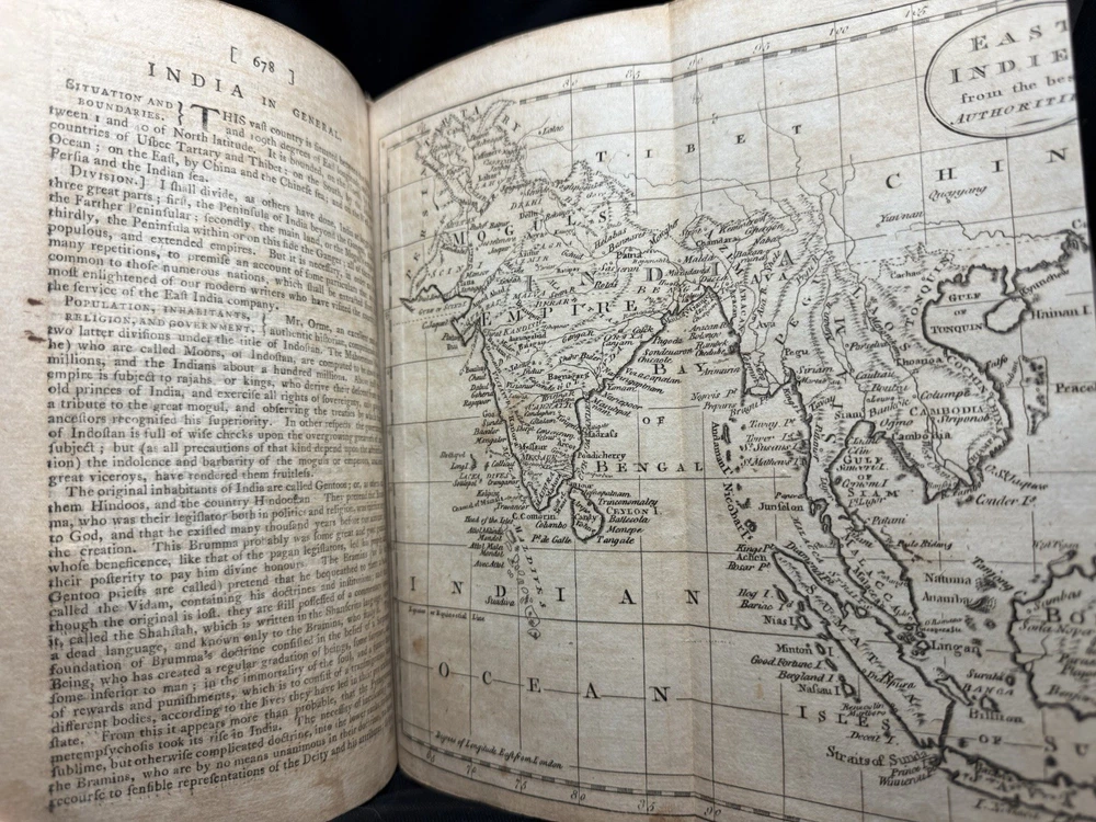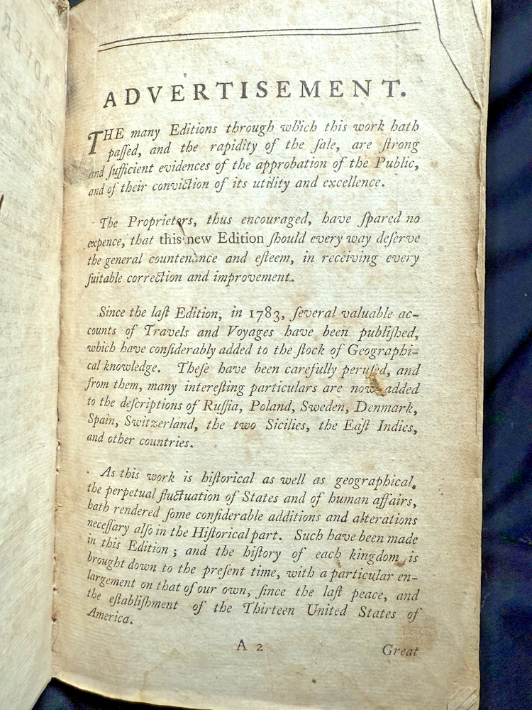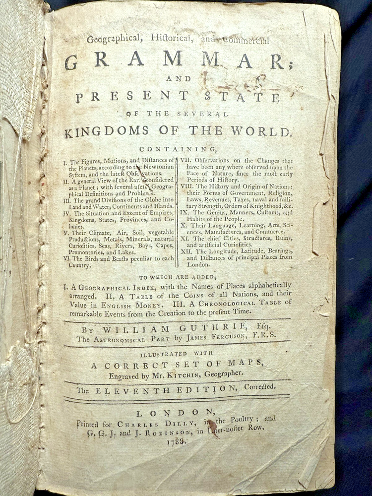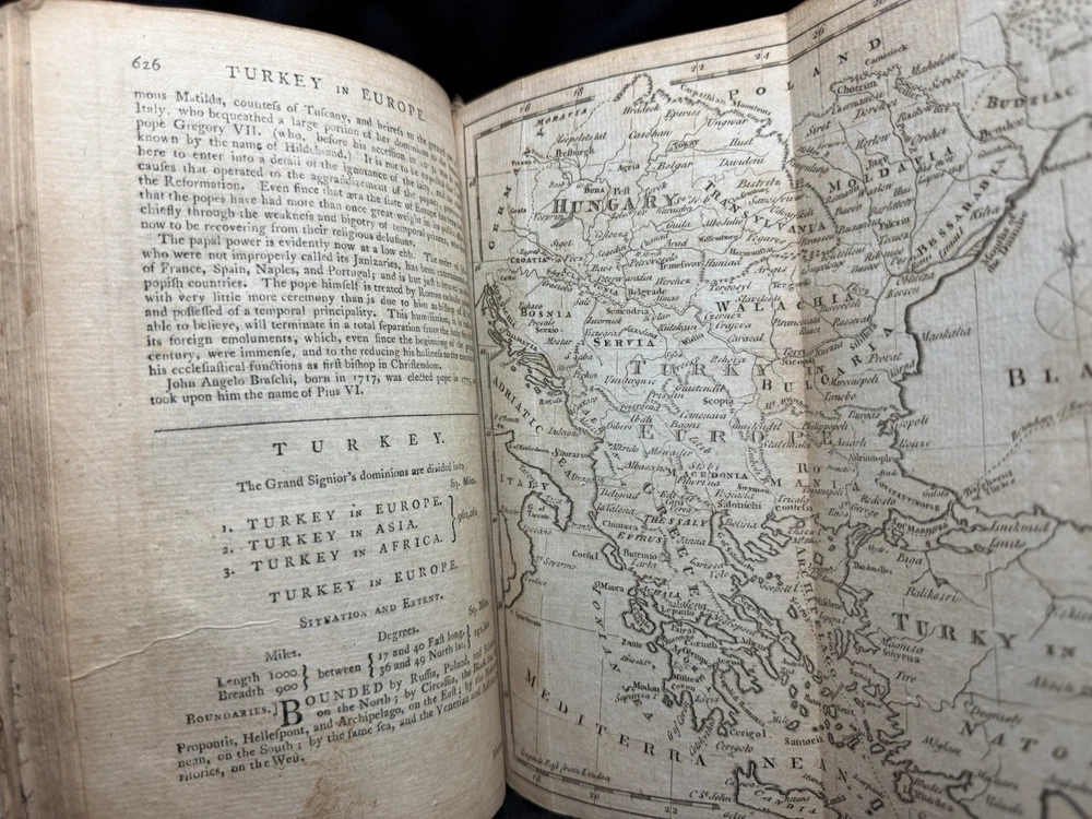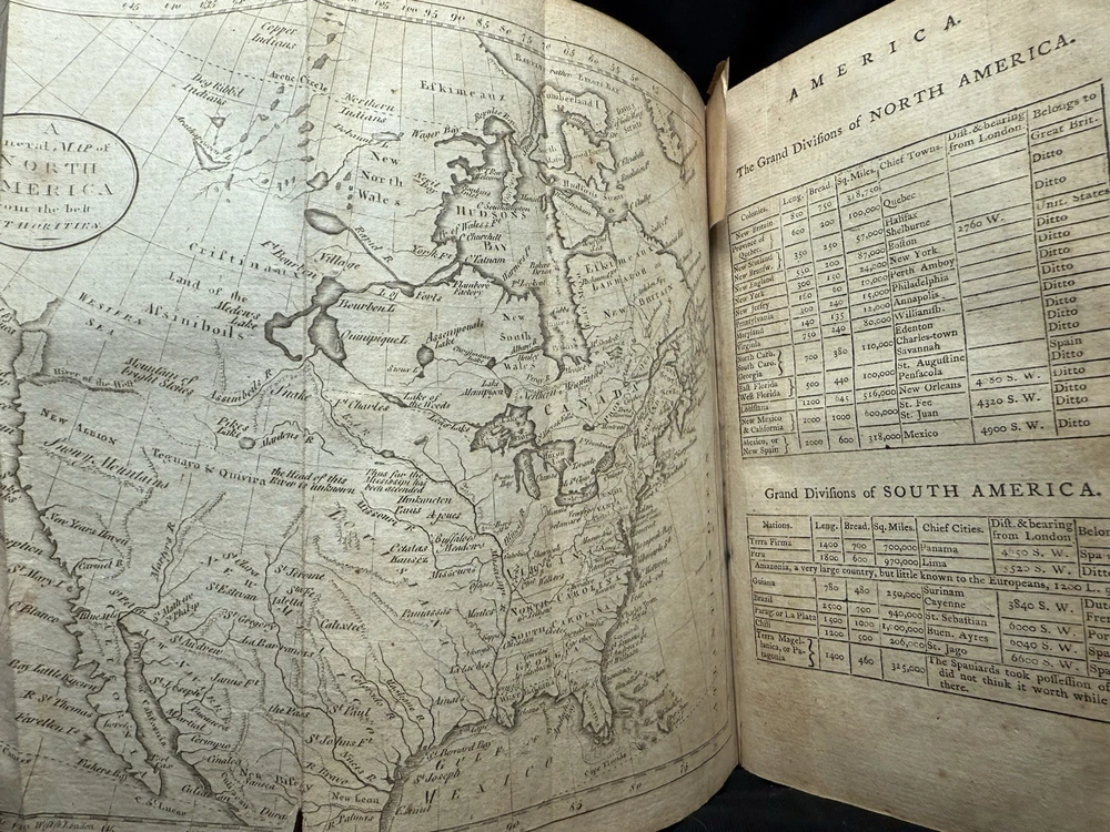 Delve into the world of 18th-century cartography and historical narrative with the 1789 'Geographical, Historical Kingdoms of the World'. This rare atlas offers a comprehensive view of the globe, enriched with detailed maps that can be pulled out for an interactive learning experience. Authored by William Guthrie, Esq., this piece is a testament to the era's fascination with the lands and peoples that compose our diverse planet. Updated to include the 13 United States. Published in London by Charles Dilly, G.G. J And J. Robinson, this collectible is not only a scholarly resource but also a work of art, featuring illustrations that enhance its visual appeal. Bound in leather, it's a fine representation of the era's geographical and historical understanding, printed in 1789 – a true gem for enthusiasts of history and cartography.
