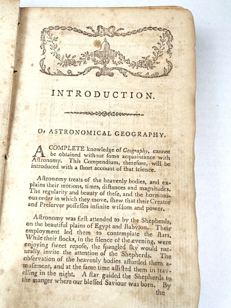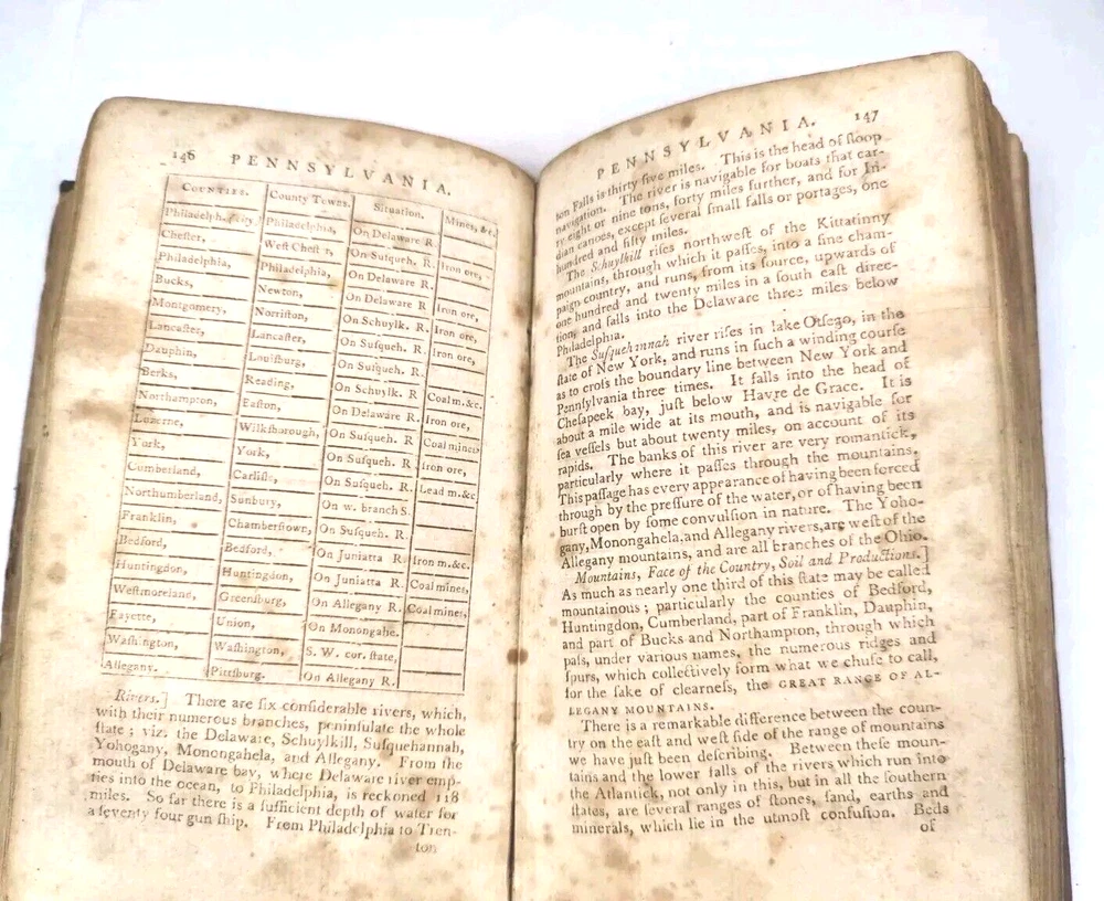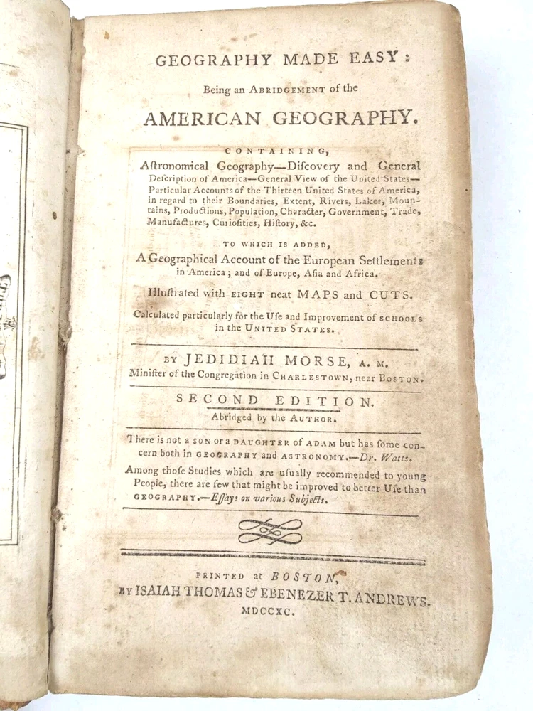 Geography Made Easy An abridgement of the American Geography Compiled by David Heston "To the young masters and misses throughout the United States, the following easy introduction to the useful and entertaining science of geography, complied particularly for the use, is dedicated, with his warmfelt wishes, for their early improvement in every thing that shall make them truly happy, by their sincere friend, Jedidiah Morse" Contains an astronomical geography- Discovery and general description of America - Particular accounts of the thirteen states of America, in regard to their boundaries, extent, rivers, lakes, mountains, productions, population, character, government, trade, manufactures, curiosities, and history. This second edition, abridged by the author, includes a geographical account of the European settlements in America as well as eight illustrated maps and cuts. Boston Isaiah Thomas & Ebenezer T. Andrews 1790 4 1/2'' by 7" 322 Pages I have been an eBay seller since 2000, and a collector/treasure hunter since I was in elementary school. I love being able to rescue items that were destined for the trash heap and find new homes for them with people who will appreciate them. All reasonable offers will be considered! I do my best to describe my items as accurately as possible, but may miss details or make mistakes from time to time. However, if you are unsatisfied for any reason, please reach out to me so I can work to make things right. Thank you for your interest! 100% satisfaction guarantee or receive a quick refund 20% of the sale of this item will be donated to a youth-serving organization EB 92.6