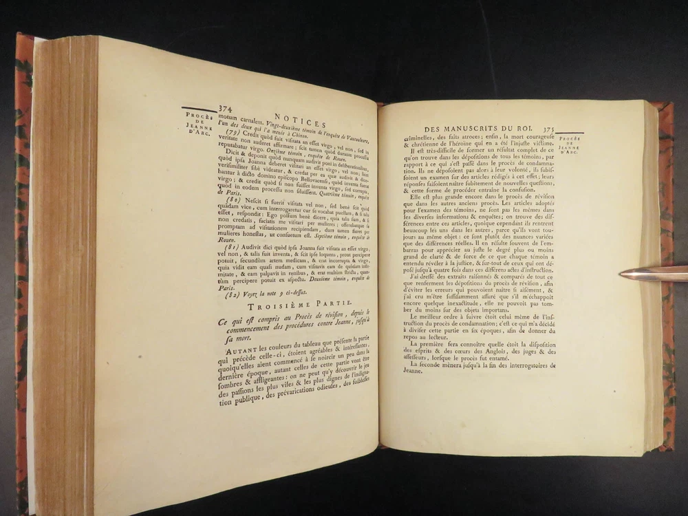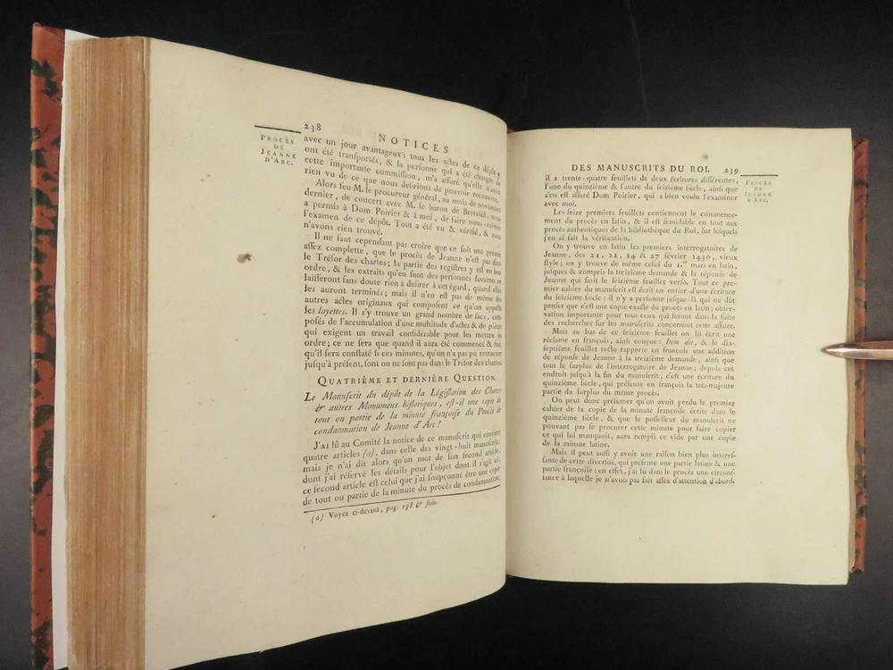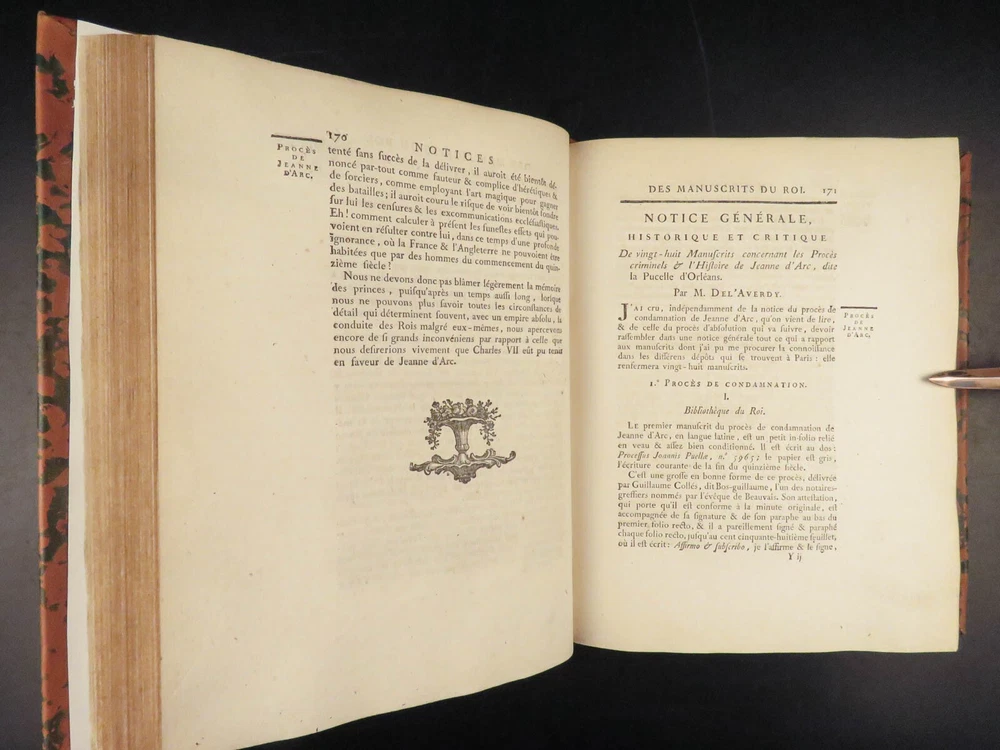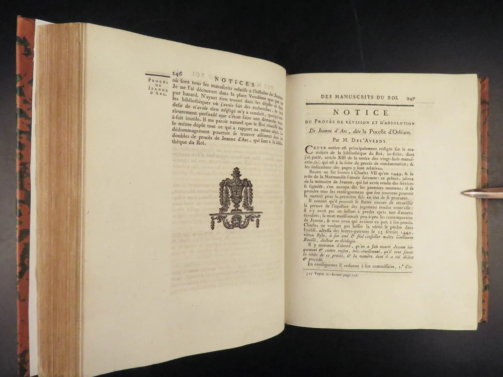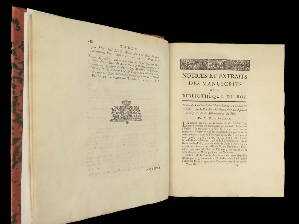 1790 JOAN of ARC 1 ed Academie Royale Science MAPS of Rouen Arabic Pilgrimages The Biblioteque du Roi was an 18 th -century, pre-French Revolution department of research known for concerning itself with history and science studies. Numerous articles, essays, and reports were published by the Academie Royale; however, only three collections of treatises and essays were published prior to the French Revolution and the ultimate dissolution of the academy. This third, and certainly most famous volume deals primarily with the trial of Joan of Arc . It includes numerous articles by François de l'Alverdy. It also includes: · Commentary on 15 th -century Arabic manuscripts that describe pilgrimages to Al-Aqsa mosque in Jerusalem · History and references to the city of Rouen, including maps Item number: #27472 Price: $599 various Notices et extraits des manuscrits de la bibliothèque du roi Paris: De imprimerie royale, 1790. First edition. Details : · Collation: Complete with all pages; o [2], viii, 650 o 3 engraved plates · Language: French / Latin · Binding: Leather; tight and secure · Size: ~10.5in X 8.5in (26.5cm x 21.5cm) Our Guarantee: Very Fast. Very Safe. Free Shipping Worldwide. Customer satisfaction is our priority! Notify us with 7 days of receiving, and we will offer a full refund without reservation!
