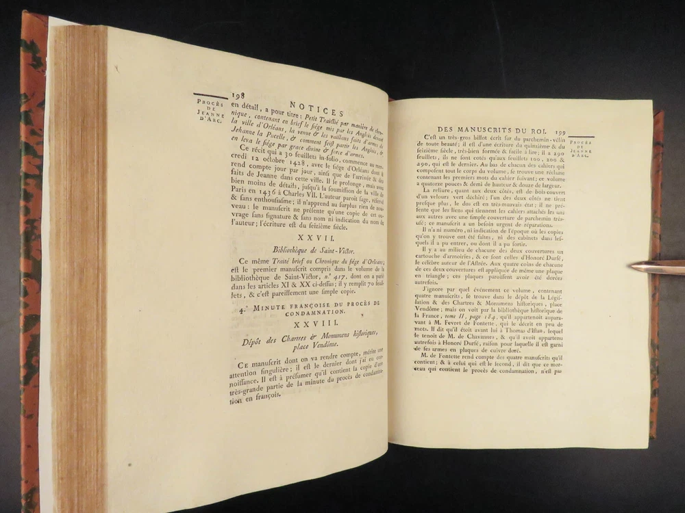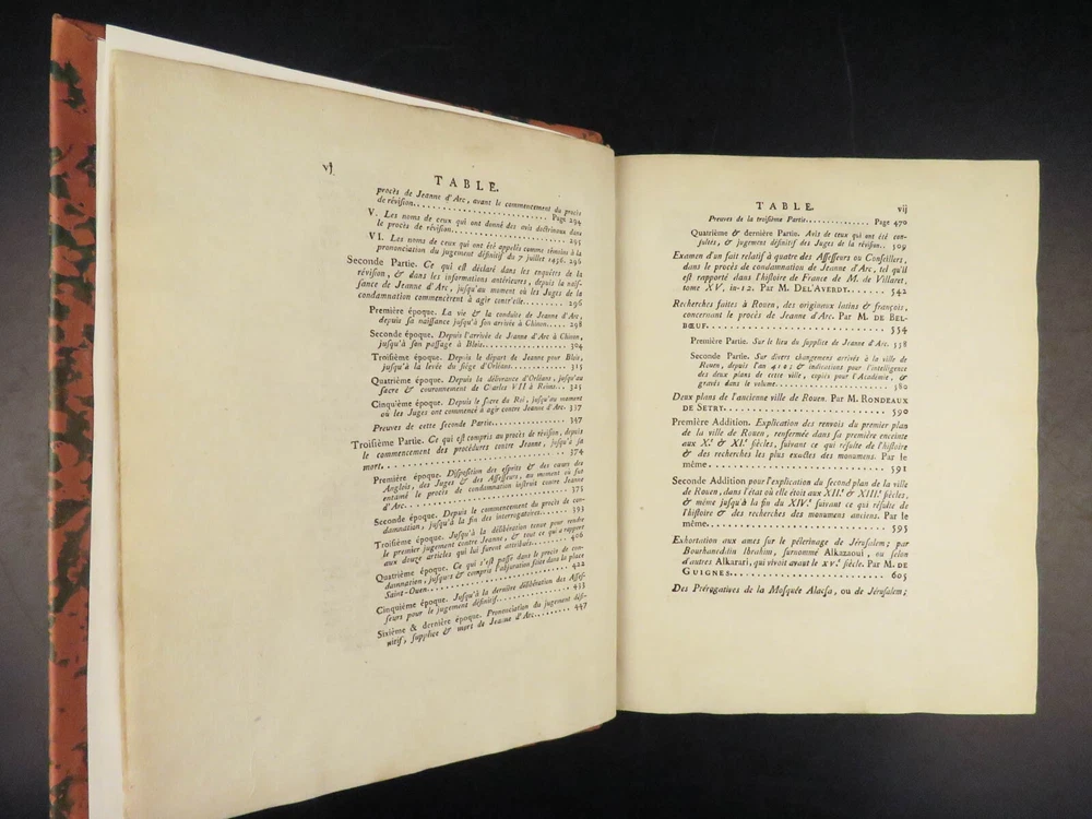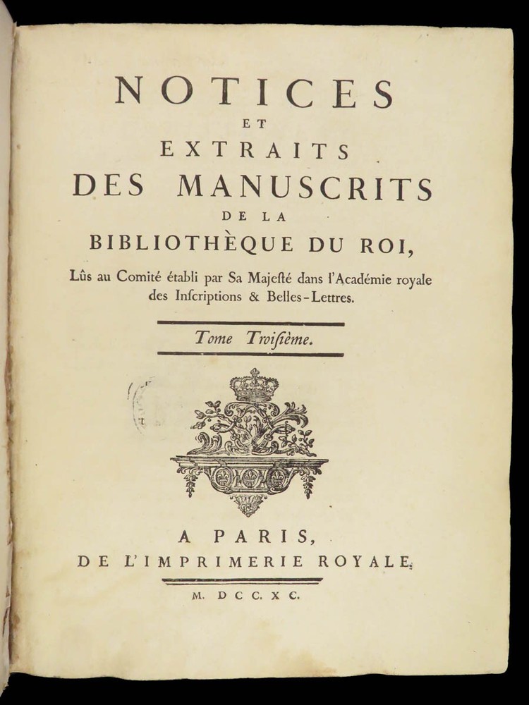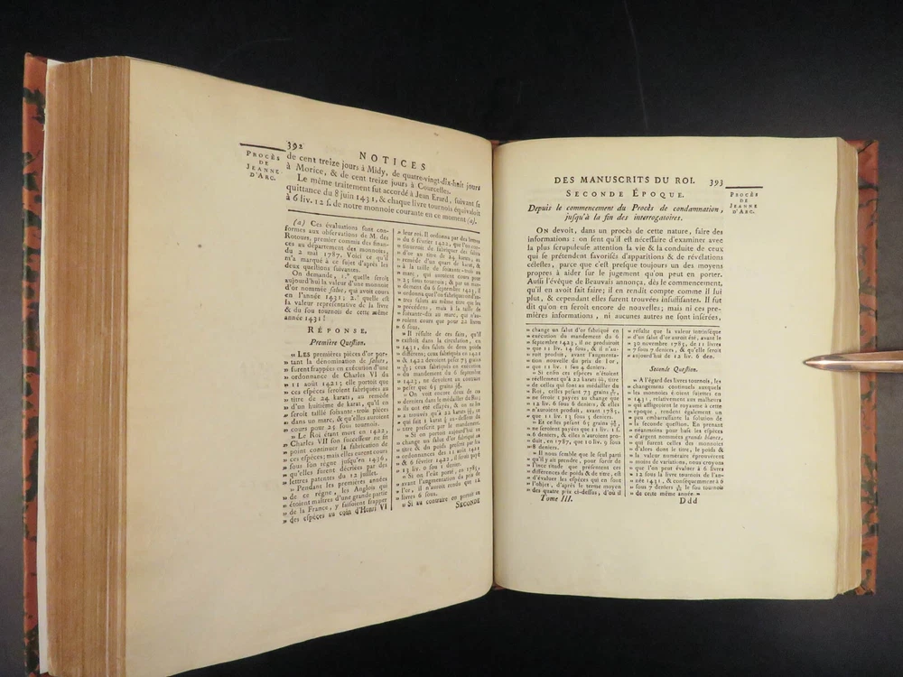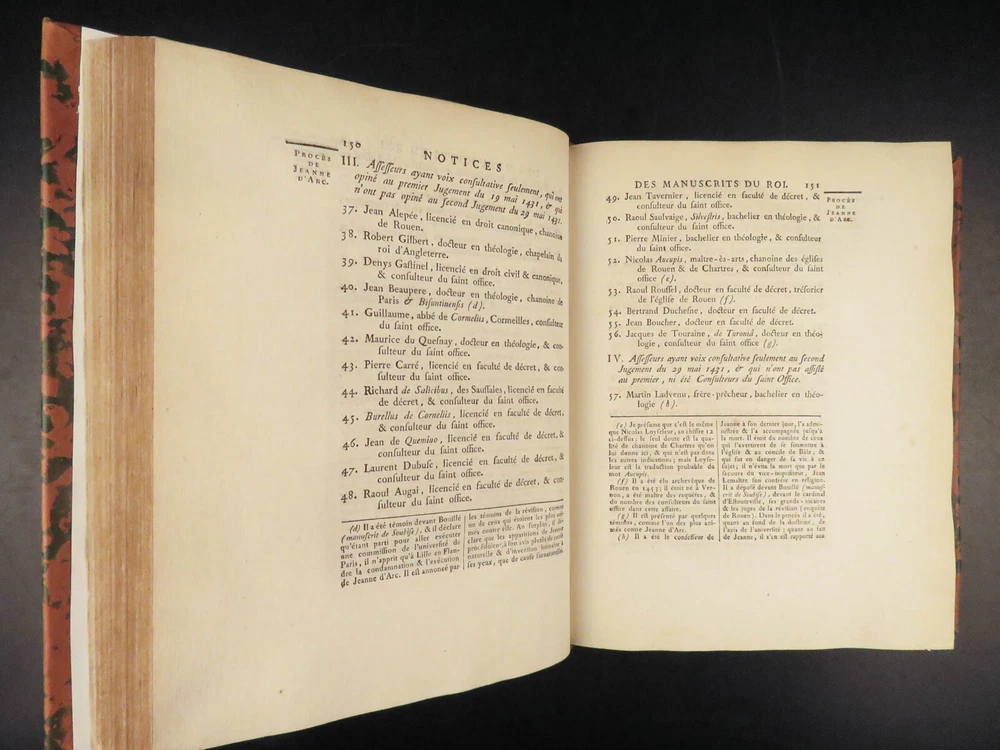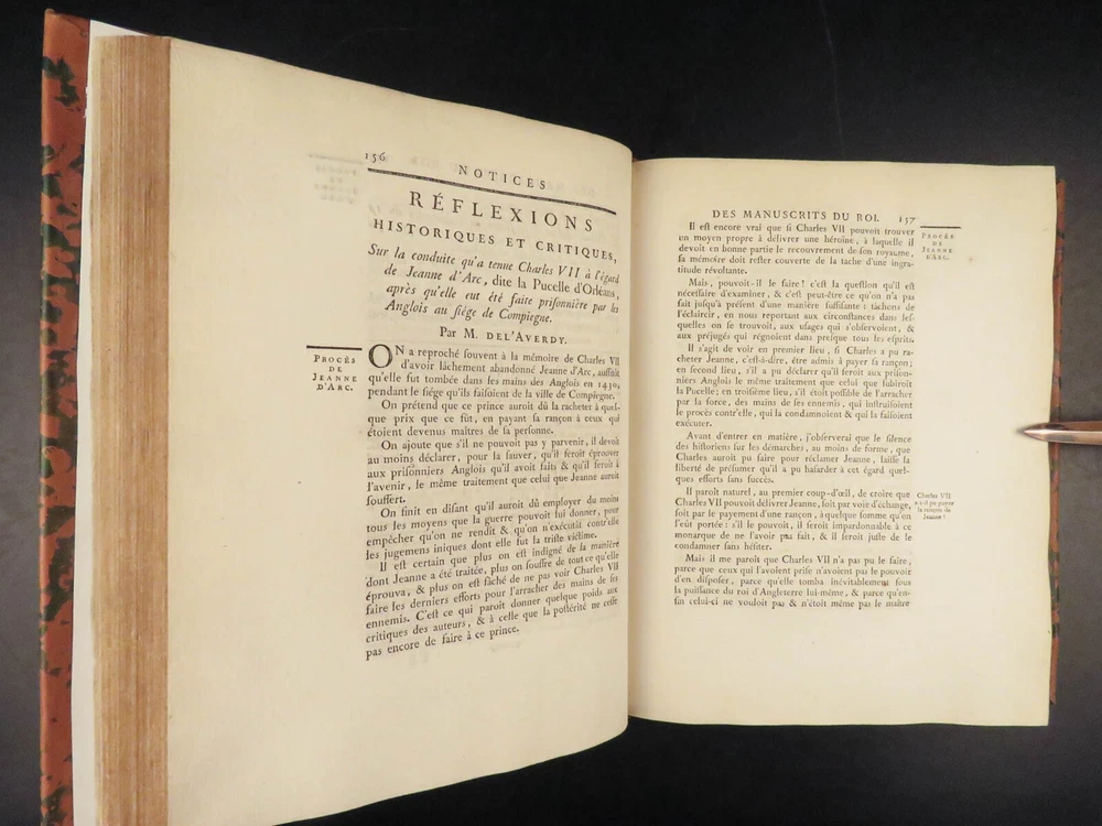 1790 JOAN of ARC 1 ed Academie Royale Science MAPS of Rouen Arabic Pilgrimages The Biblioteque du Roi was an 18 th -century, pre-French Revolution department of research known for concerning itself with history and science studies. Numerous articles, essays, and reports were published by the Academie Royale; however, only three collections of treatises and essays were published prior to the French Revolution and the ultimate dissolution of the academy. This third, and certainly most famous volume deals primarily with the trial of Joan of Arc . It includes numerous articles by François de l'Alverdy. It also includes: · Commentary on 15 th -century Arabic manuscripts that describe pilgrimages to Al-Aqsa mosque in Jerusalem · History and references to the city of Rouen, including maps Item number: #27472 Price: $599 various Notices et extraits des manuscrits de la bibliothèque du roi Paris: De imprimerie royale, 1790. First edition. Details : · Collation: Complete with all pages; o [2], viii, 650 o 3 engraved plates · Language: French / Latin · Binding: Leather; tight and secure · Size: ~10.5in X 8.5in (26.5cm x 21.5cm) Our Guarantee: Very Fast. Very Safe. Free Shipping Worldwide. Customer satisfaction is our priority! Notify us with 7 days of receiving, and we will offer a full refund without reservation!