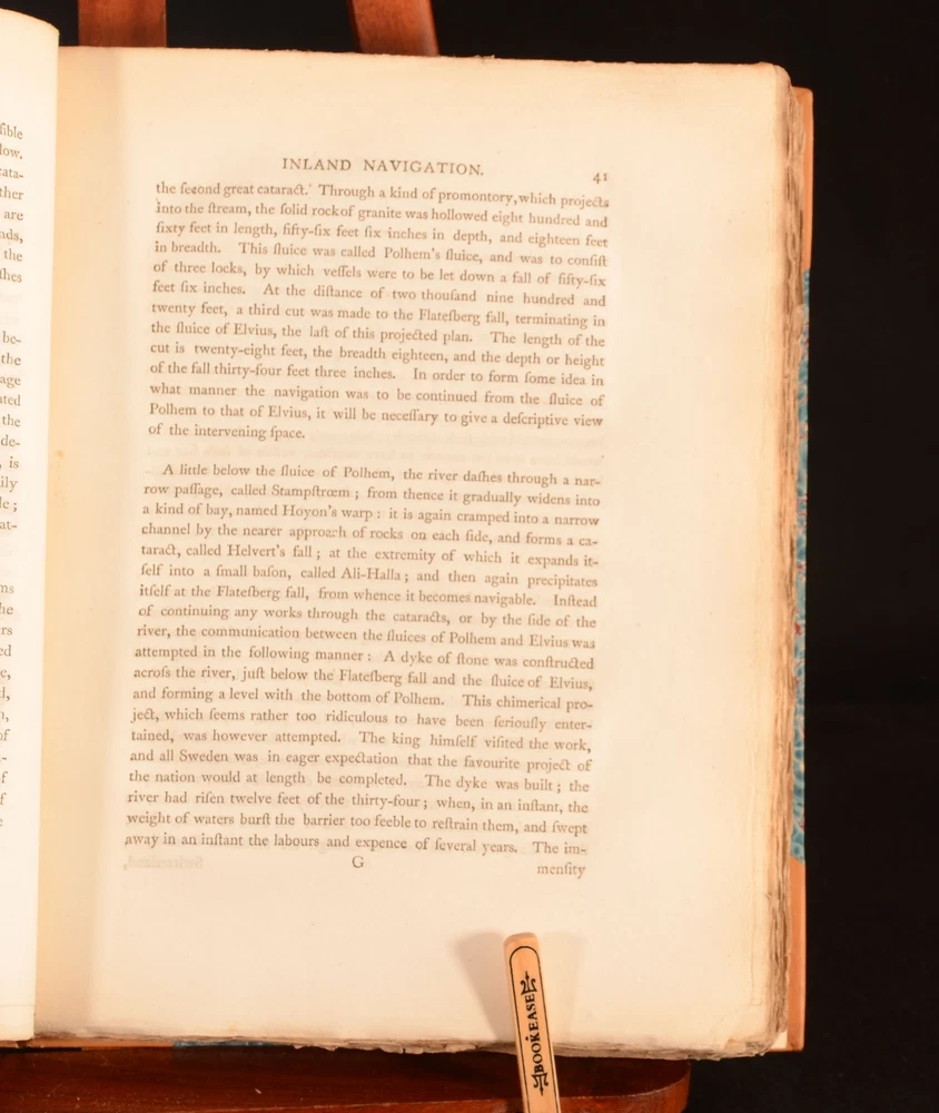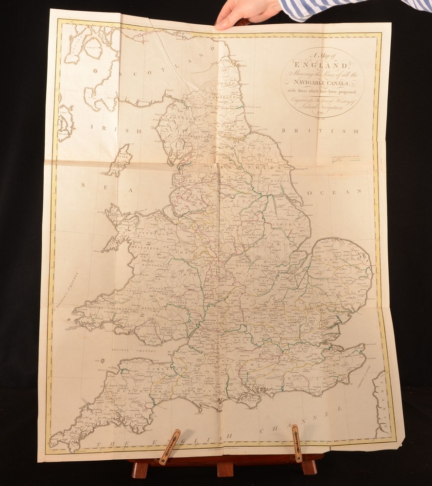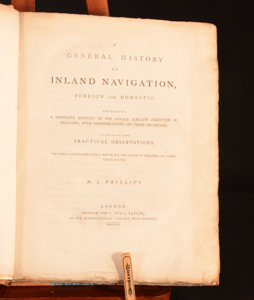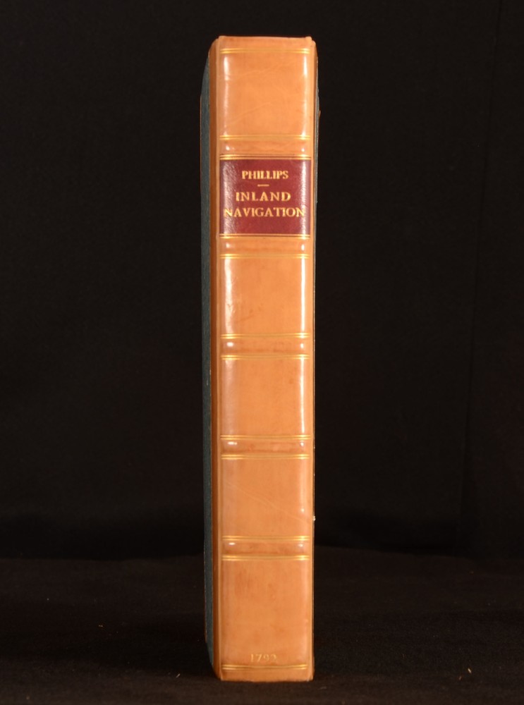 Click here to see our other books! A General History of Inland Navigation, Foreign and Domestic: Containing a Complete Account of the Canals Already Executed in England, with Considerations of those Projected. To which are added Practical Observations. J Phillips 1792 I and J Phillips : London 11.5" by 9" 369pp, [12] SUMMARY John Phillips' condensed history of canals in England, looking at their usage for travel and and trade purposes. An Important Work,Folding Maps,Illustrated,Leather Binding,Signed Binding Overall Condition: Near Fine This book weighs 2 KG when packed UK Postage: £ 3.99 US Postage: £ 29.99 EU Postage : £ 21.99 European Postage: £ 23.99 Asia Postage: £ 37.99 Worldwide Postage: £ 38.99 DESCRIPTION John Phillips is thought to be the first person to document and research British Canals, writing this detailed book as a result. Writing at the time of the industrial revolution in England, Phillips’ enthusiasm and passion for the subject is clear on the page. Phillips’ was a great surveyor of canals, and his works were widely read and published by his peers. Phillips thought that canals provided a method of easy and secure communication to other parts of the country. ‘General History of Inland Navigation’ looks at how the canals in England are used, and how they could be used for trade and communication purposes. Phillips considers distances, timing, and prices. With a colour-coded fold-out map in a pocket to the rear pastedown. The map has some edgewear, and minor tears to fold, however doesn’t affect the image. Four plates to the rear; ‘Lock for a Canal’, ‘Aqueduct for a Canal’, ‘Bridge for a Canal’, ‘Accommodation Bridge for a Canal’. Collated, complete. With two tables to the rear; ‘A Table of Canals in England’, documenting the length, rise, and fall of canals in England, and ‘Difference of Prices of Carriage of Goods by Canal and Land’. Binders stamp to the verso of the front endpaper, ‘Bound by Frost & ... Baym, England’. CONDITION In a half calf binding with marbled paper boards. Externally smart. Light marking to the leather of the boards and spine. Very light fading to the top of the leather to the rear board, and to the top of the spine. Light rubbing to the raised bands. Binders stamp to the verso of the front endpaper, ‘Bound by Frost & ... Baym, England’. Internally, firmly bound. Pages are bright with some age-toning to the edges. Pages are generally clean with the odd handling mark and odd spot. Overall Condition: Near Fine GLOSSARY OF TERMS Overall Condition (Dustwrapper condition rating is shown after that for the book itself, where a dustwrapper is present) Fine - Very well preserved copy showing very little wear Very Good Indeed - Only one or two minor faults, really a very attractive copy Very Good - Quite a wide term meaning no major faults but probably several smaller ones often expected given the age of the book, but still a respectable copy Good - Meaning not very good. Some more serious faults as will be described in the condition report under 'condition' Good Only - Meaning one or more faults that could really do with repair Fair - As with good only above but with other faults leaving a compromised copy even after repair Poor - Really bad and possibly seriously incomplete. We only sell books in this condition where their rarity or value makes them attractive none the less. Major defects will be described. GUARANTEE We offer a full money back guarantee on our descriptions. Please ask for details and conditions. We prefer PAYPAL. If you pay via PAYPAL we will post the item off the same or the next working day with the postage you have selected. Please note we cannot accept USD cheques