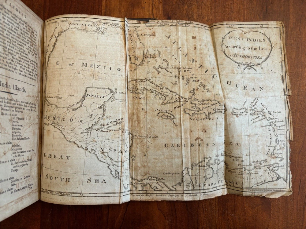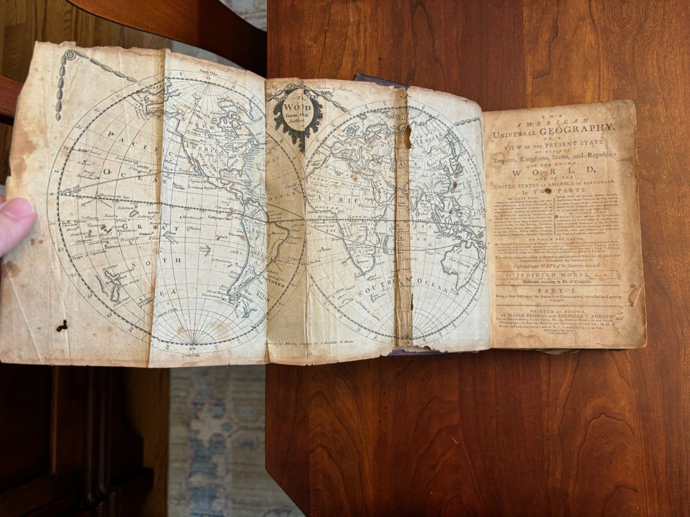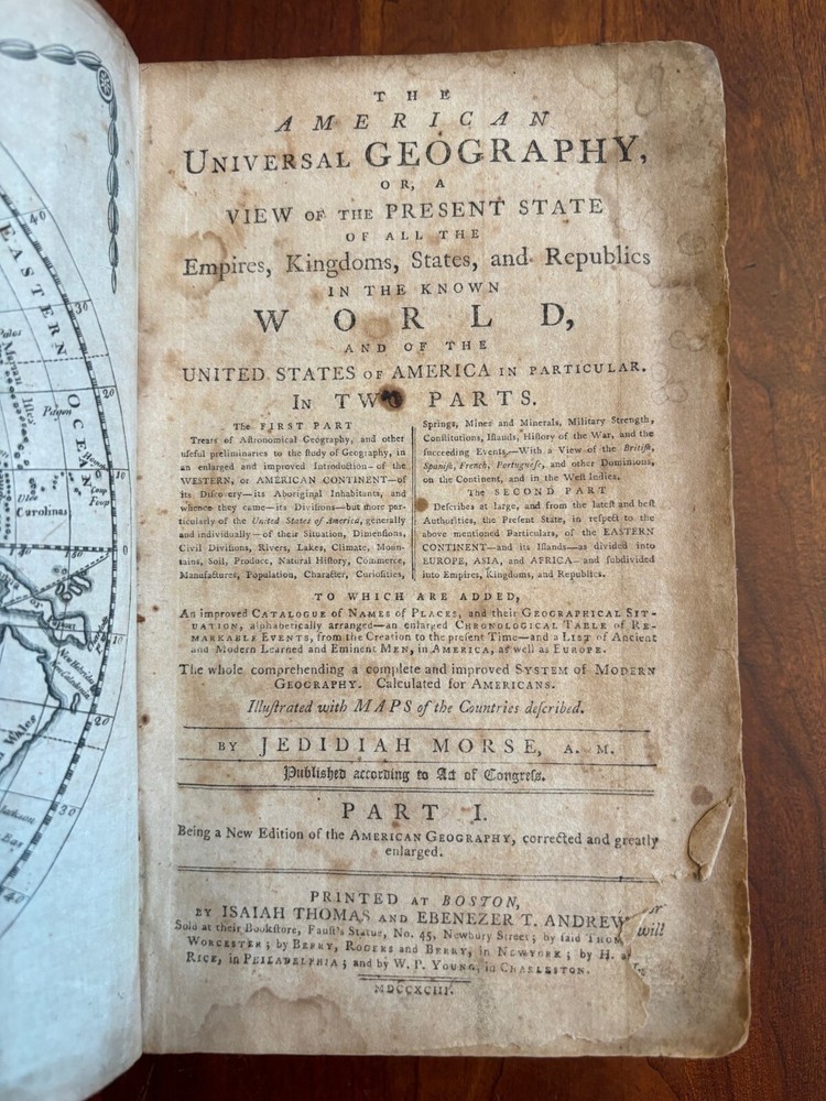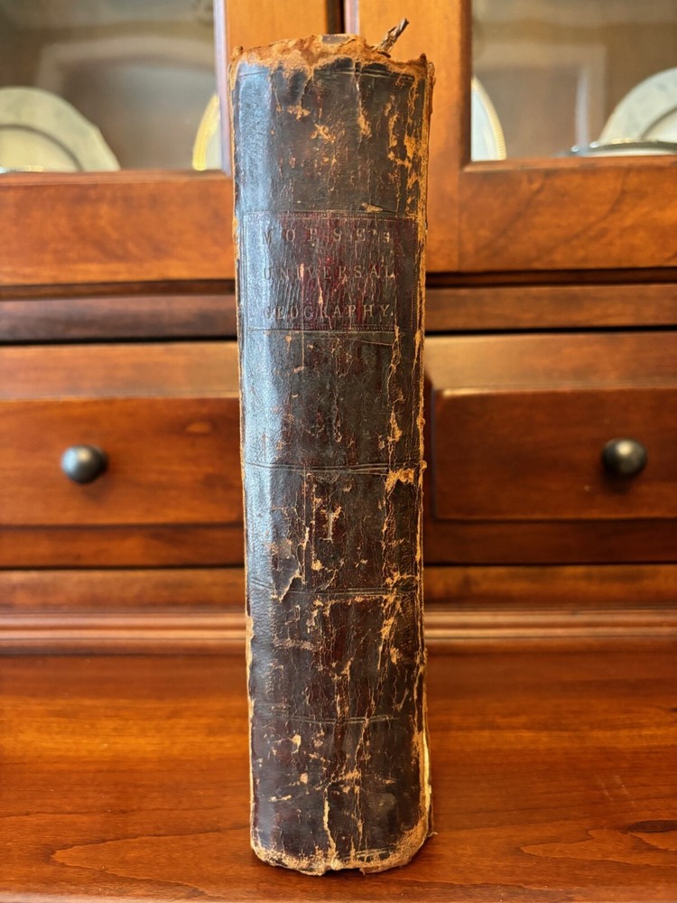 THE AMERICAN UNIVERSAL GEOGRAPHY or a View of the Present State of All the Empires, Kingdoms, States and Republics in the known world and of the United States of America in particular. Part I. By Jedidiah Morse Published: Isaiah Thomas and Ebenezer T. Andrews, Boston, Worster, New York, Philadelphia and by W.P. Young in Charleston, SC, 1793. 2nd American edition. [1st 1789, 3rd 1796]. Hardcover in full calf leather binding. 5.5" x 8.5”, 696 pp, bookplate on front paste down, “James Adair’s Book No. 24”: Part I: frontispiece foldout map intact, Artificial Sphere (opp. P. 32), foldout map of Northern and Middle States remnant (opp p. 308), foldout map District of Main (opp. P. 344), foldout map of Pennsylvania (opp. p. 468), foldout map of VA,NC, SC and GA (opp. pg 532), foldout map of South America (opp. p. 642), foldout map of West Indies(opp. p. 666). Not Ex-Lib. I've done my best to describe the books, but if you have additional questions, please don't hesitate to send me an e-mail.