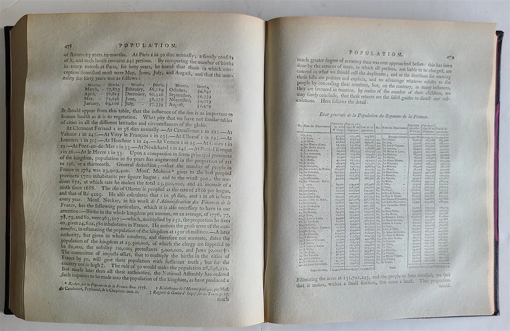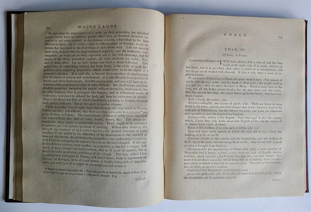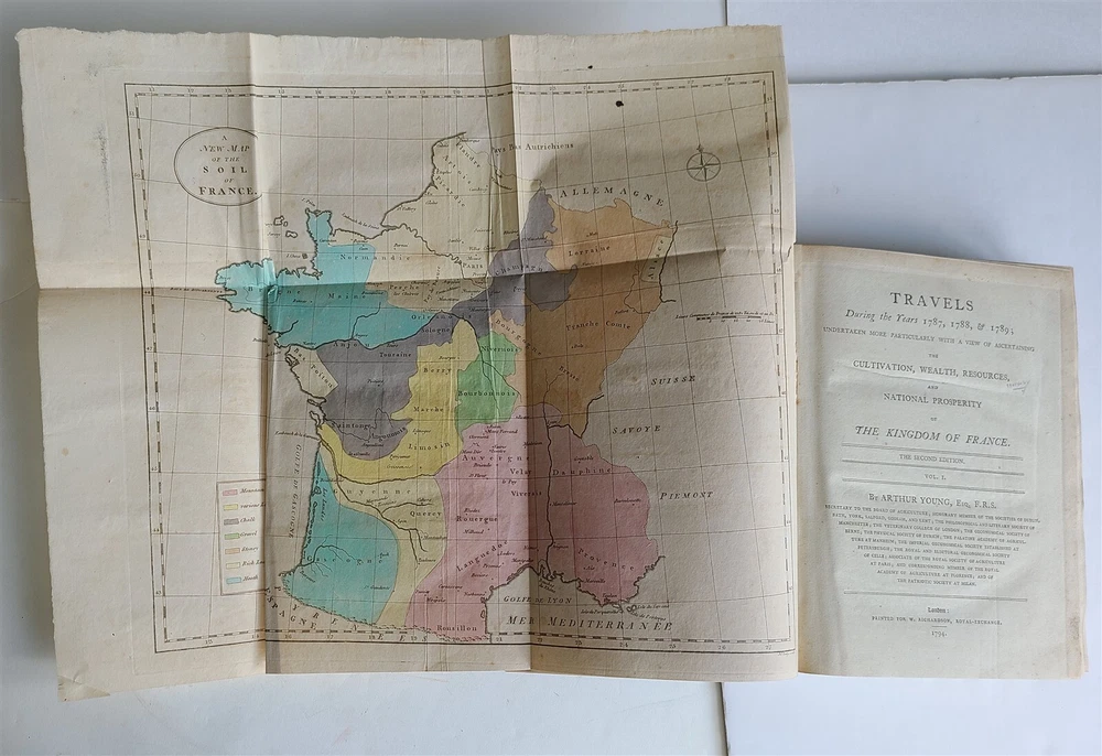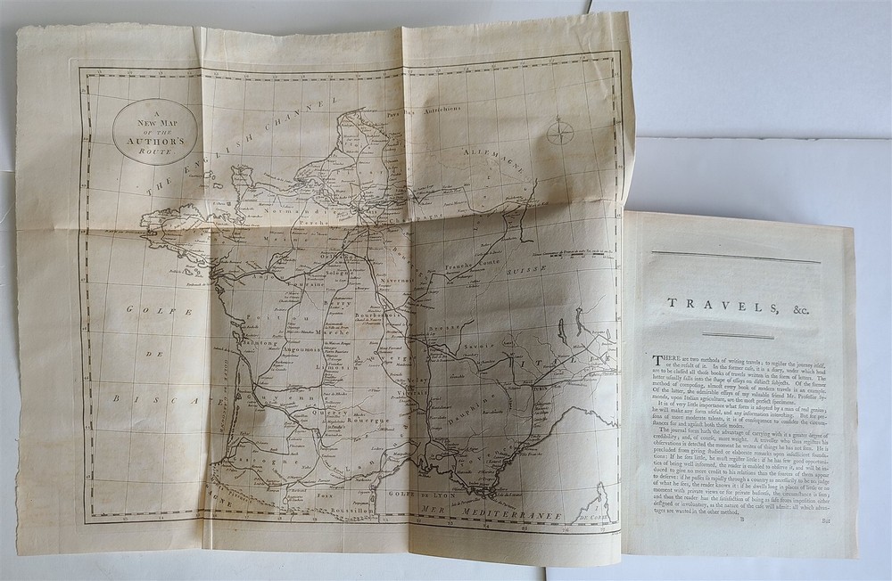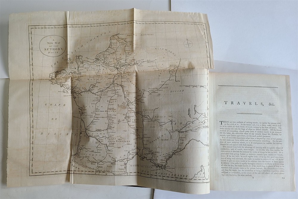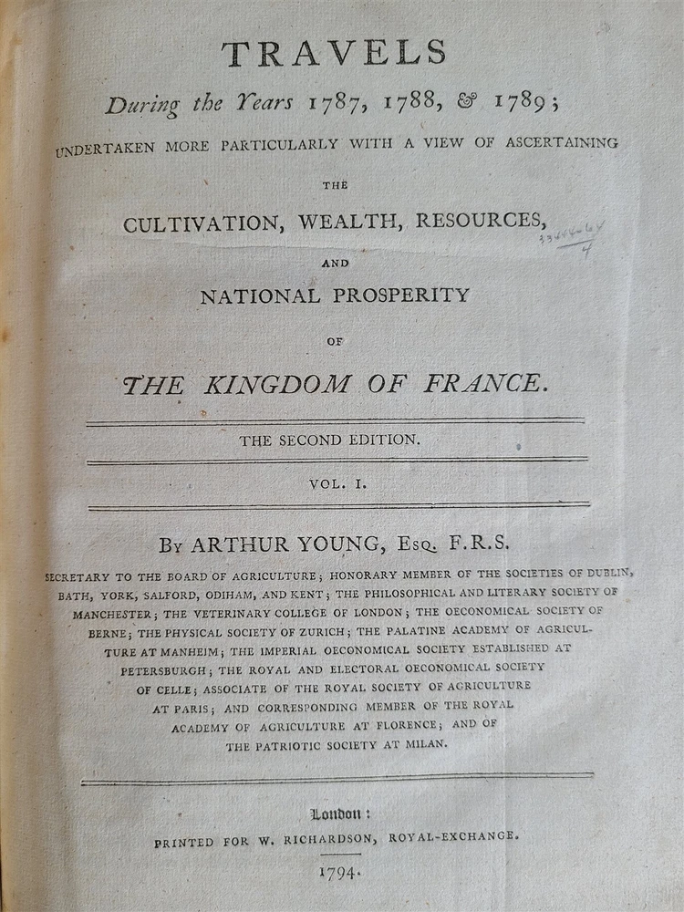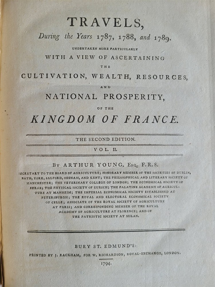 Young, Arthur Travels during the years 1787, 1788, & 1789; undertaken more particularly with a view of ascertaining the cultivation, wealth, resources, and national prosperity of the Kingdom of France. W. Richardson, London, 1794 2 volumes, complete Size 8.5 by 11" (i)-viii, (1)-629, [3]; (ii), (1)-336, [4]pp., 3 folding maps of France Modern quarter dark maroon leatherette over purple patterned paper boards, same purple patterned endpapers. Top edge gilt. Good condition Text in English "Young's accounts of his travels are deservedly among the most famous that the century produced" -- Cox, V. 1, 161. Lowndes, 3020; Goldsmiths 15937; Kress B.2872. ============================== Refund Policy: We will issue a FULL REFUND, 100% money back if you are not satisfied with your purchase. Items must be returned to us within 20 days in order to receive a refund or replacement. Buyer is responsible for the shipping costs. Powered by SixBit's eCommerce Solution