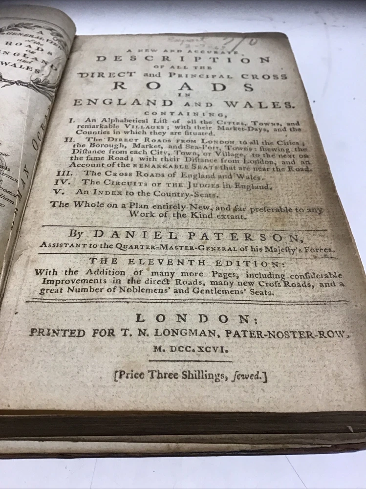 A New and Accurate Description of all the Direct and Principal Cross Roads in England and Wales. Containing, I. An Alphabetical List of all the Cities, Towns, remarkable Villages, etc.; II. The Direct Route from London to all the Cities, etc.; III. The Cross Roads of England and Wales; IV. The Circuits of the Judges in England ; V. An Index to the Country Seats; PATERSON, Daniel. Published by T. N. Longman. London 1796 1796 Book 2 Maps Description of all the Principal Cross Roads in England & Wales 228 years old. Size 4.5/8” x 7” Maps - Roads of England and Wales and Map of Hertfordshire which was tucked in front of book. Covers are attached but loose and opening page has tear and some loose pages as pictured. Keep in mind the shipping price also covers handling fees, packaging materials & time, not just postage. See our eBay store for thousands of our other items. B12D