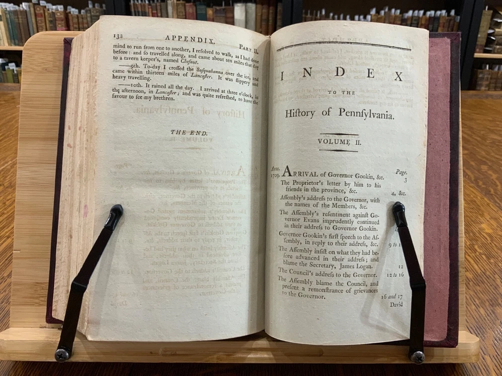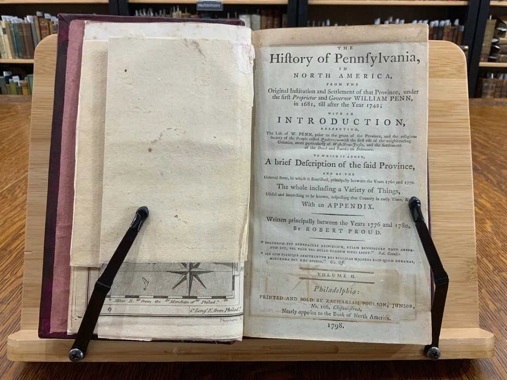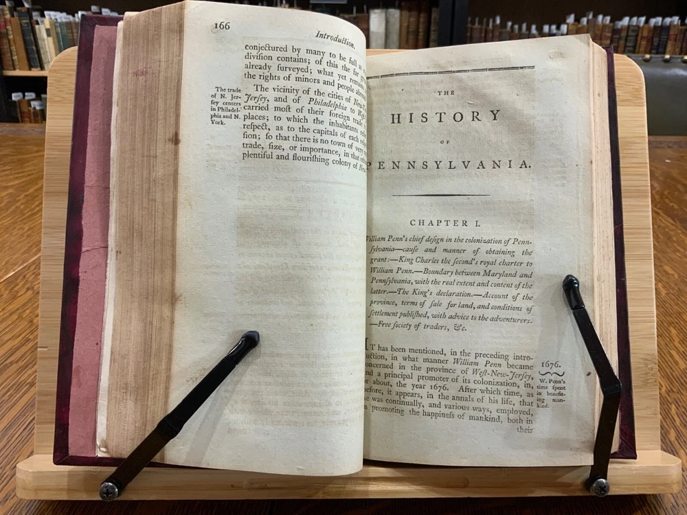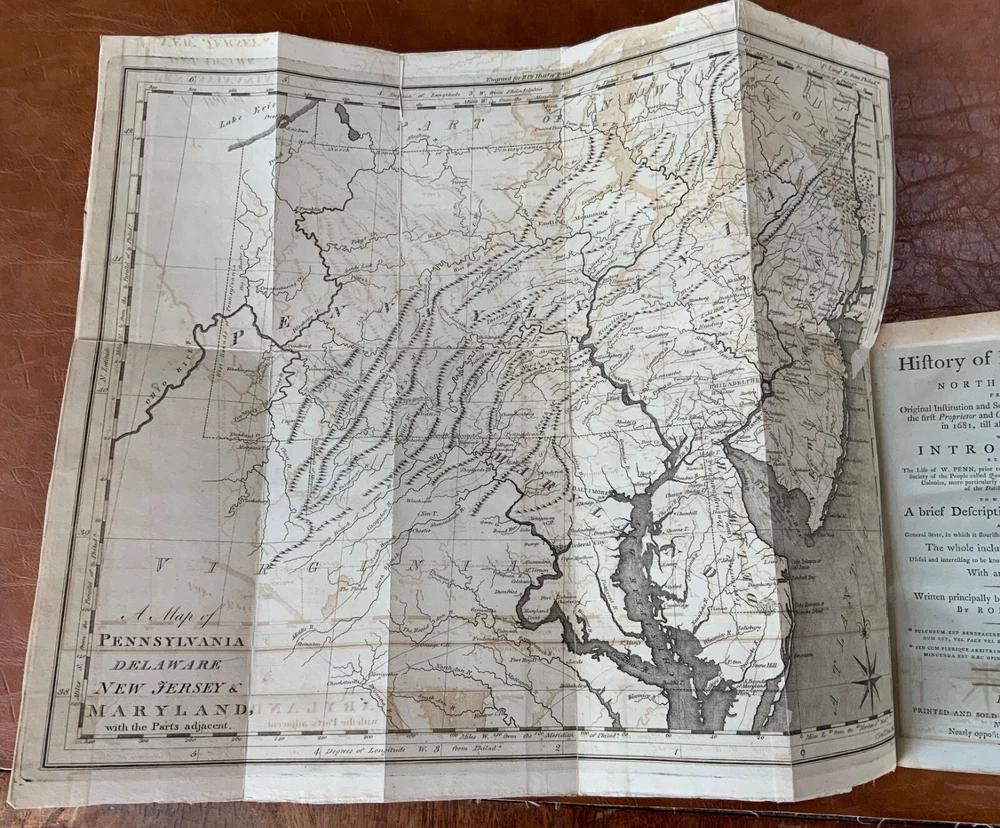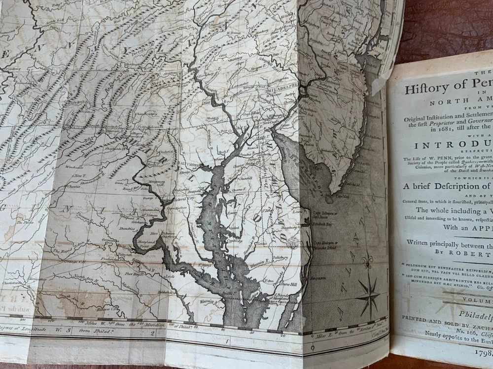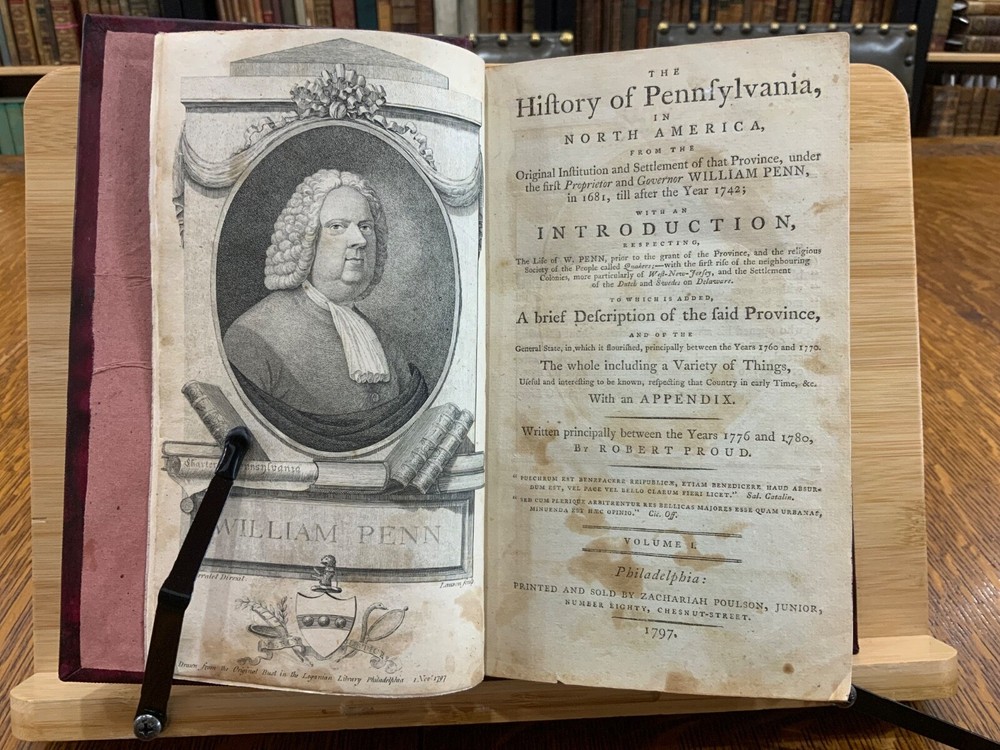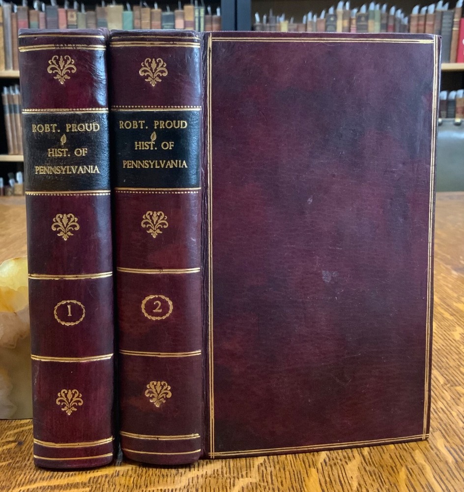 The History of Pennsylvania, in North America from the Original Institution and Settlement of that Province, under the fist Proprietor and Governor William Penn, in 1681 till after the Year 1742; with an Introduction, Respecting, The Life of W. Penn, Prior to the grant of The Province and the religious Society of the People called Quakers; with the first rise of the neighbouring Colonies, more particularly of West-New-Jersey, and the Settlement of the Dutch and Swedes on Delaware. To which is added a brief Description the Said Province and of the General State in which it flourished principally between the years 1760 and 1770. The whole including a variety of things, useful and Interesting to be known, respecting that country in early time, &c. With an Appendix. Written principally between the Years 1776 and 1780 by Robert Proud. Philadelphia: Printed and Sold by Zachariah Paulson, Junior, Vol. I: Frontispiece of William Penn, 1797, 508 p; Vol. II: Fold-out map of Pennsylvania, 1798, 373 p + 149 p Appendices. FIRST EDITION, COMPLETE SET! Full leather contemporary bindings measure 8.25 x 5", 8vo. In fair condition. Modern binding very lightly scuffed at edges and corners, but otherwise clean and intact. Previous old-hand ownership signature, in ink, found on recto of frontispiece dated 1799. Title page of Vol. I loosening at tail of gutter. Off-setting on title page of Vol. I from frontispiece. Fold-out map in Vol. II normally toned & soiled at hinges with some tearing near attachment point to text-block. Text-block normally toned with age-staining in preliminaries. Contemporary bindings tight and intact. Please see photos and ask questions, if any, before purchasing. Robert Proud (1728–1813) was an English educator, Quaker and historian known for his research and writing about the Province of Pennsylvania (also known as the Pennsylvania Colony). Dubbed "Pennsylvania's first historian", Proud was a Loyalist during the American Revolution, and completed much of his writing while living in poverty. Shortly after arriving in the Province of Pennsylvania (also known as the Pennsylvania Colony), he settled in Philadelphia , where he launched a private school for boys dedicated to the instruction of Latin. When that school failed two years later, he was hired to teach at The Friends School in September 1761. Also known as The Friends Academy, The Public School or the Penn Charter School, it is known today as the Friends Select School. He ultimately rose to the level of master teacher. He was elected to the revived American Philosophical Society in 1768. First Edition, Complete Set. RAREA1797ORSA - 03/19 RAREA1797ROQB - 05/25 - HKREV840